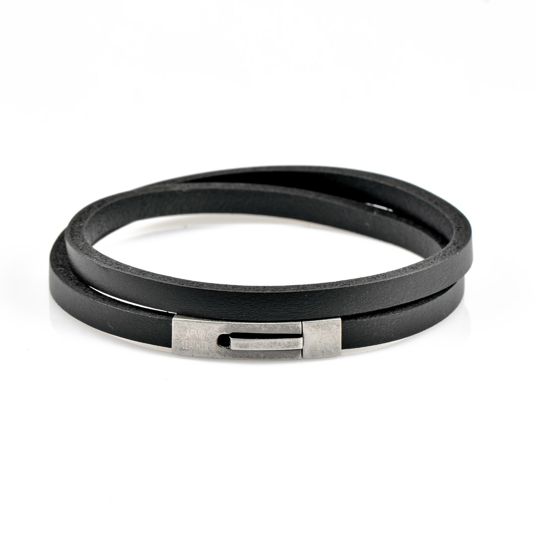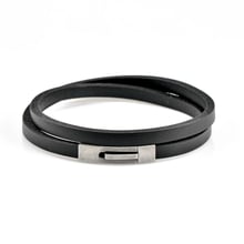This sleek black leather bracelet features a stylish double wrap design for a modern and sophisticated look. The gunmetal steel clasp adds a touch of industrial style, while the adjustable design ensures a comfortable fit for any wrist size. The simple yet elegant design makes it a versatile accessory that can be dressed up or down. This bracelet is not only fashionable but also durable, making it a great addition to your jewellery collection.