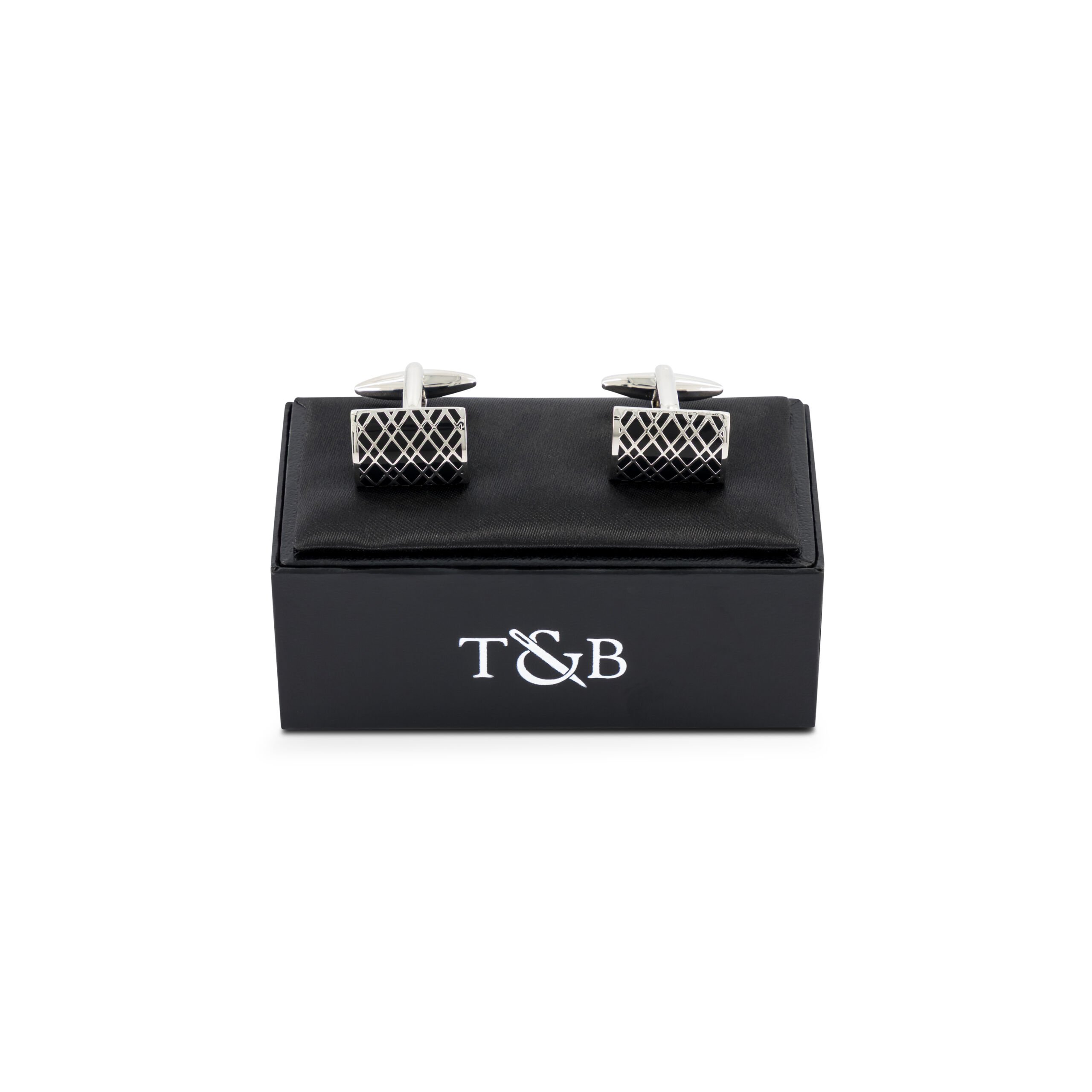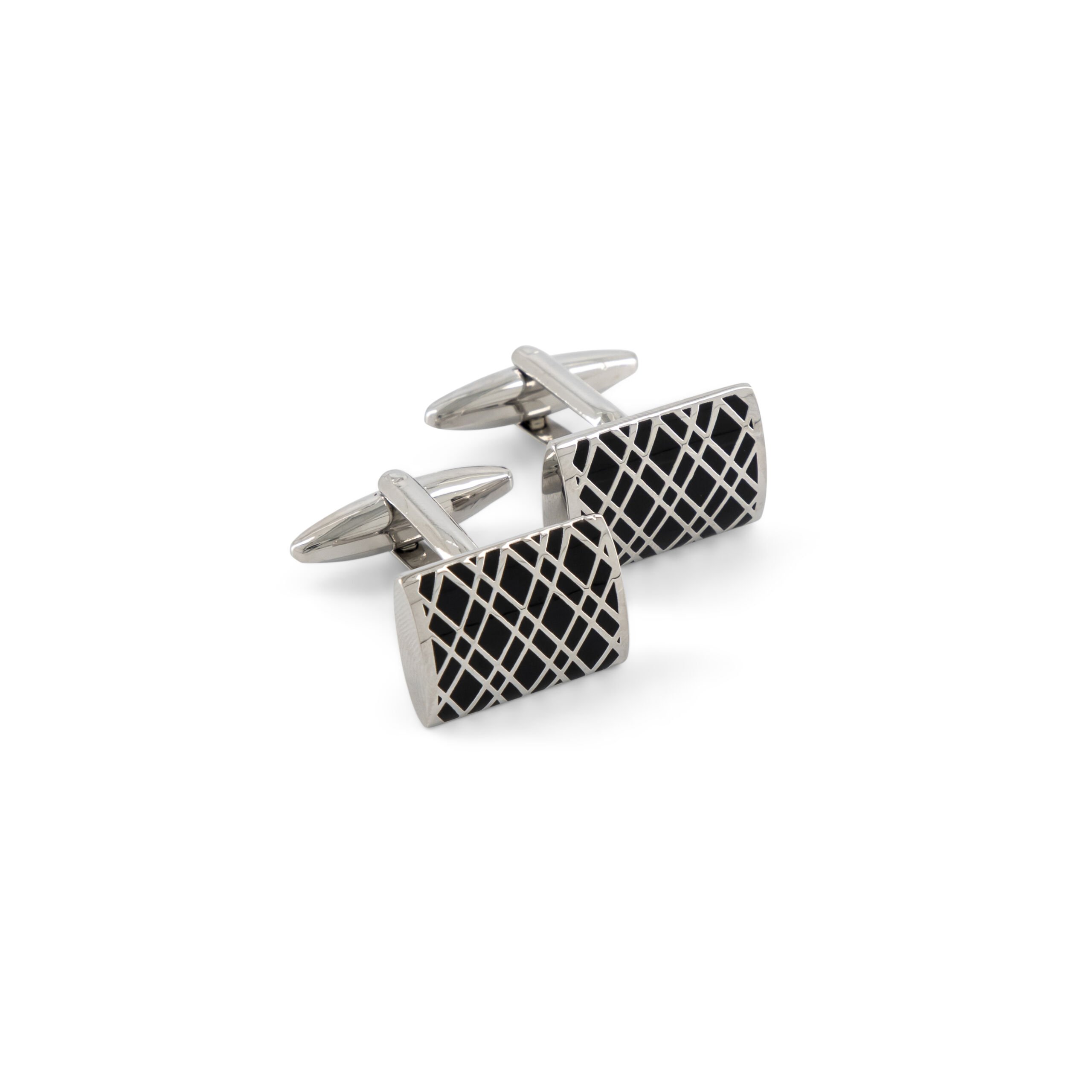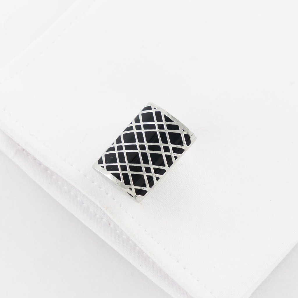 Refine your formal attire with these striking Black Enamel Rectangular Cufflinks with Silver Strand Accents. Expertly crafted from rhodium-plated alloy, these cufflinks feature a sophisticated black enamel face adorned with intricate silver strands, creating a perfect balance of contemporary elegance and timeless style. The sturdy bullet clips ensure a reliable fit for any distinguished occasion, while the option for personalized engraving adds a bespoke element. Presented in a premium gift box, these cufflinks are an exceptional addition to any gentleman’s collection.