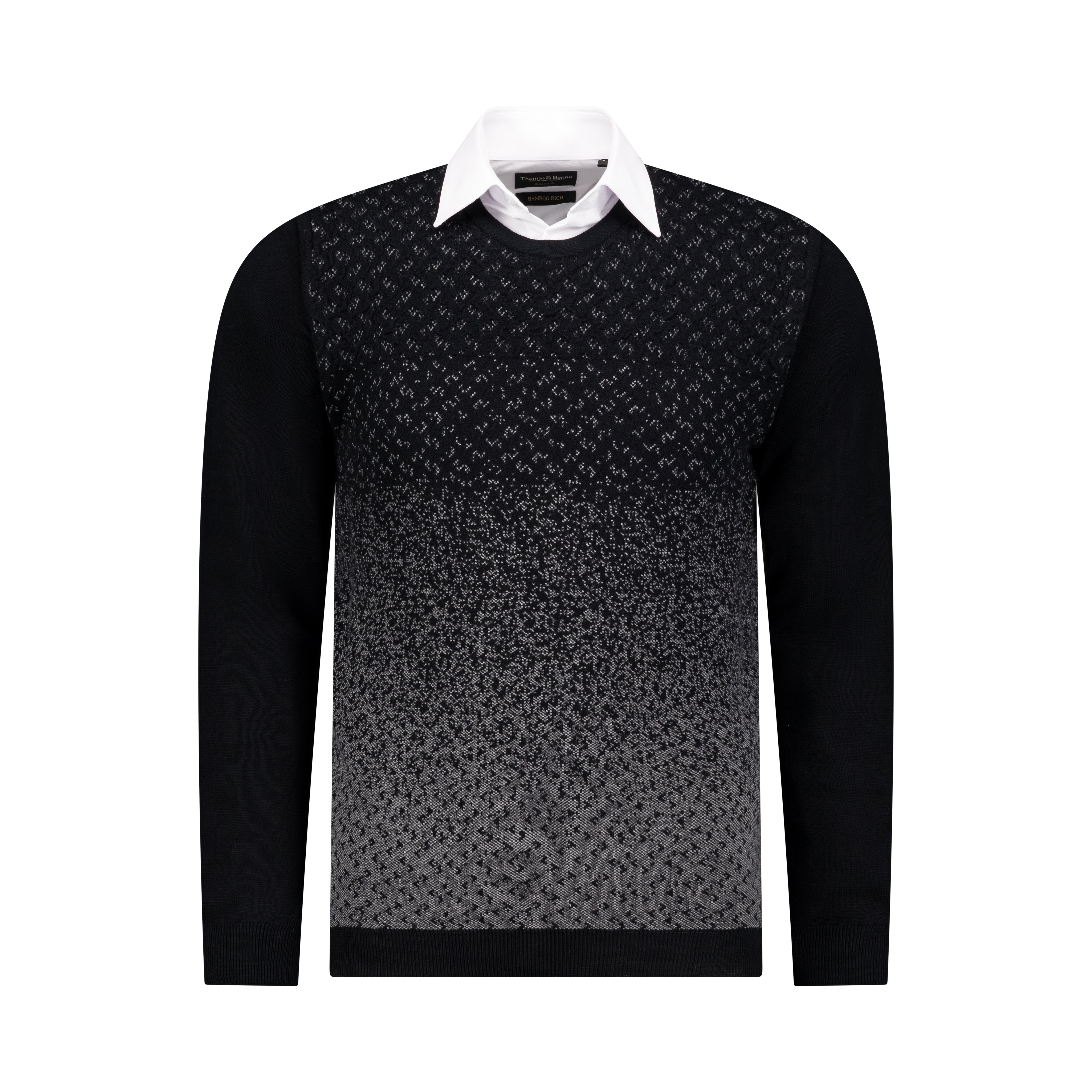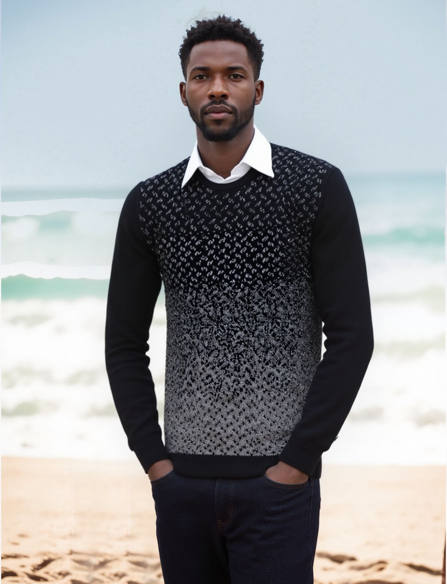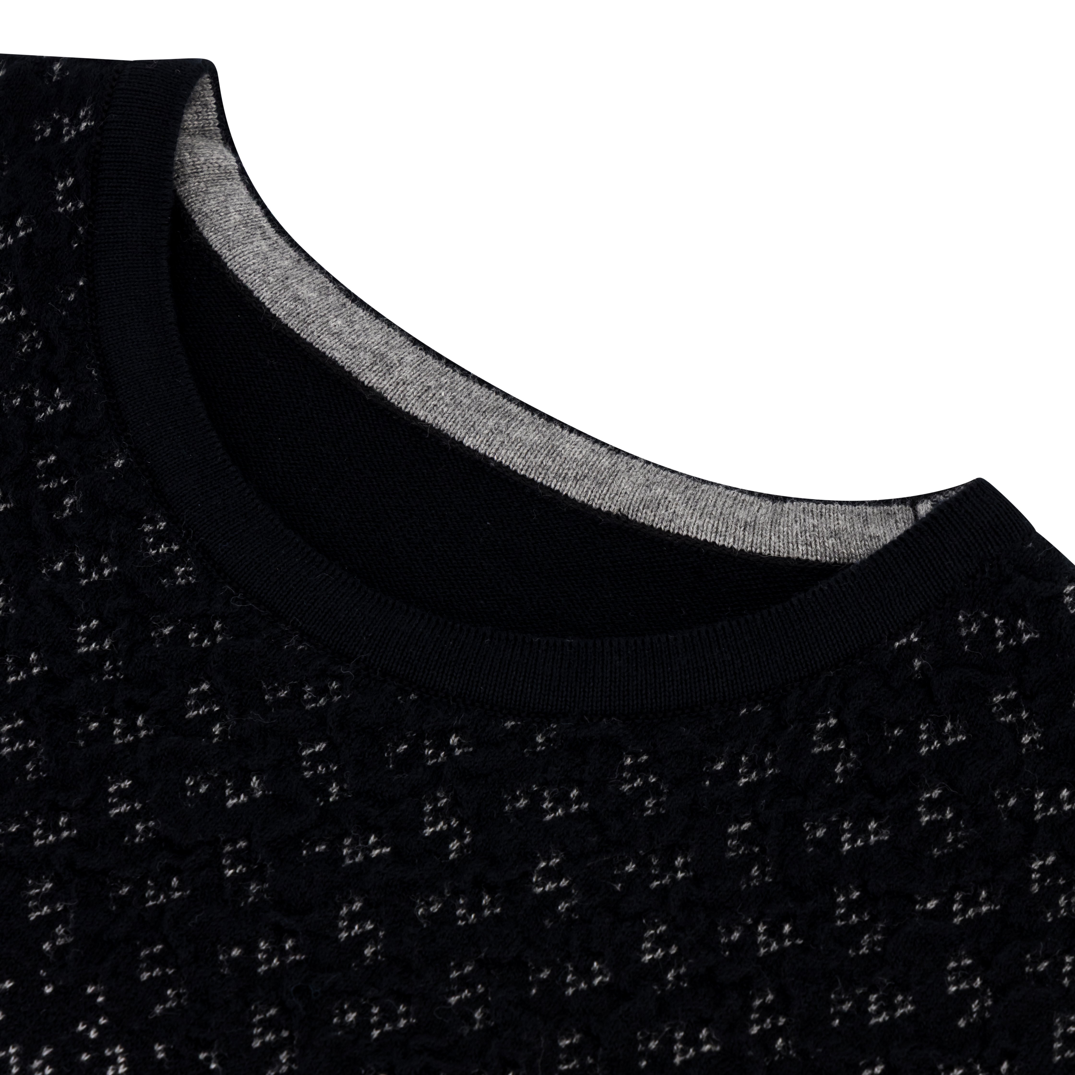 This black cotton knit jersey offers a refined take on casual wear, featuring a lightweight construction and a distinctive stippled design that transitions from sparse to dense white flecks. The soft ribbed crew neck adds a touch of structure, while the breathable cotton knit ensures comfort throughout the day. Designed for versatility, it pairs effortlessly with both smart and relaxed ensembles.