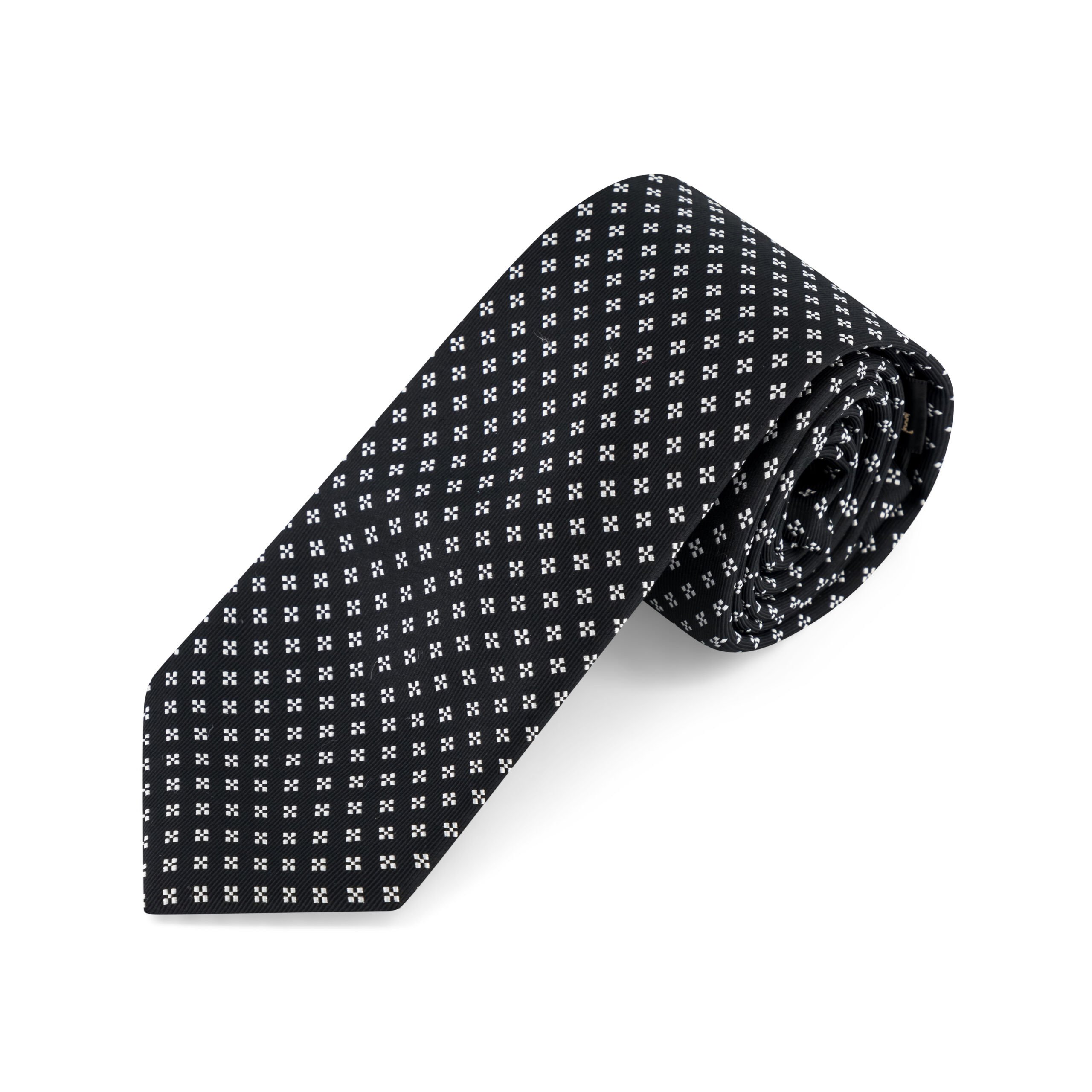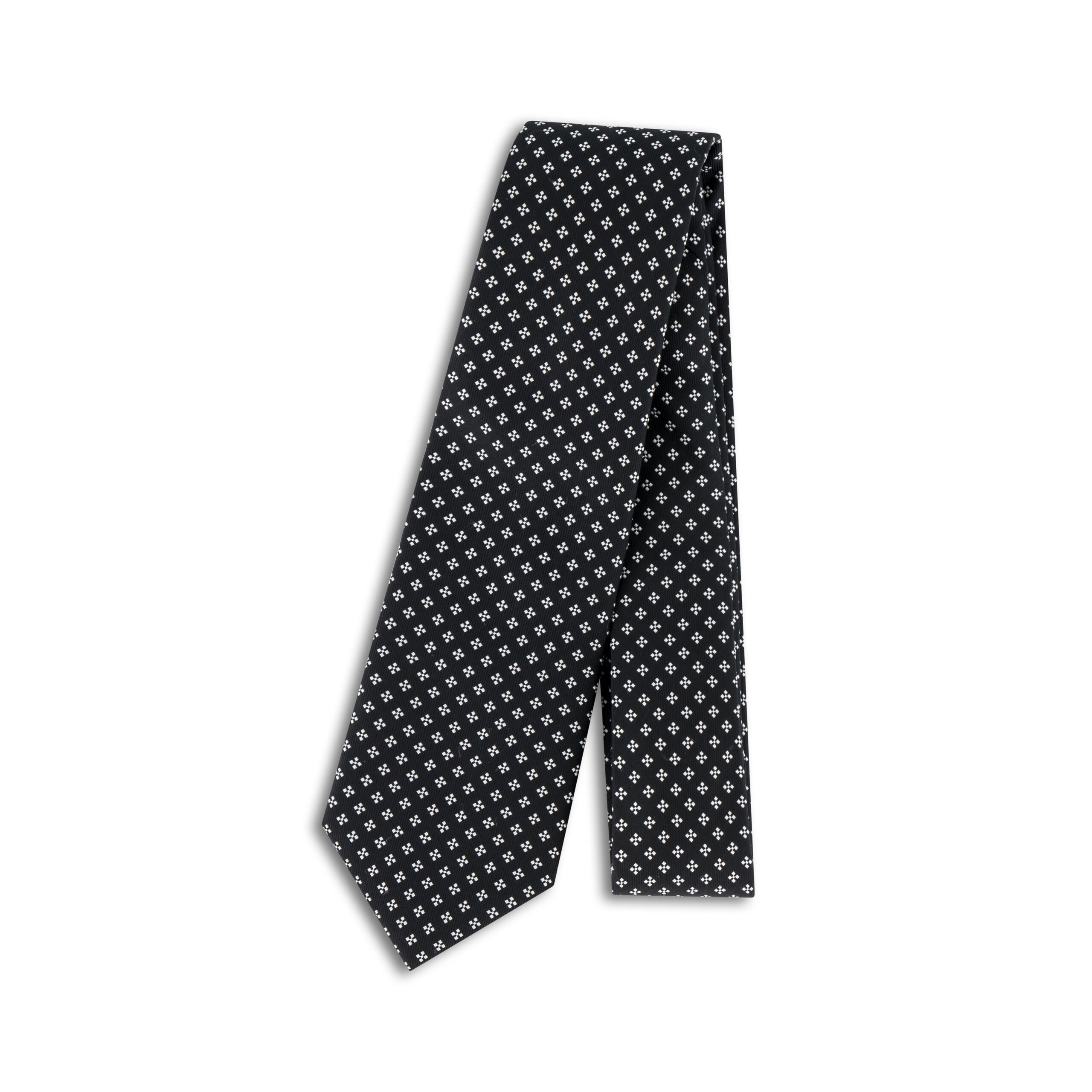 Elevate your formal attire with the Black Silk Geometric Star Tie with White Accents, a refined accessory that blends classic elegance with modern flair. Crafted from 100% premium silk, this tie features a deep black foundation accented by a striking white geometric star pattern, offering a bold yet understated contrast that commands attention. Its 7.5 cm width provides a sleek, timeless profile, while the 150 cm length ensures adaptability across a variety of knotting options. Ideal for upscale events or to enhance your professional wardrobe, this tie exudes luxury and meticulous craftsmanship. Dry clean only to preserve its sharp design and silky lustre, making it a lasting staple for the discerning gentleman.