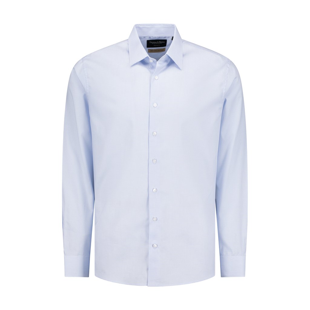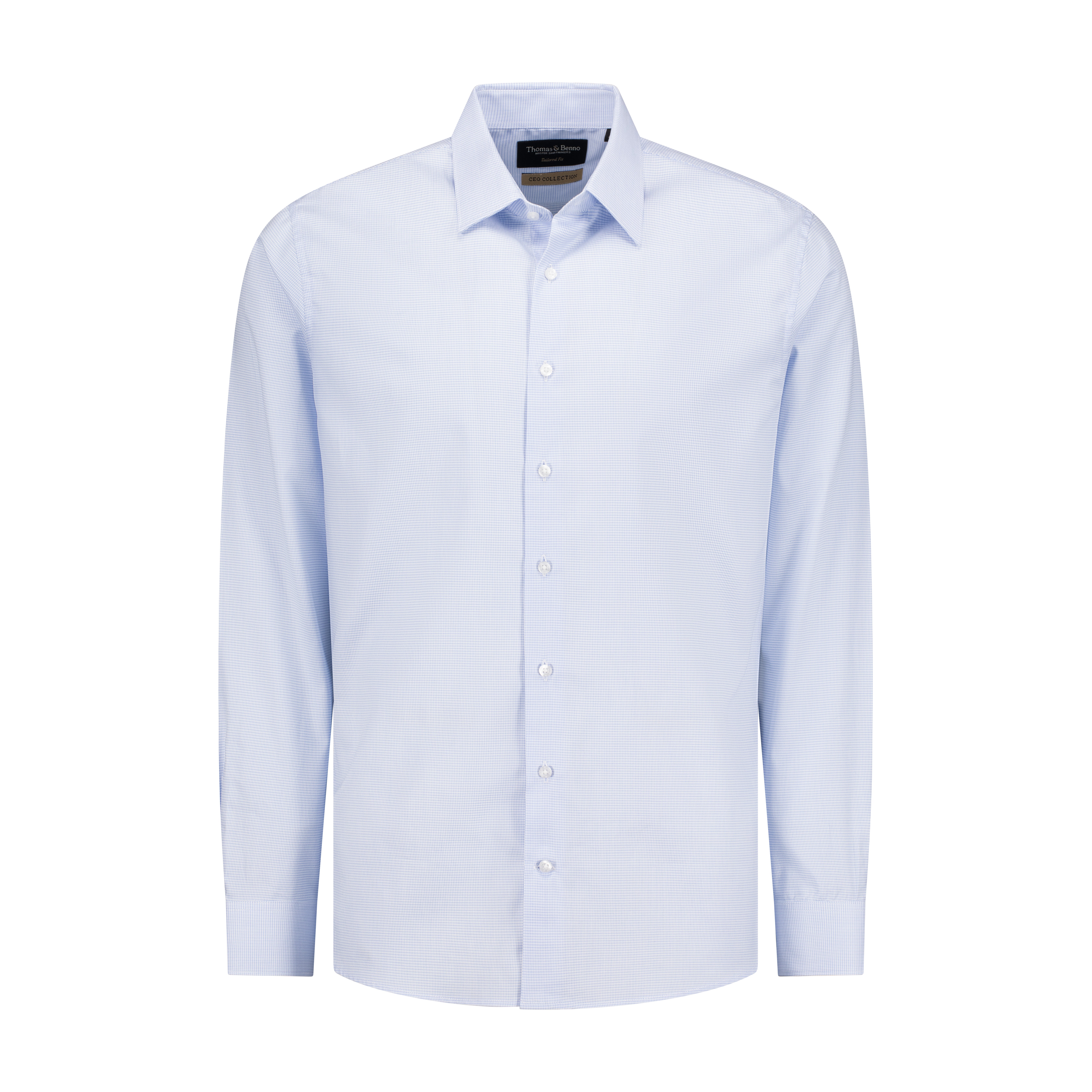 Crafted for the modern professional, this Thomas & Benno CEO Collection shirt is a refined essential that elevates everyday dressing. The elegant blue mini grid pattern adds subtle texture and depth while maintaining a clean, executive aesthetic.