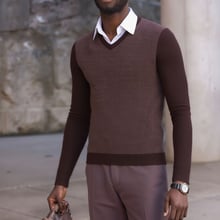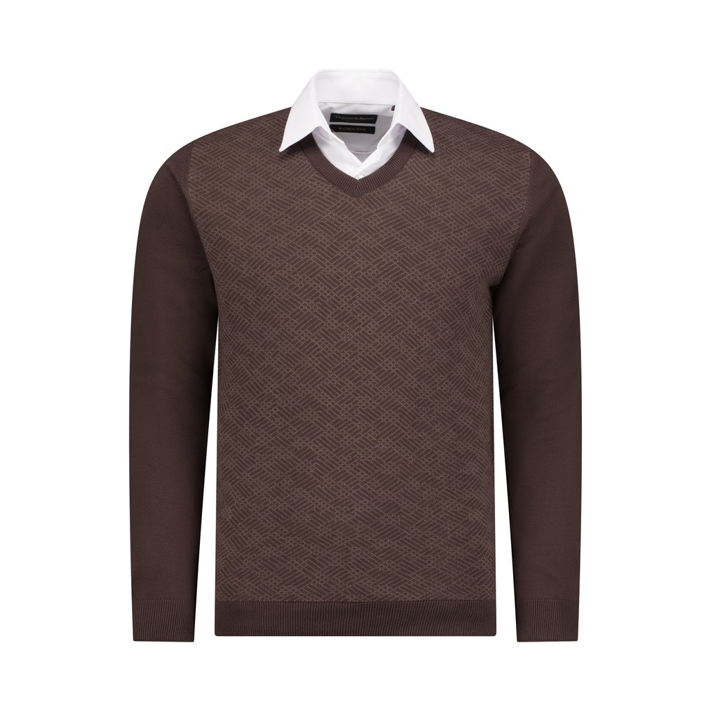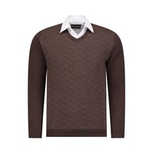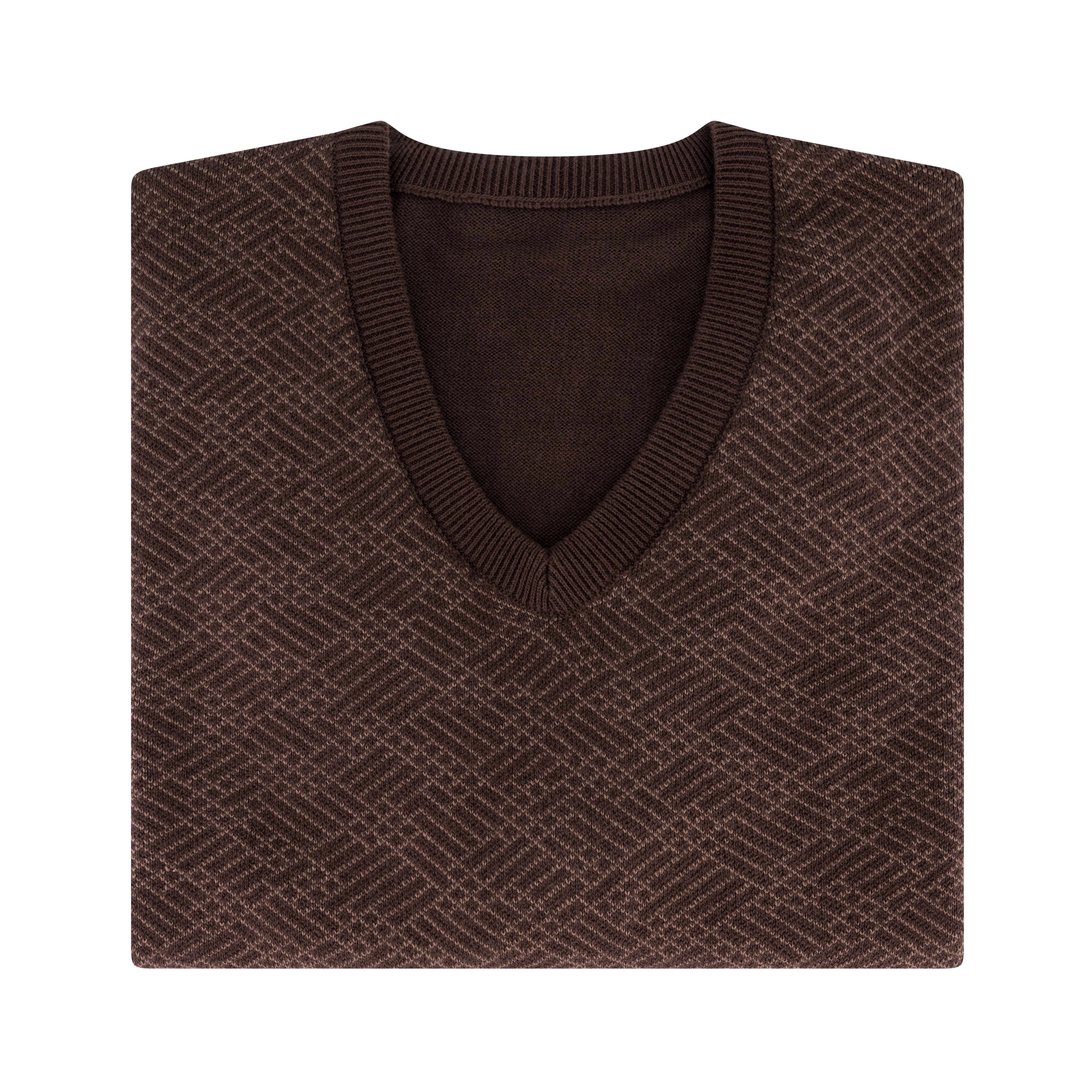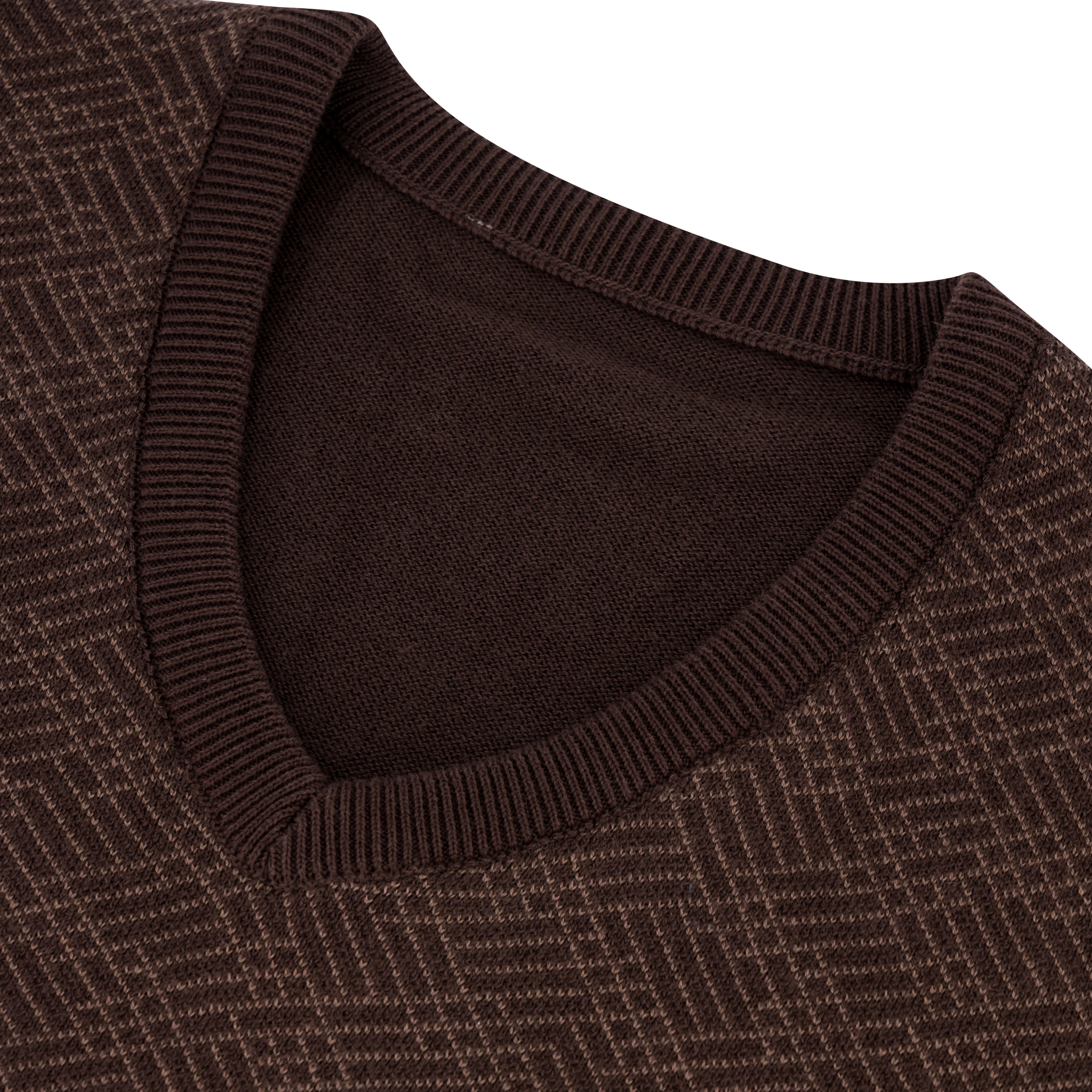 This brown V-neck jersey is crafted from 100% combed cotton, offering a smooth, breathable texture ideal for year-round wear. The front features a subtle yet distinctive tan cross-line woven design, adding visual interest to its classic silhouette. Finished with a ribbed neckline and lightweight knit, it’s a versatile piece that transitions effortlessly from smart-casual to refined everyday wear. Easy to care for, this jersey is machine washable at 30°C—just avoid tumble drying to preserve its shape and texture.