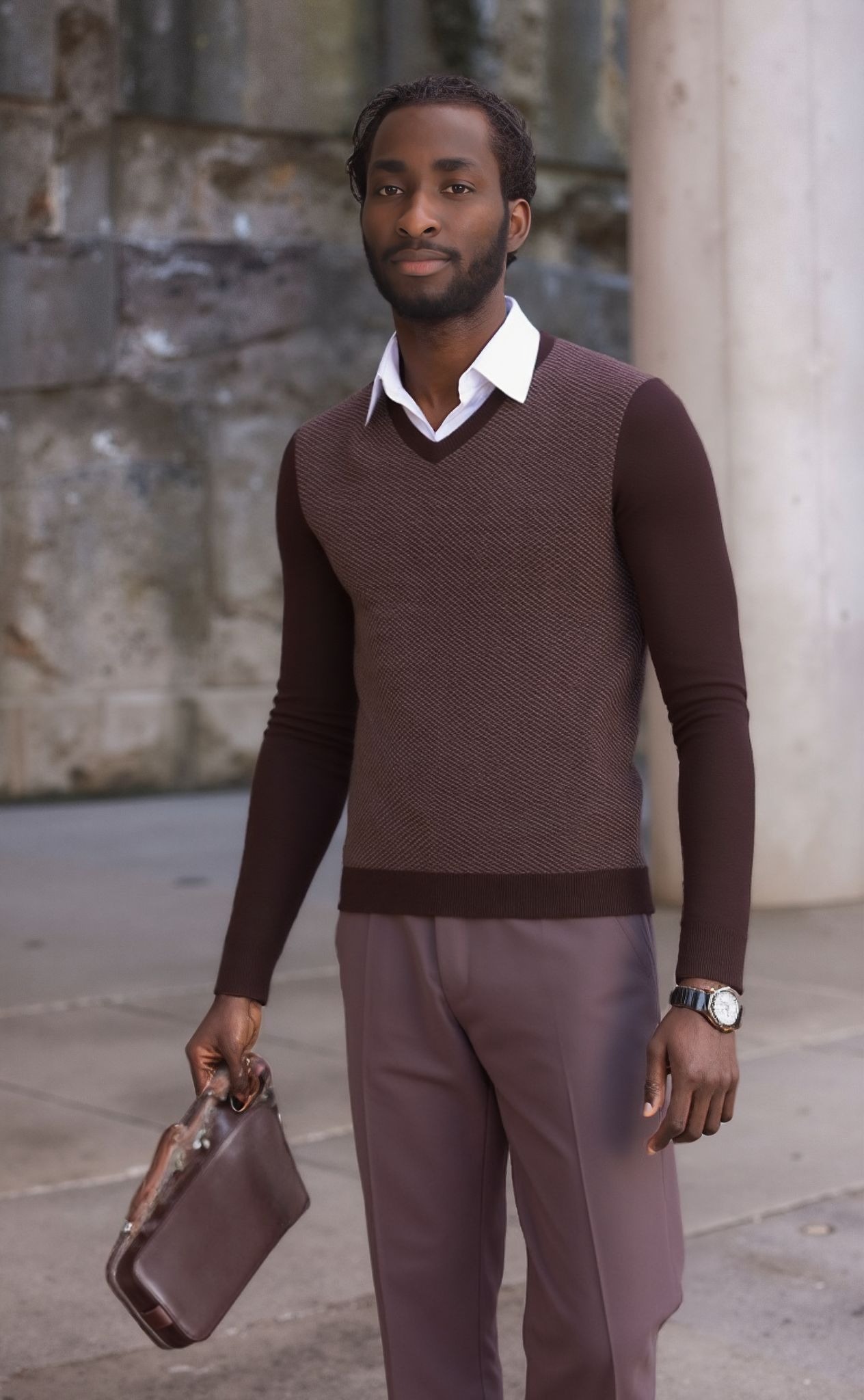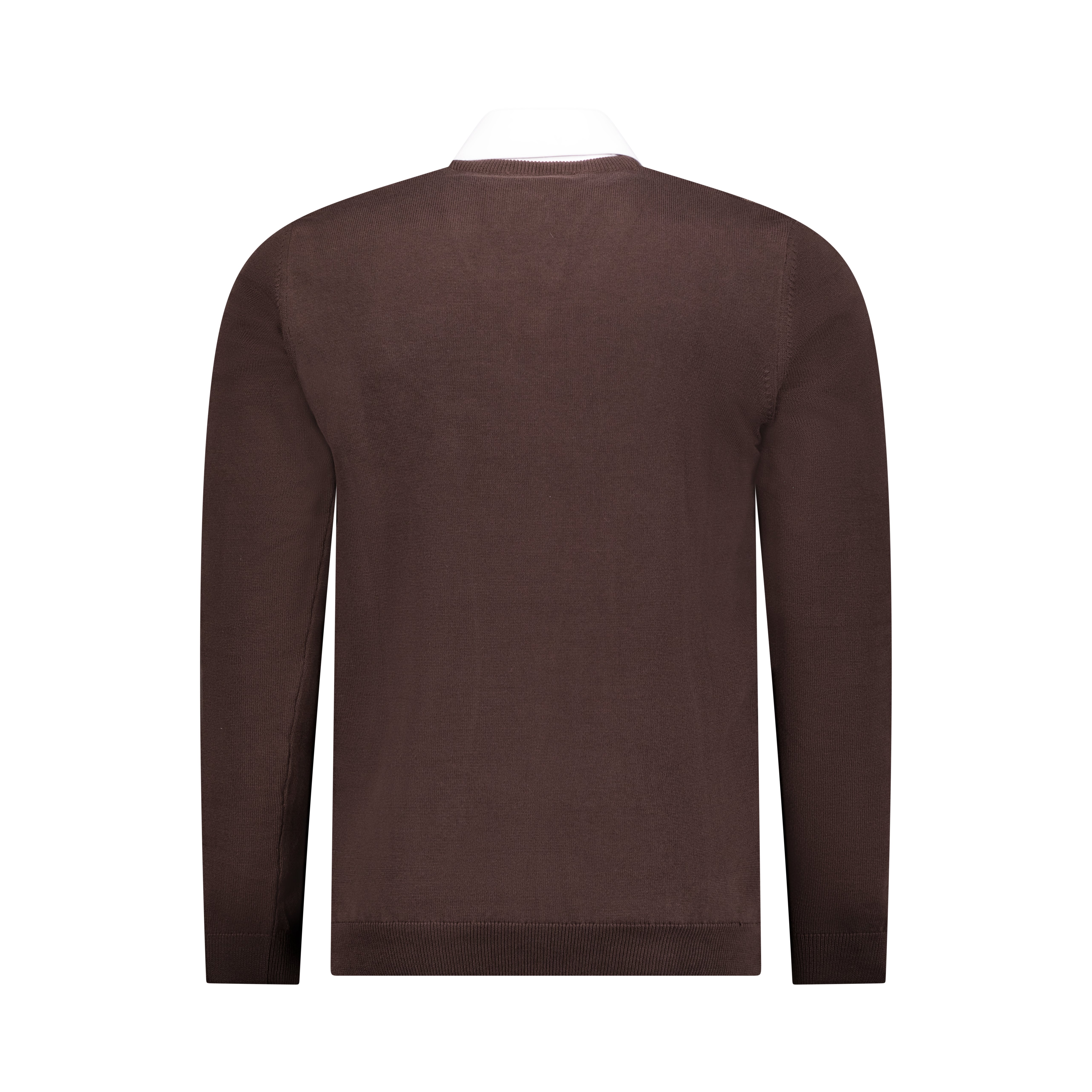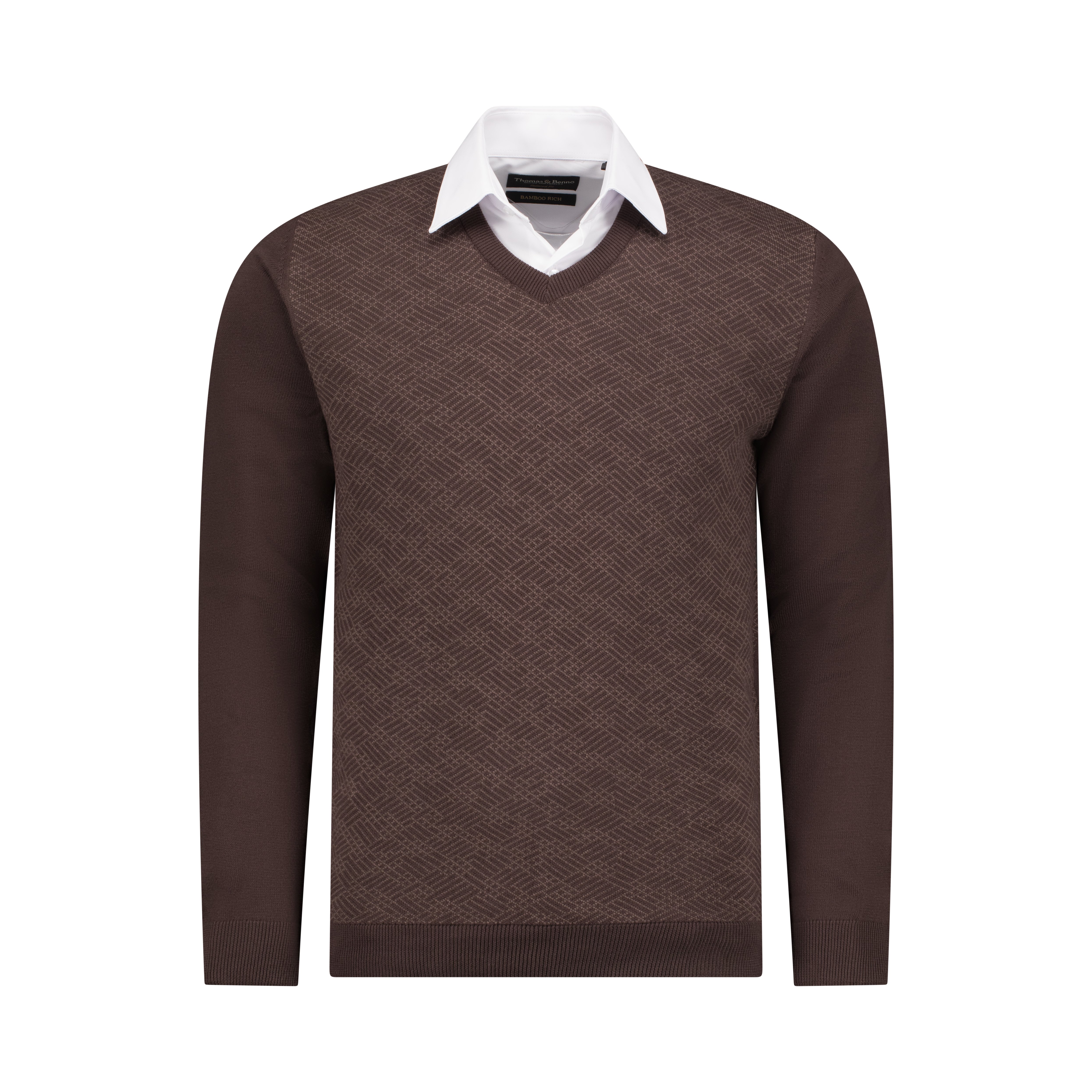 This brown V-neck jersey is crafted from 100% combed cotton, offering a smooth, breathable texture ideal for year-round wear. The front features a subtle yet distinctive tan cross-line woven design, adding visual interest to its classic silhouette. Finished with a ribbed neckline and lightweight knit, it’s a versatile piece that transitions effortlessly from smart-casual to refined everyday wear. Easy to care for, this jersey is machine washable at 30°C—just avoid tumble drying to preserve its shape and texture.