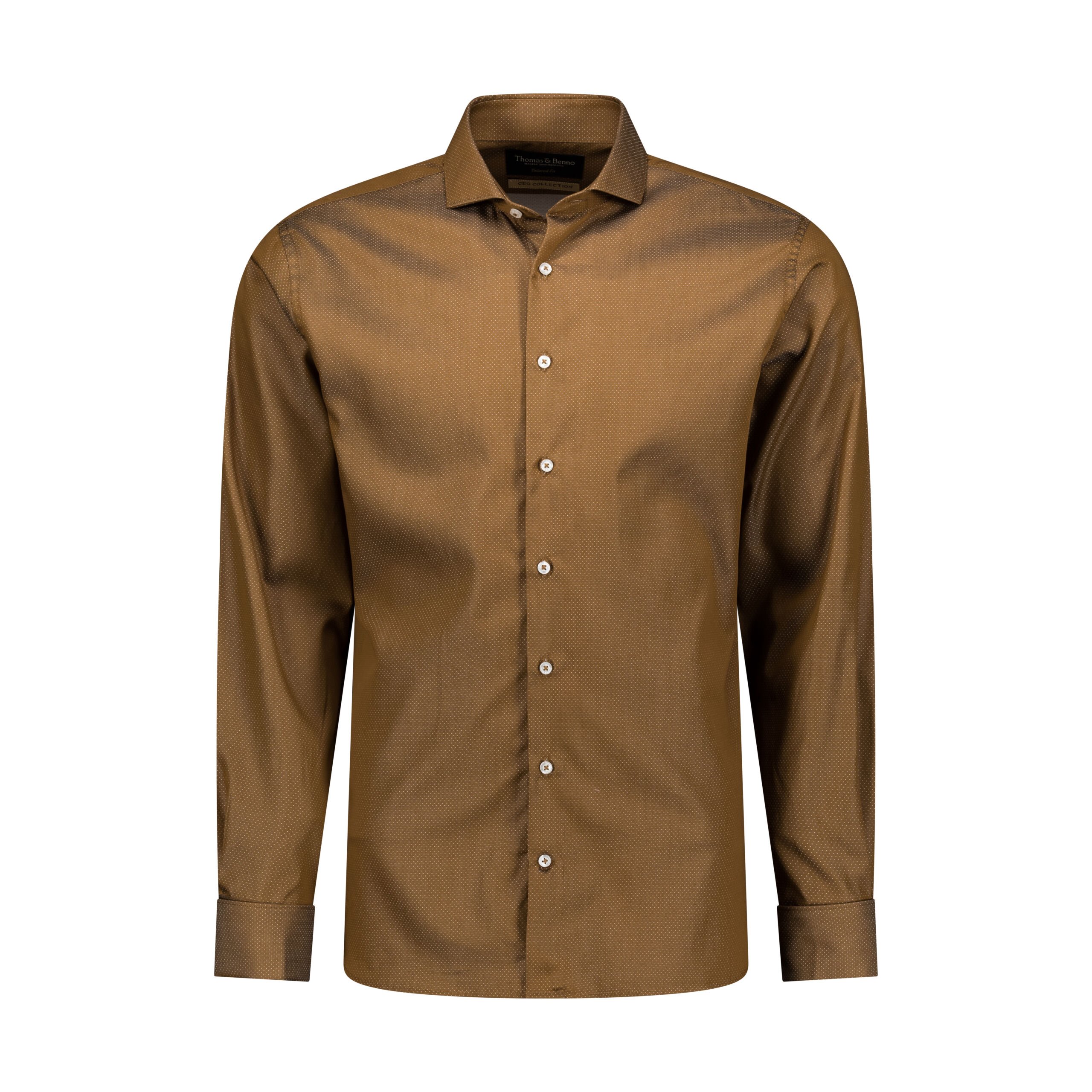 Introducing the CEO Collection Brown Pin-Dot Dress Shirt, a sophisticated fusion of classic design and modern precision. Woven from 120/2 100% cotton, this shirt delivers a refined texture and luxurious softness, elevated by a subtle white pin-dot pattern that adds understated distinction. The tailored fit, reinforced with side gussets, ensures a polished silhouette, while the full cutaway collar—complete with removable stays—offers versatility for both formal and professional settings. Finished with double cuffs and meticulous French side and arm seams, this machine-washable masterpiece (30°C, iron while damp) is designed for the discerning executive who commands attention with effortless grace.
