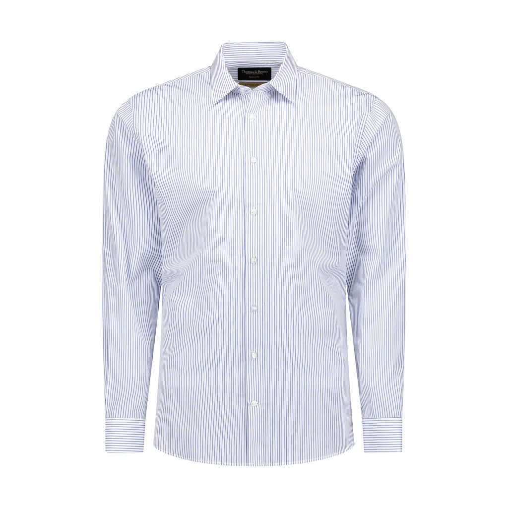 The CEO Collection Mid-Blue Chalk-Stripe Easy-Care Dress Shirt is a masterful blend of classic design and modern simplicity. Woven from 140/2 100% cotton with an easy-care treatment, this shirt showcases a mid-blue hue accented by bold chalk stripes, delivering a striking yet versatile aesthetic. Its tailored fit, reinforced by side gussets, ensures a flawless silhouette, while the semi-cutaway collar—complete with removable stays—adapts seamlessly to both formal and professional occasions. Finished with single cuffs and precise French side and arm seams, this machine-washable essential (30°C, iron while damp) offers the discerning gentleman impeccable style with minimal effort.