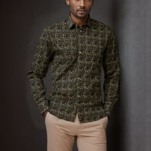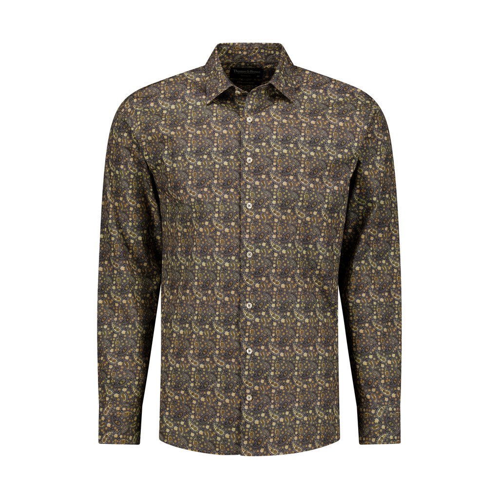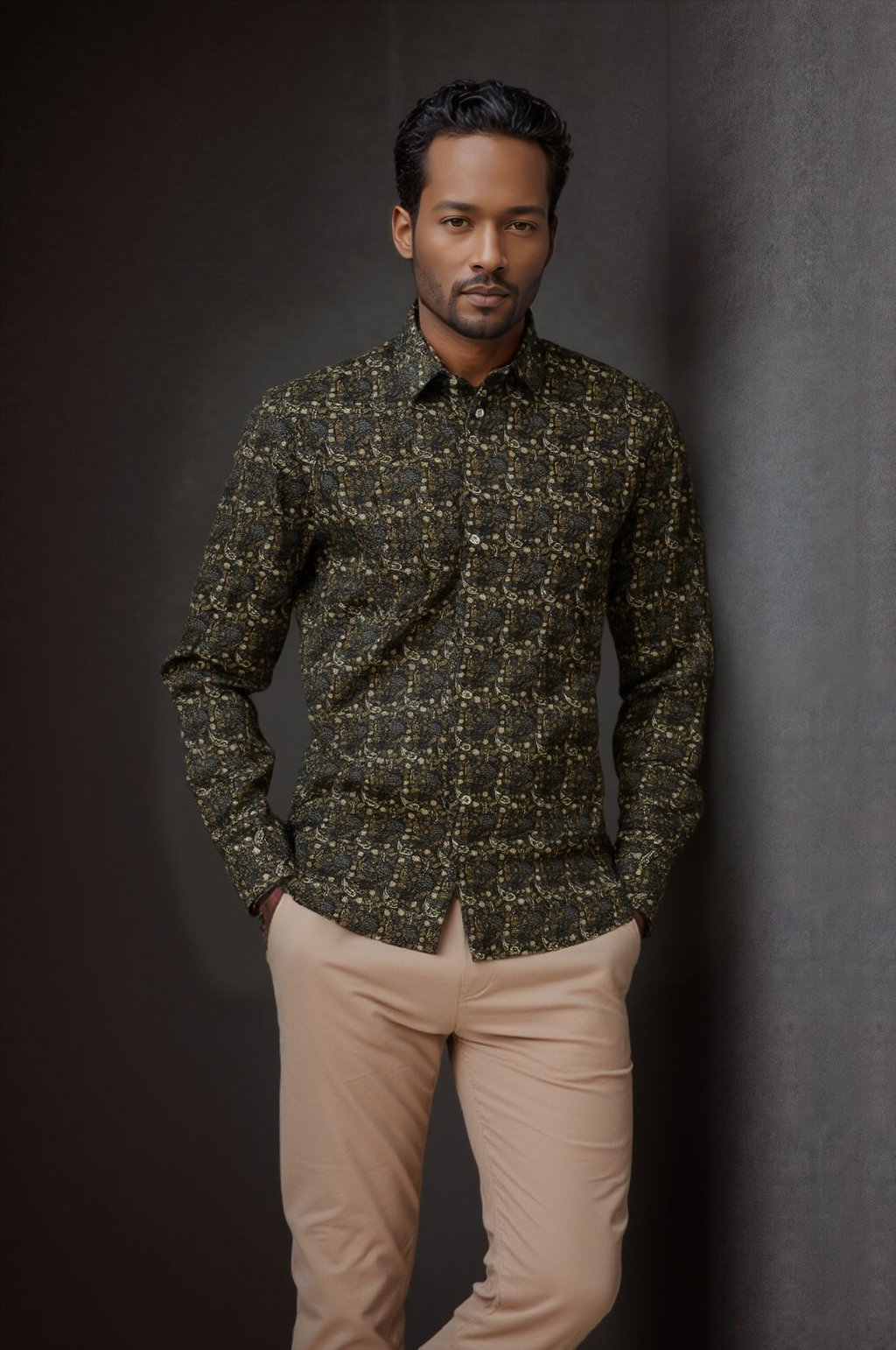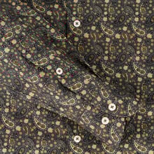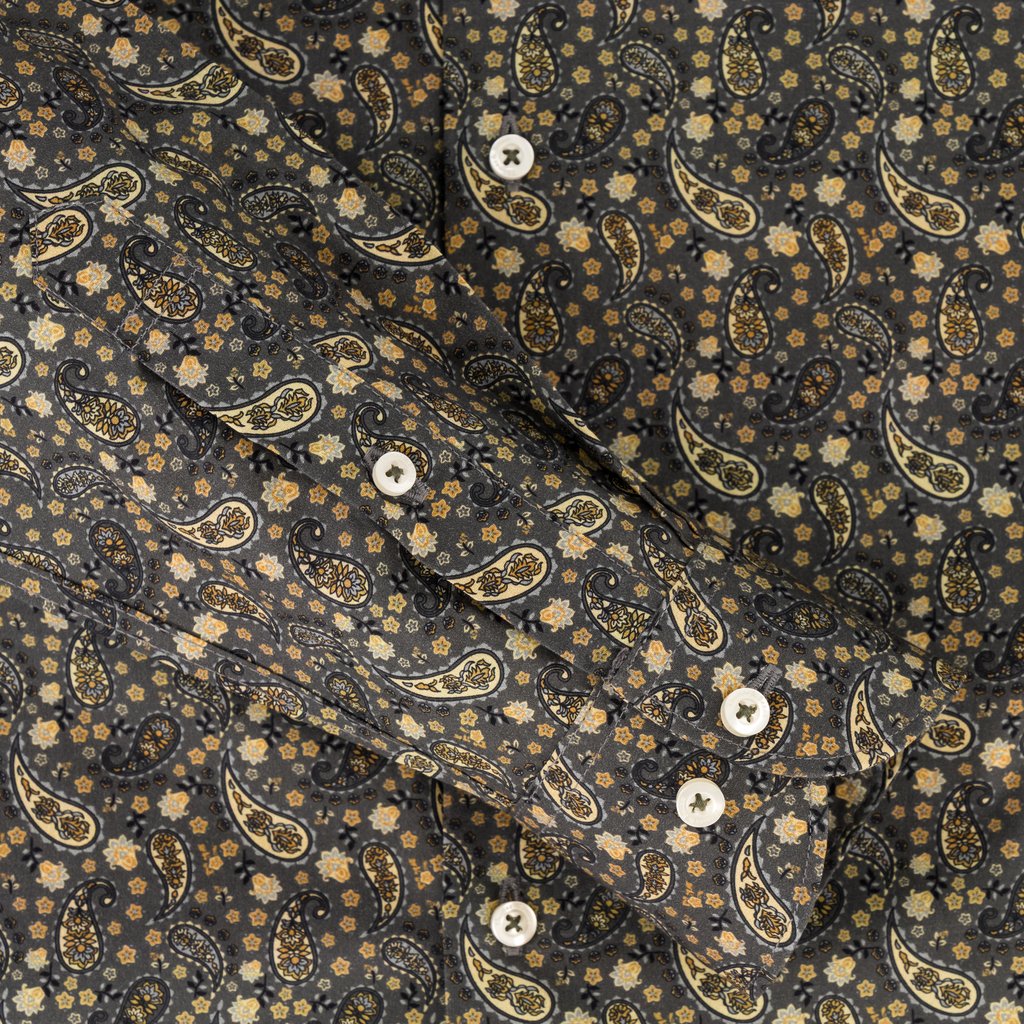 Its charcoal base adorned with intricate paisley and floral motifs in warm gold and beige tones creates a sophisticated, vintage-inspired style. Perfect for evening events, upscale casual outings, or adding flair to office wear, this shirt combines premium craftsmanship with timeless design.