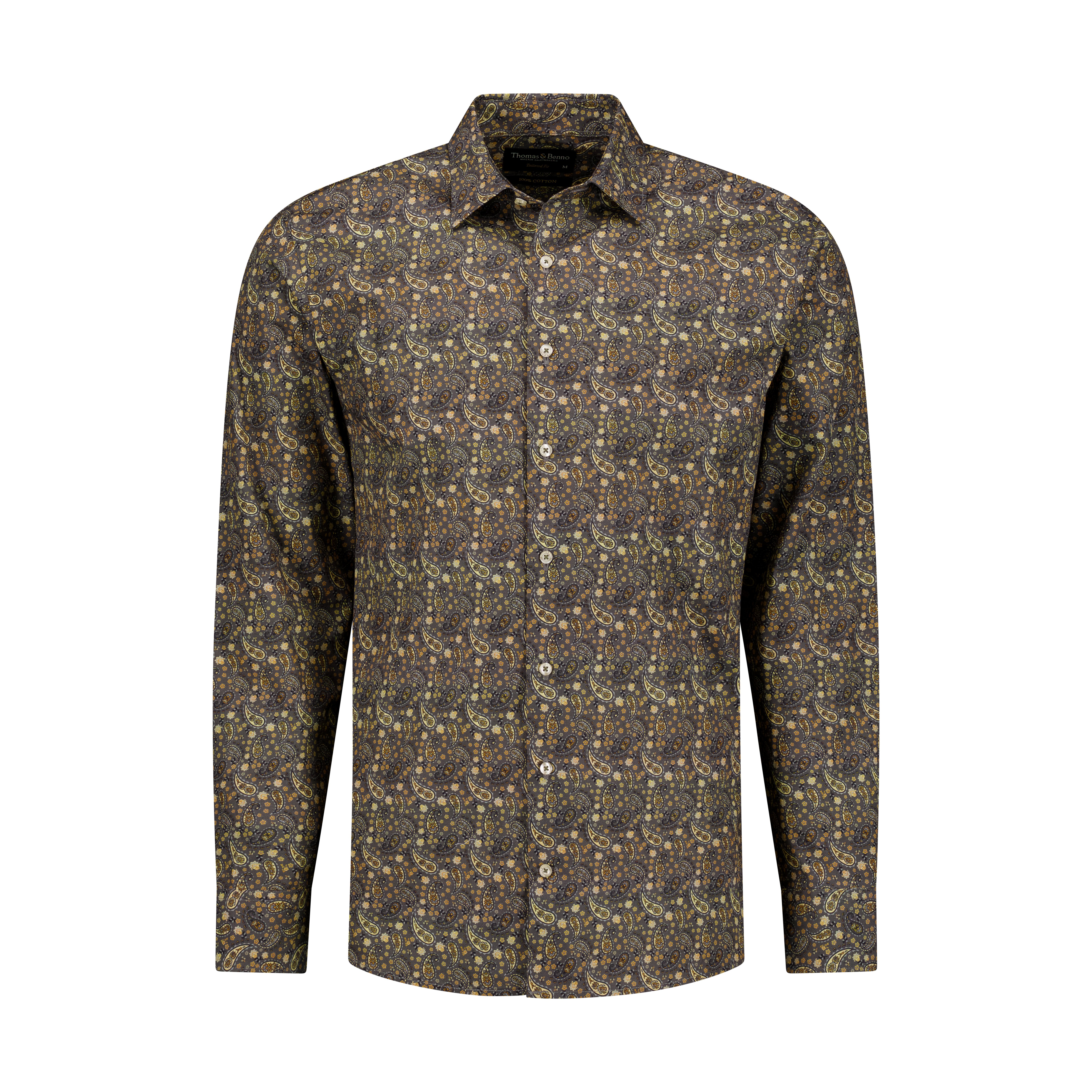 The Thomas & Benno Charcoal Paisley Print Shirt is a bold yet elegant choice for the modern wardrobe. Crafted from 100% cotton, it offers breathable comfort and a sleek tailored fit. The semi cutaway collar ensures versatility for both formal and smart-casual looks, while the single cuffs maintain a minimalist aesthetic.