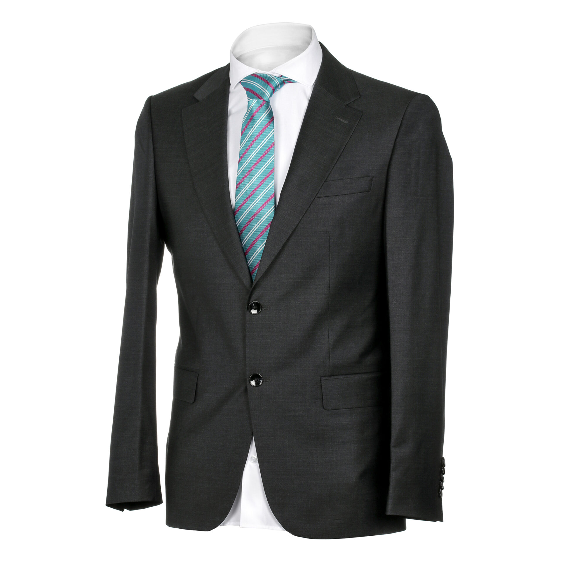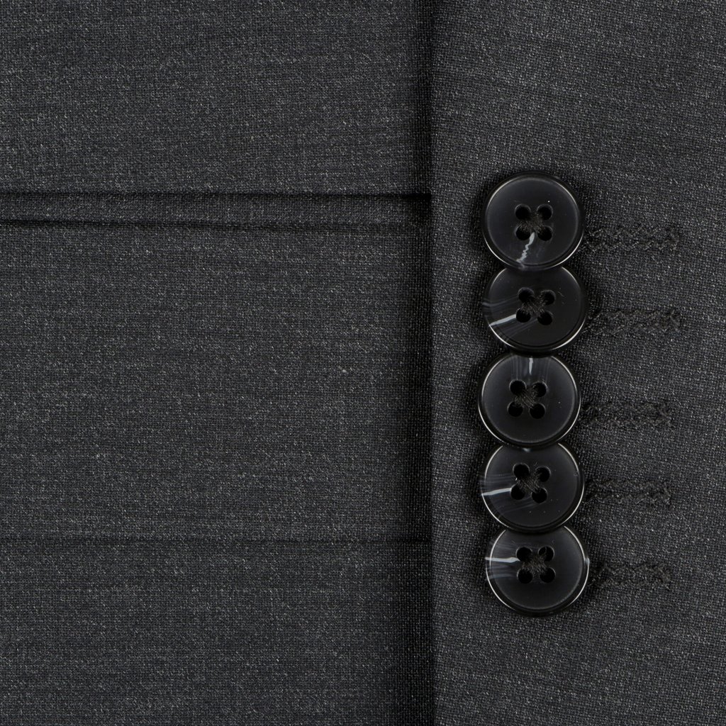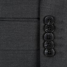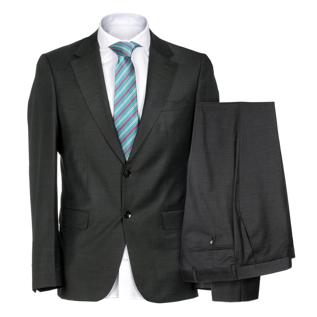 Step into sophistication with this charcoal suit crafted from a luxurious wool silk blend. Designed for a regular fit, this two-piece ensemble features a classic two-button closure and double vent for added style and comfort. Elevate your formal wardrobe with this timeless piece.