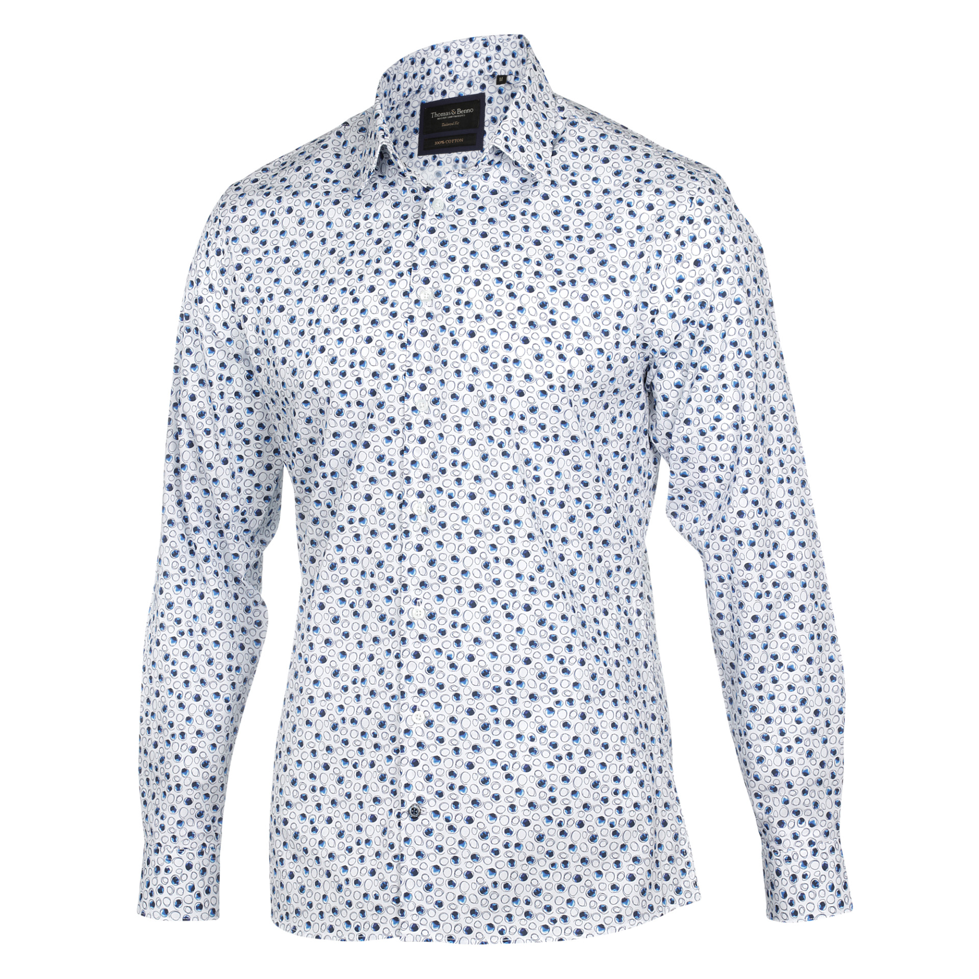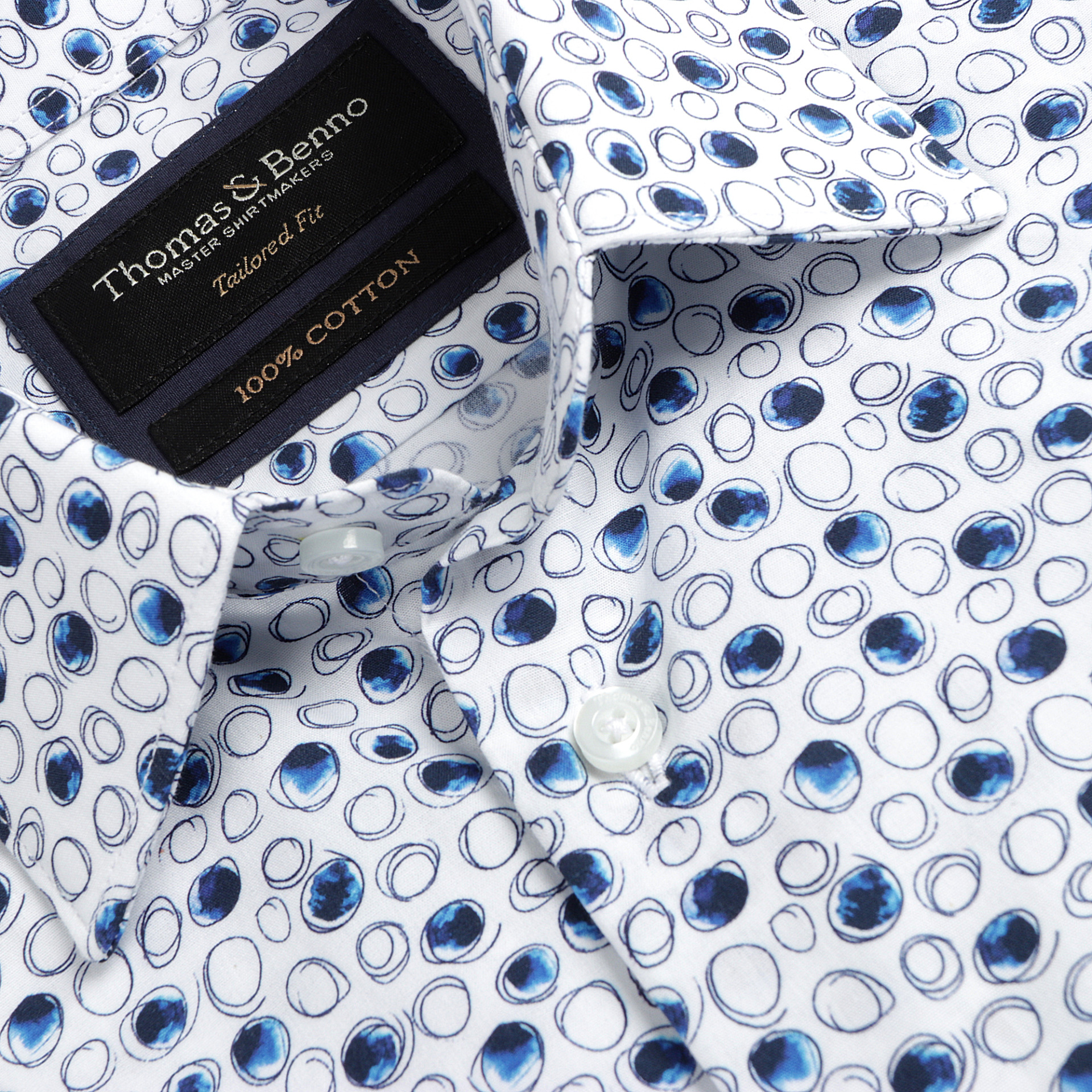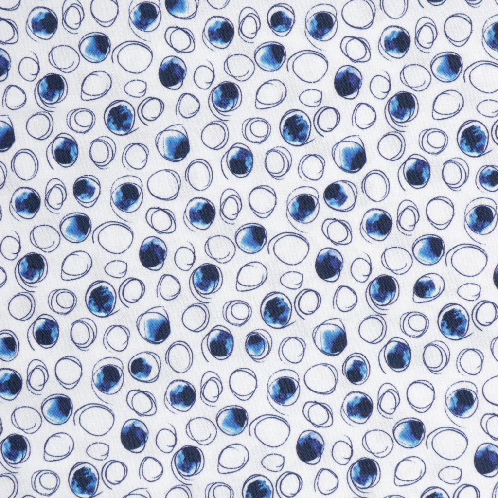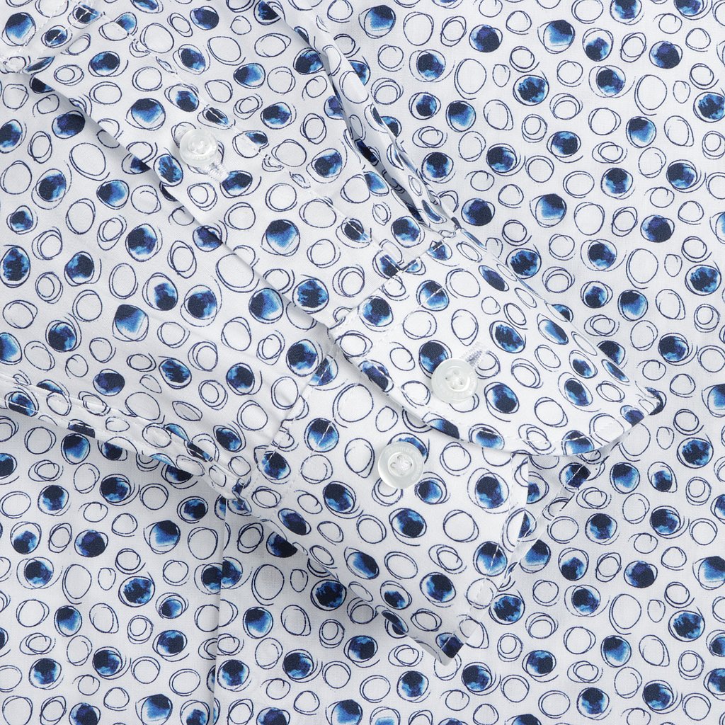 Add a touch of refined style to your wardrobe with this white 100% cotton shirt, adorned with subtle blue sketched circle prints. The semi cutaway collar, single cuff, and tailored fit offer a contemporary design. Removable collar stays maintain a crisp appearance. Perfect for both formal and casual events.