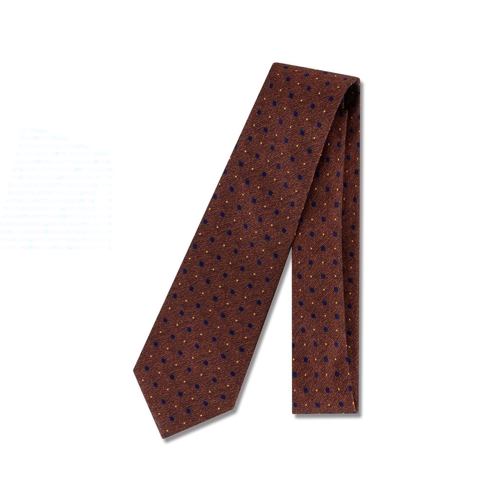 This Thomas & Benno silk tie delivers warm, refined sophistication with a timeless polka dot design. The deep chestnut base is complemented by navy and amber dots, creating a rich colour combination that feels classic, grounded, and exceptionally versatile. The textured weave adds subtle depth, giving the tie a luxurious finish that pairs seamlessly with both business and formal tailoring.