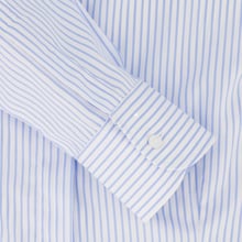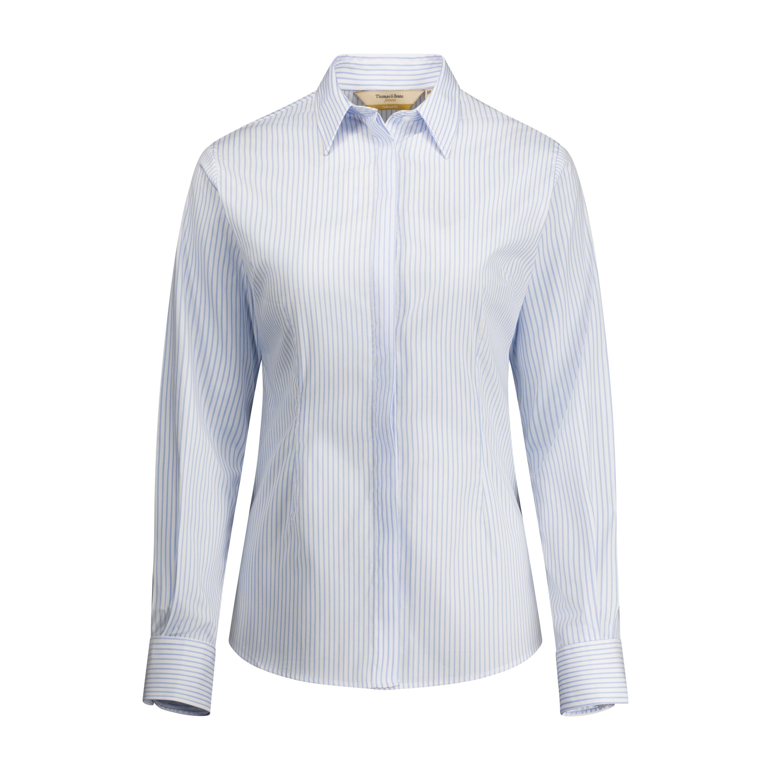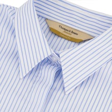 - Sophisticated light blue pinstripes on crisp white background