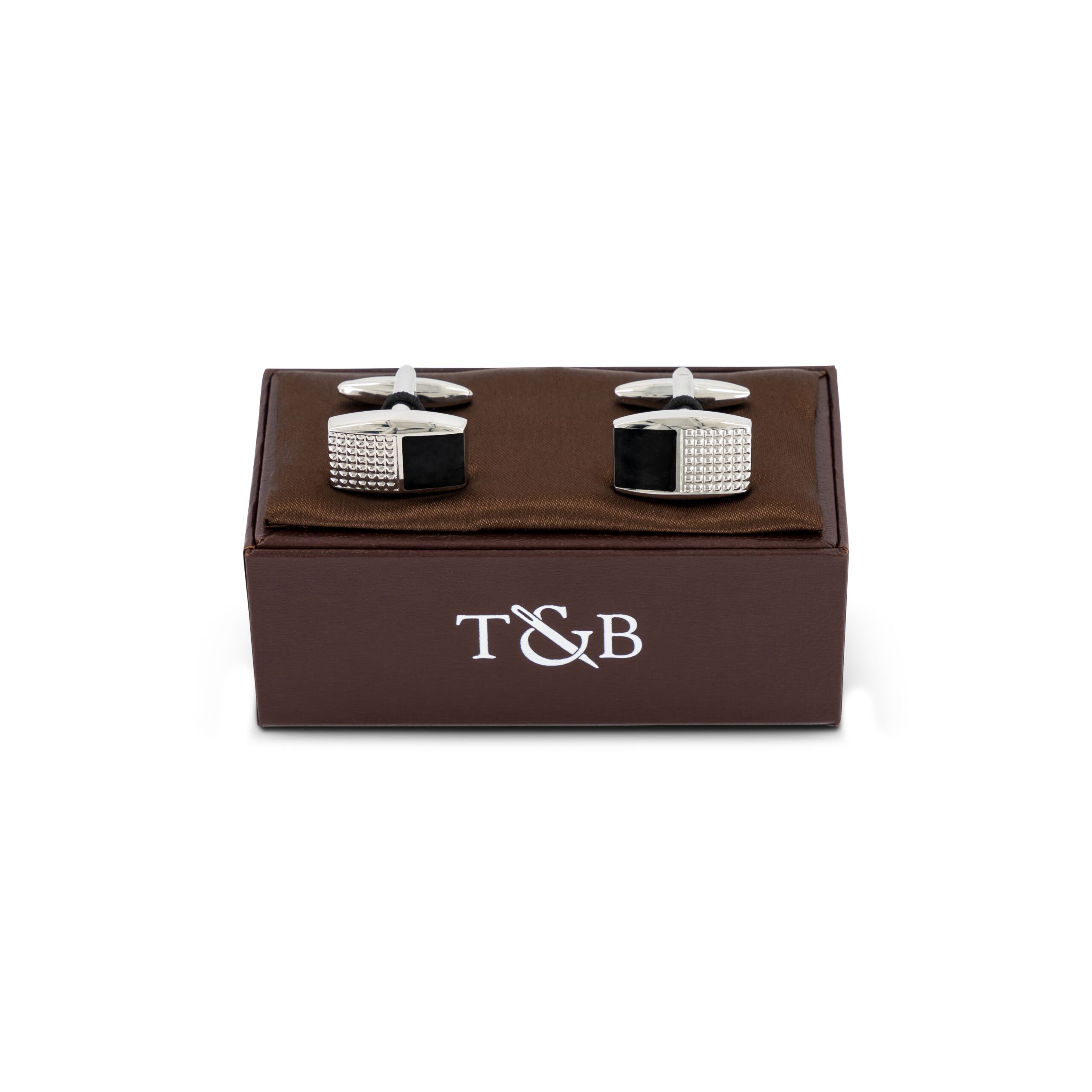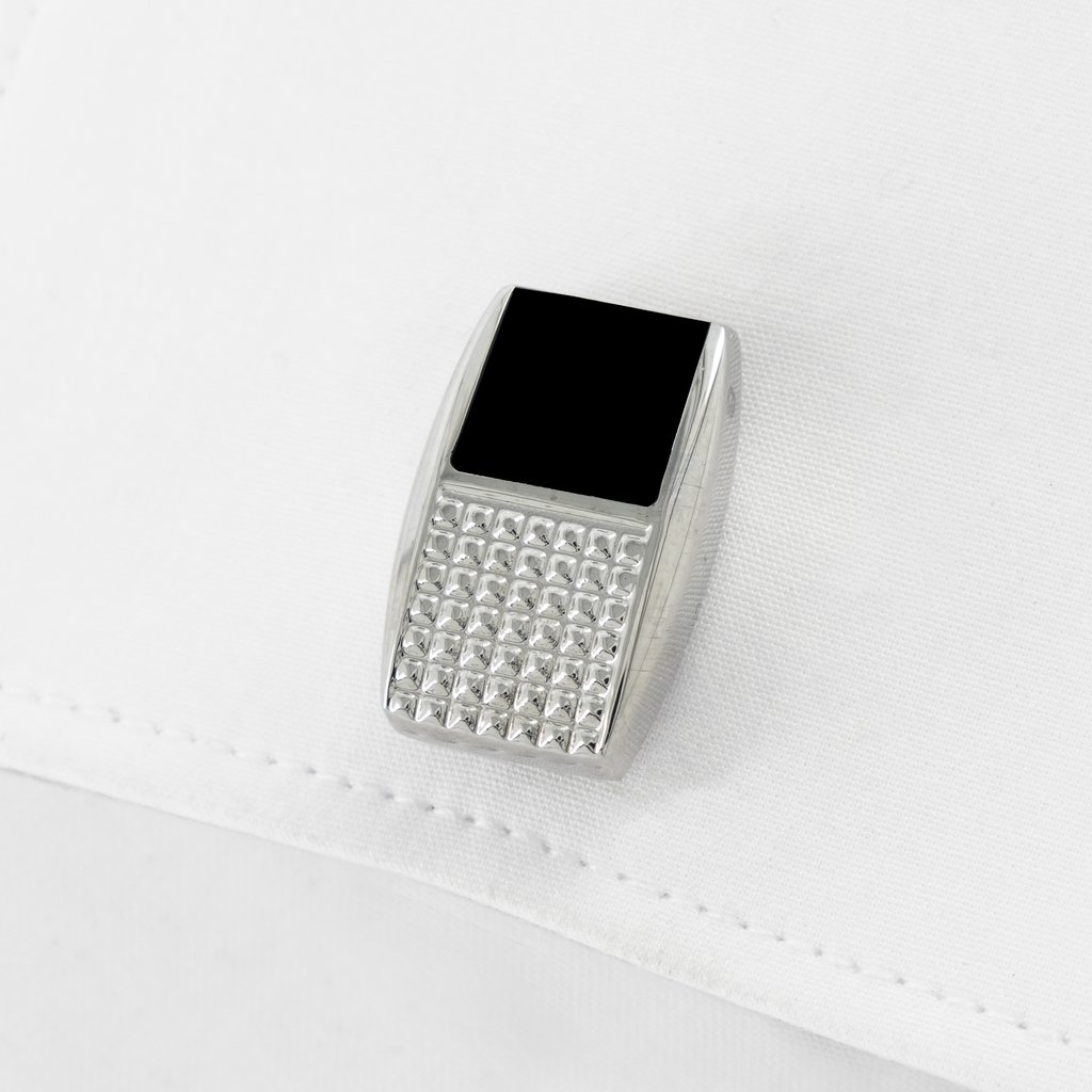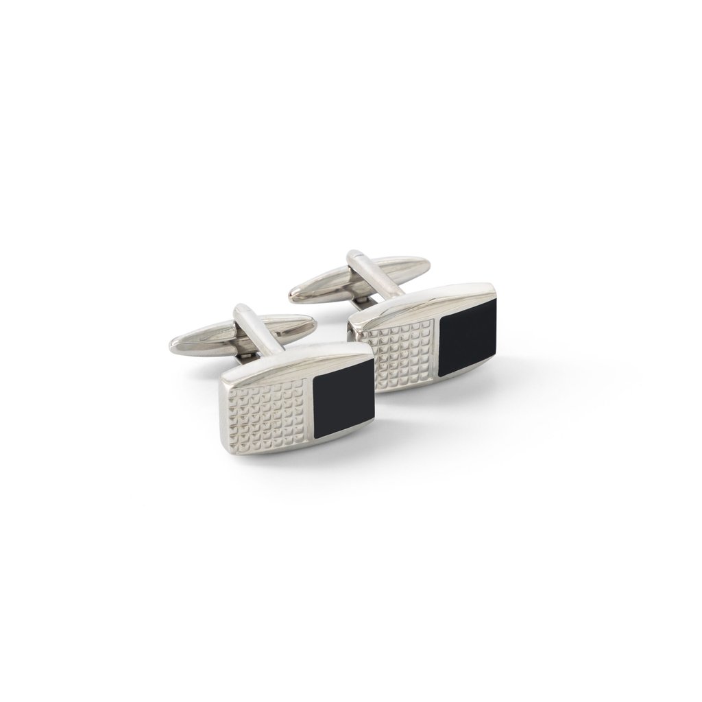 These Curved Edge Rectangular Cufflinks feature a stylish split face design, with a combination of grid and solid black elements. Crafted from high-quality rhodium-plated alloy, they boast a durable cuff clip and a sleek curved edge design. These cufflinks come in a presentable box, making them an excellent gift option.