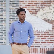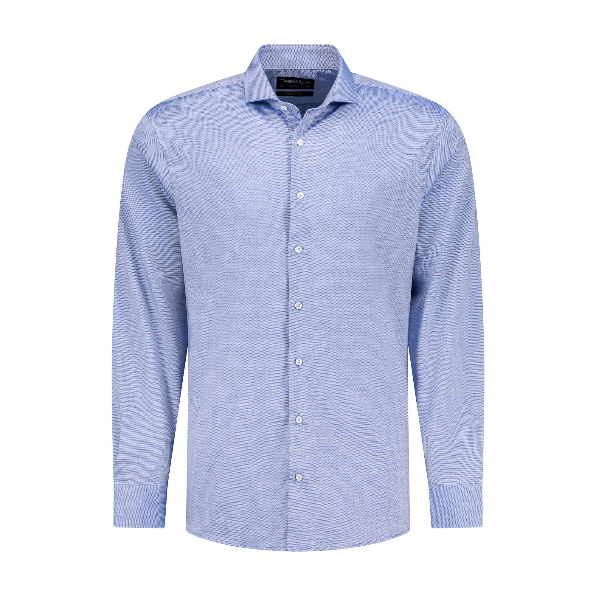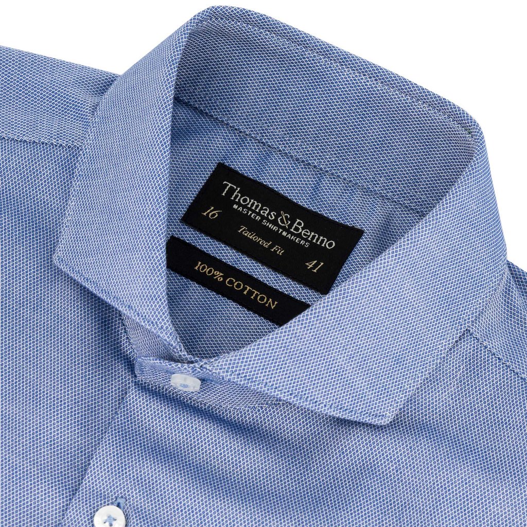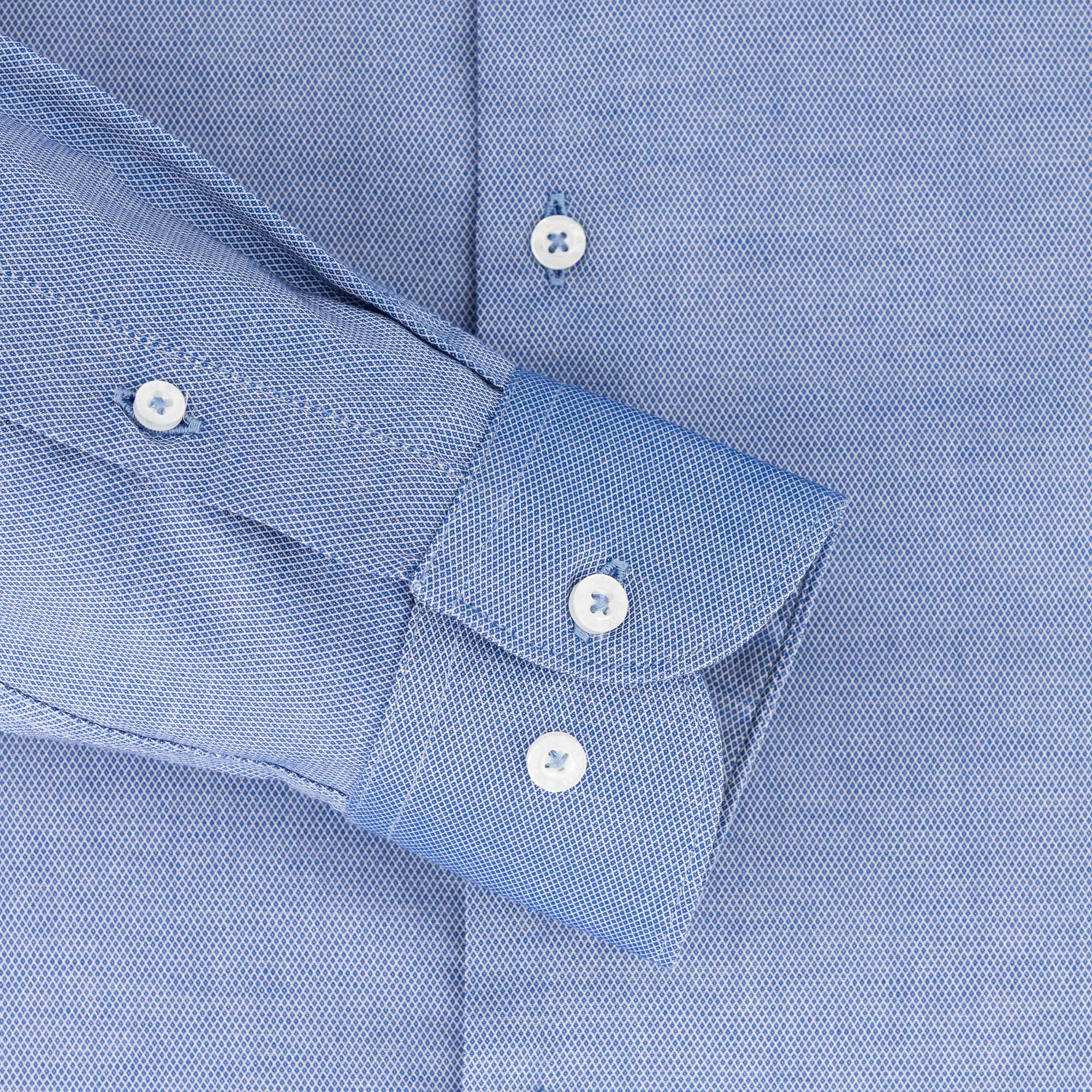 This dark blue dress shirt, featuring a refined diamond jacquard weave, is crafted from 100% cotton for exceptional breathability and comfort. The full cut-away collar with removable stays offers a sharp, versatile style, while the tailored fit ensures a polished, flattering silhouette. French arm and side seams provide superior durability, complemented by side gussets for ease of movement. Finished with single cuffs and machine washable at 30°C, this shirt blends understated elegance with practical sophistication, perfect for formal or professional occasions.