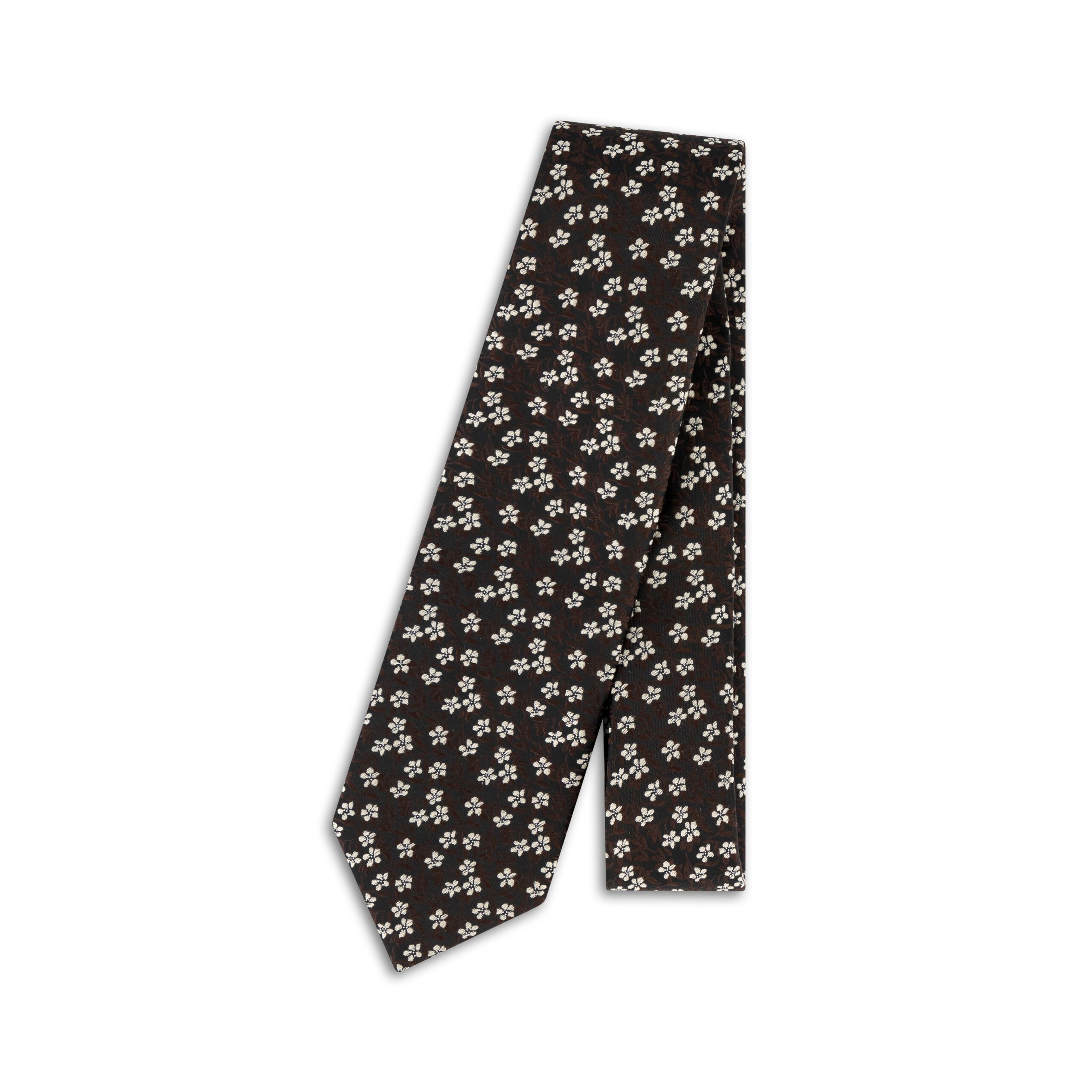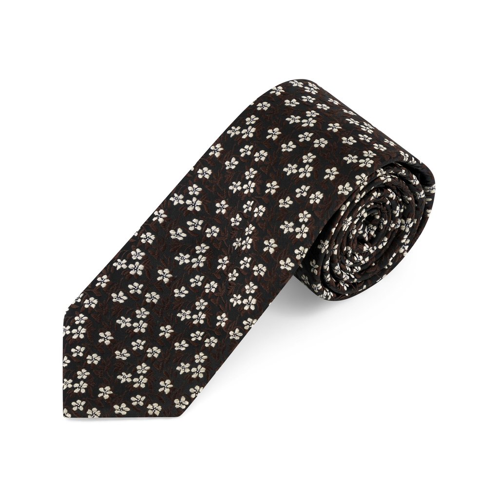 Make a bold yet elegant statement with the Brown Silk Tie with White Woven Flowers, a captivating fusion of colour and sophistication. Crafted from 100% premium silk, this tie features a striking dark brown foundation, intricately woven with a white floral pattern that adds a touch of whimsy to its luxurious appeal. The 7.5 cm width ensures a timeless, balanced silhouette, while the 150 cm length accommodates a range of knotting preferences with ease. Perfect for standout occasions or to infuse your formal wardrobe with vibrant personality, this tie exemplifies exceptional craftsmanship and modern style. Dry clean only to maintain its radiant hues and silky texture, ensuring it remains a cherished piece for the fashion-forward gentleman.