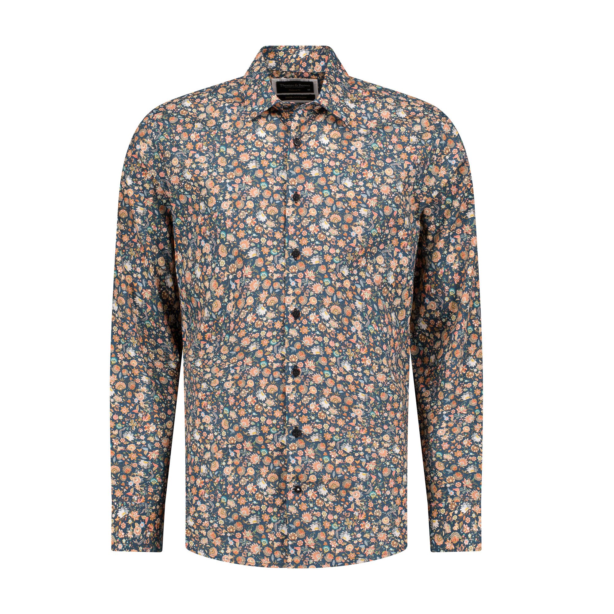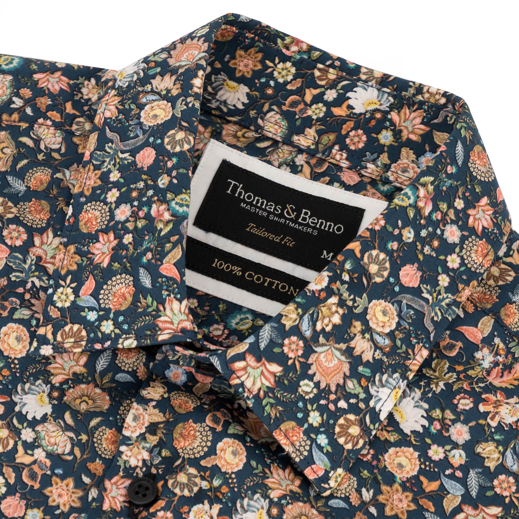 This Men’s Dark Green Multi-Floral Print Cotton Tailored Shirt offers a striking blend of bold design and classic sophistication. Crafted from 100% premium cotton, it features a rich dark green base adorned with a vibrant floral print in orange, cream, and blue tones, creating a distinctive and refined look. The tailored fit ensures a sleek, flattering silhouette, complemented by a semi cut-away collar with removable collar bones for customizable structure and a single cuff for a polished finish. Constructed with French arm and side seams, along with side gussets for enhanced durability, this shirt combines elegance with resilience. Machine washable at 30 degrees and designed for easy ironing when damp, it is a stylish and practical addition to any gentleman’s formal wardrobe.