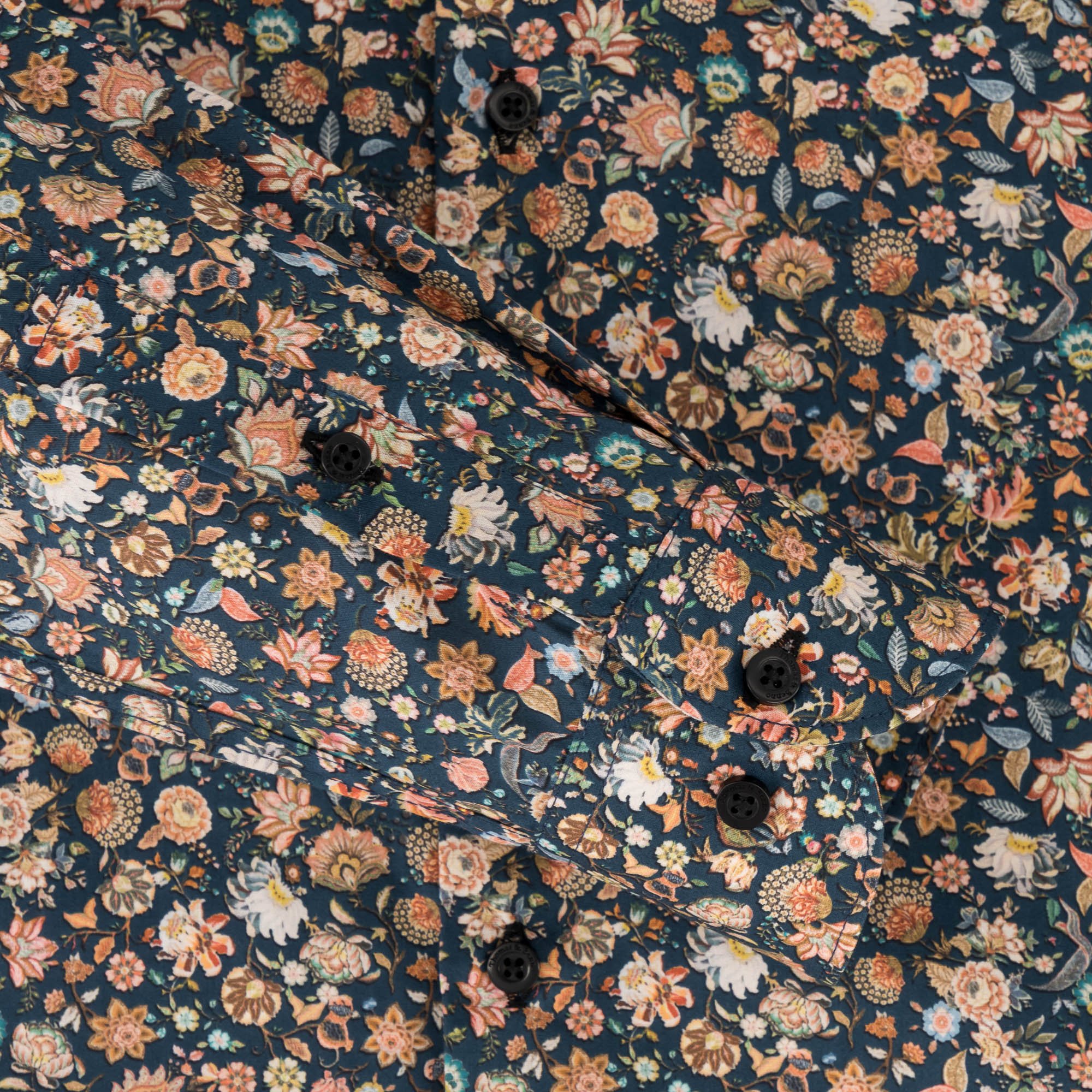 - Dark green base with orange, cream, and blue floral print