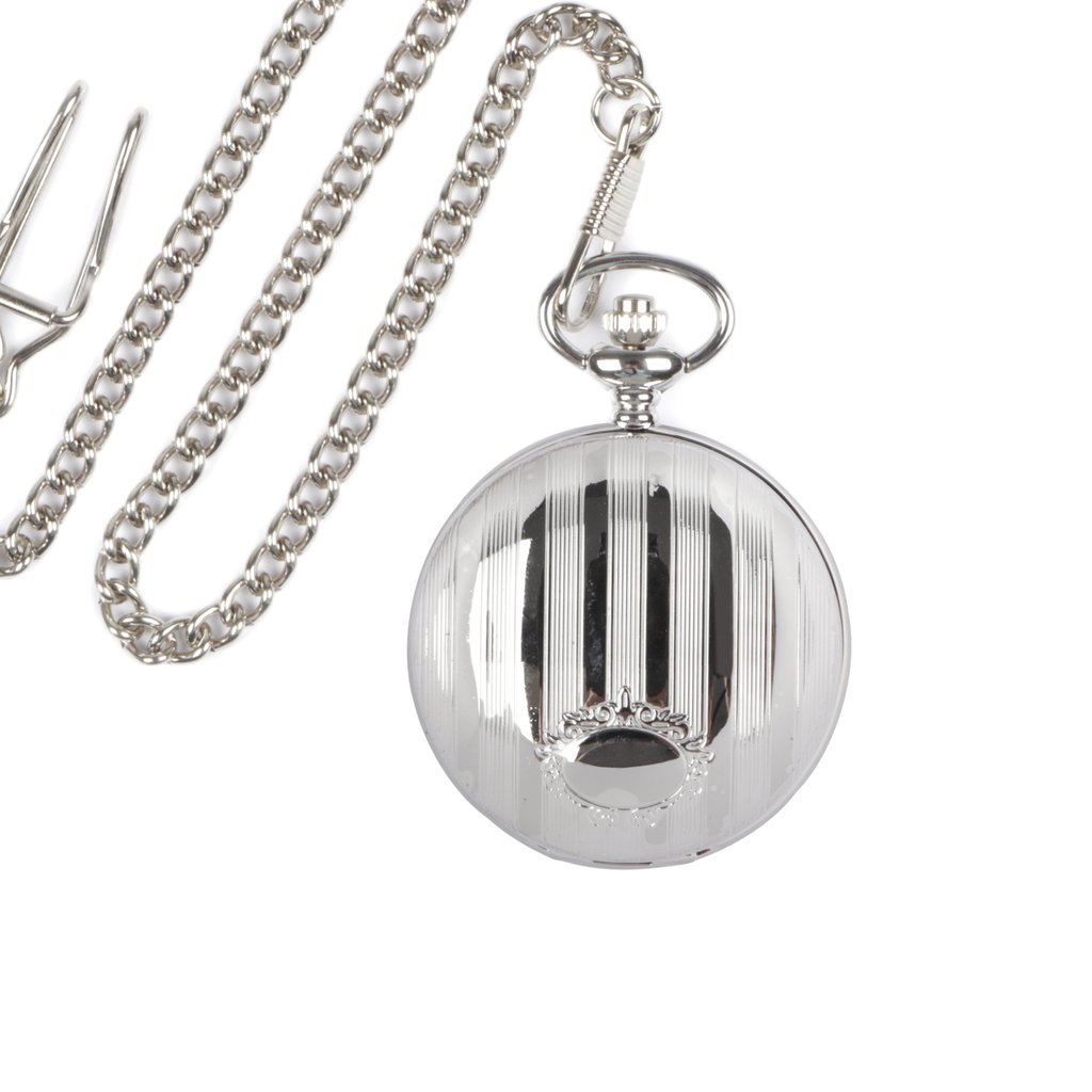 Experience the timeless elegance of this silver finish pocket watch, designed with a classic aesthetic. The intricate detailing and durable construction ensure a sophisticated look and lasting performance. Ideal for completing the classic look attached to a waistcoat pocket.