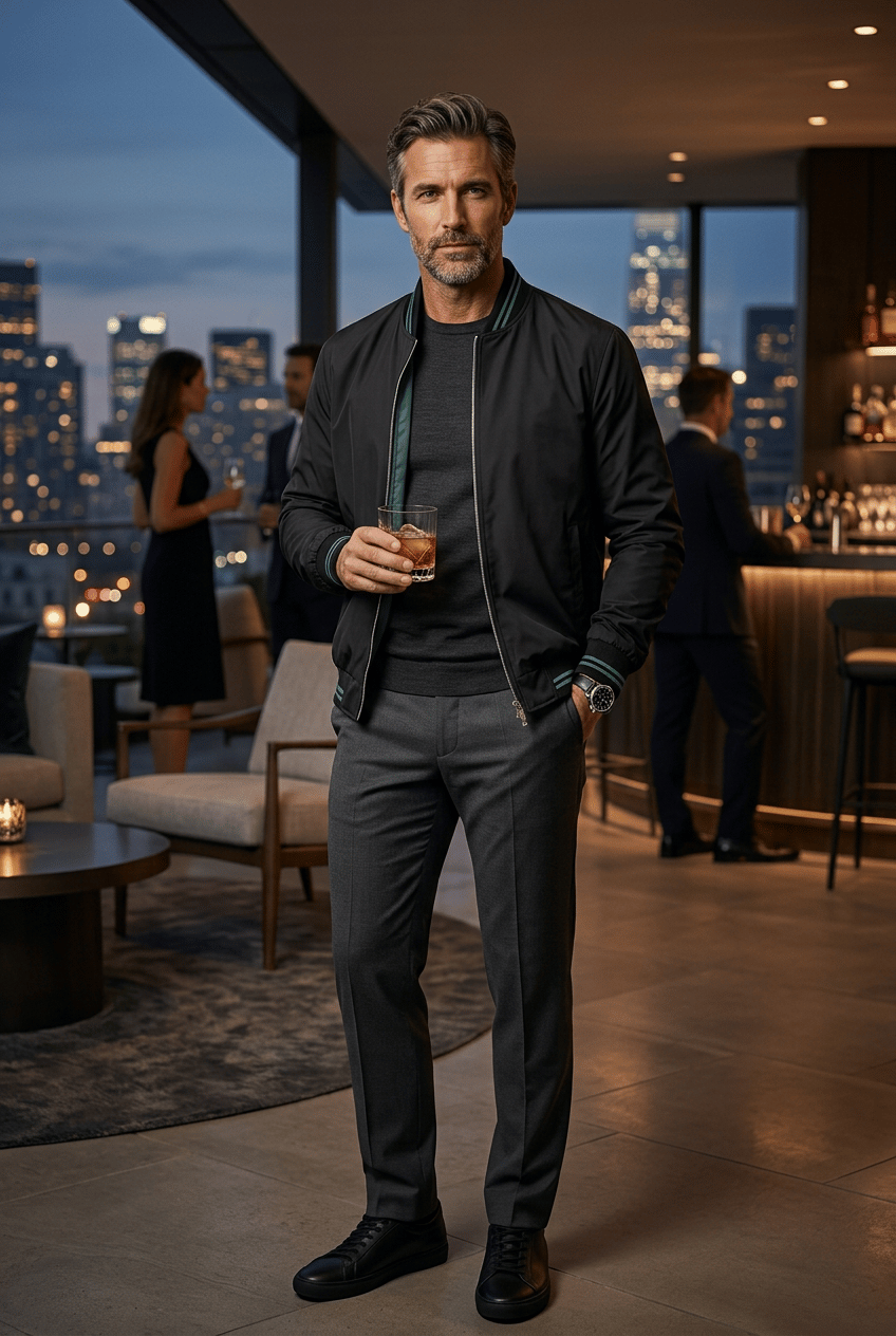 Whether paired with tonal chinos for a contemporary ensemble or layered over a crisp white shirt for refined casual style, this reversible bomber transitions seamlessly across occasions — embodying the signature Thomas and Benno balance of simplicity and distinction.