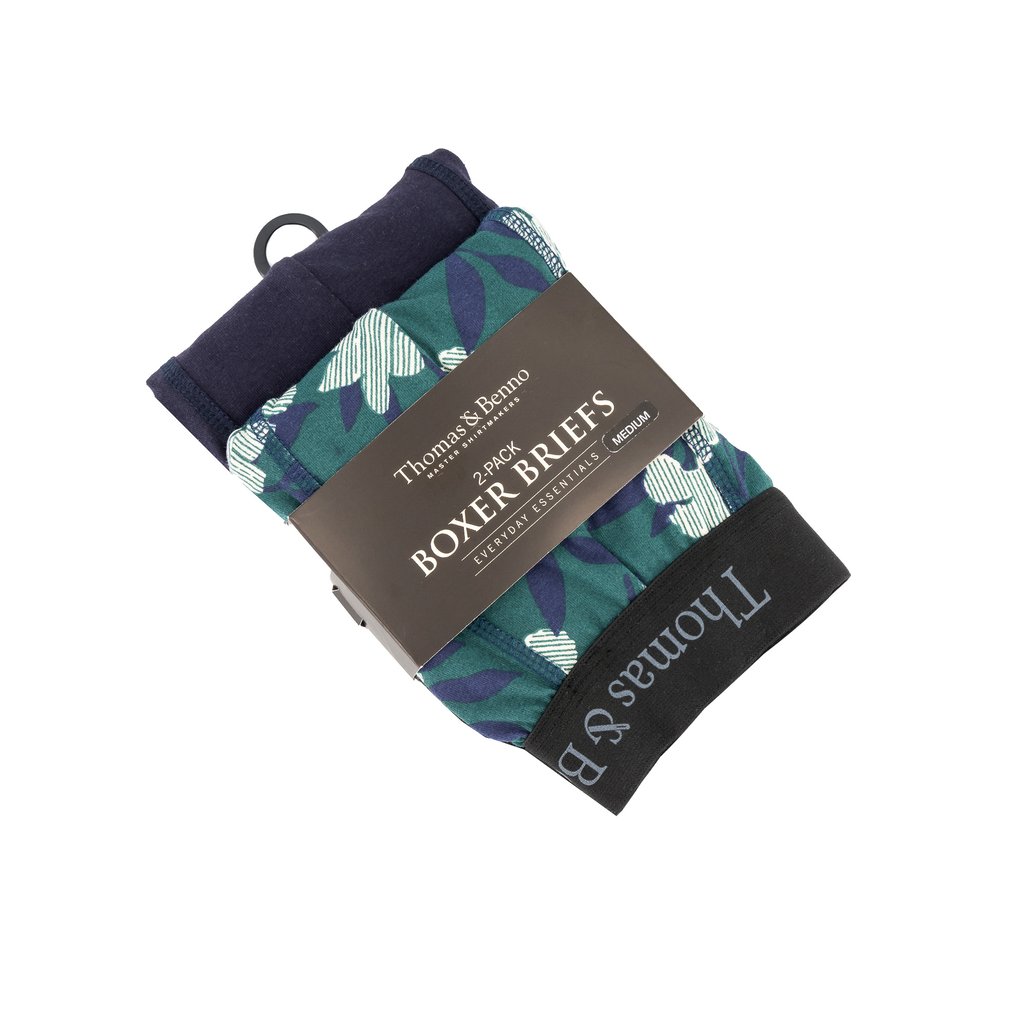 Refine your essentials with our men’s green floral and plain navy cotton spandex boxer briefs, 2-pack. Crafted from a premium 95% cotton and 5% spandex blend, these boxer briefs offer a perfect balance of softness, breathability, and flexibility for all-day comfort. This set includes one pair with a vibrant green floral print and one sleek plain black pair, providing both style and versatility. The 3cm-wide, high-quality waistband ensures a secure and comfortable fit, while the short leg design delivers a modern, streamlined silhouette. Machine washable for easy maintenance, these boxer briefs are ideal for the modern man seeking comfort, durability, and a touch of distinctive flair in their everyday wardrobe.