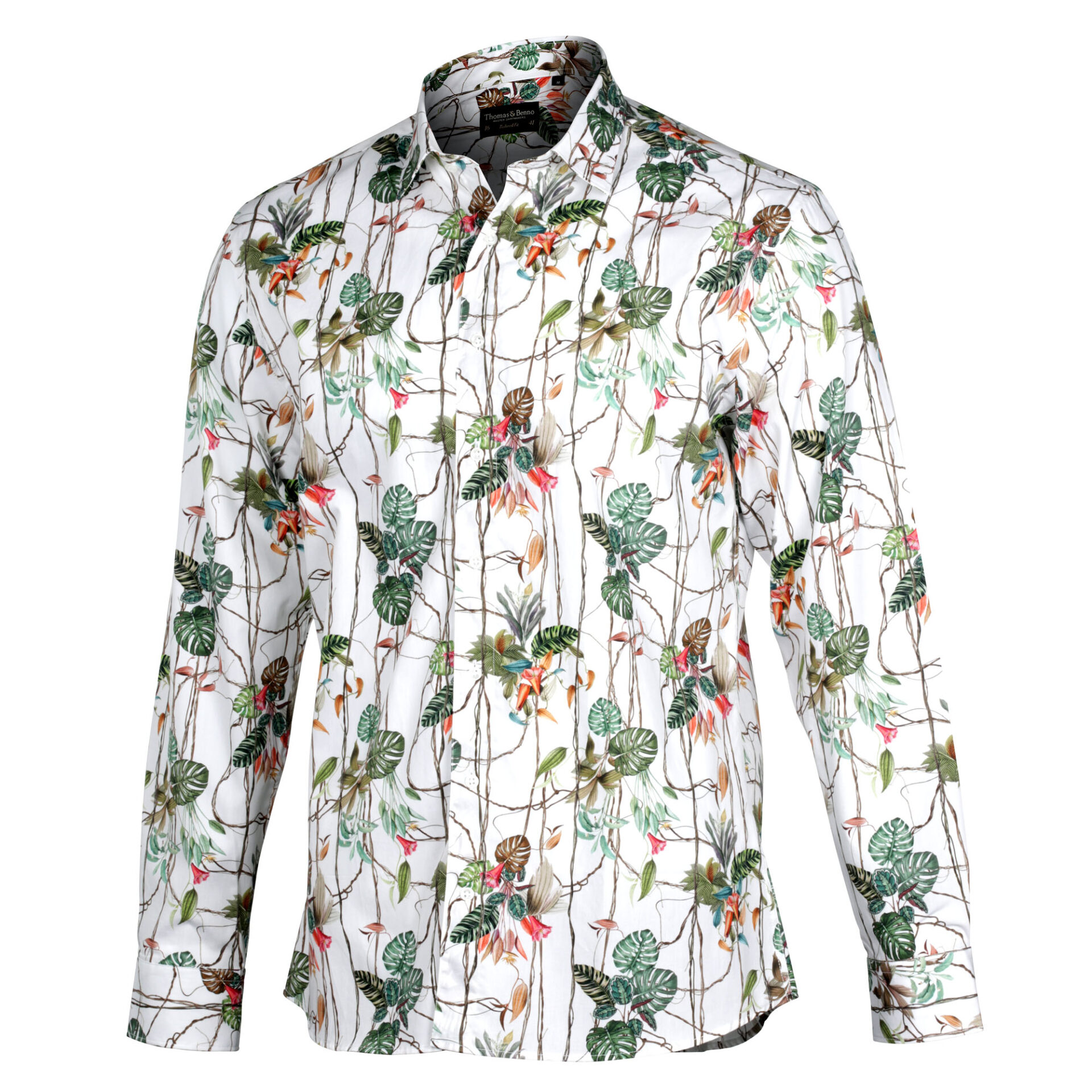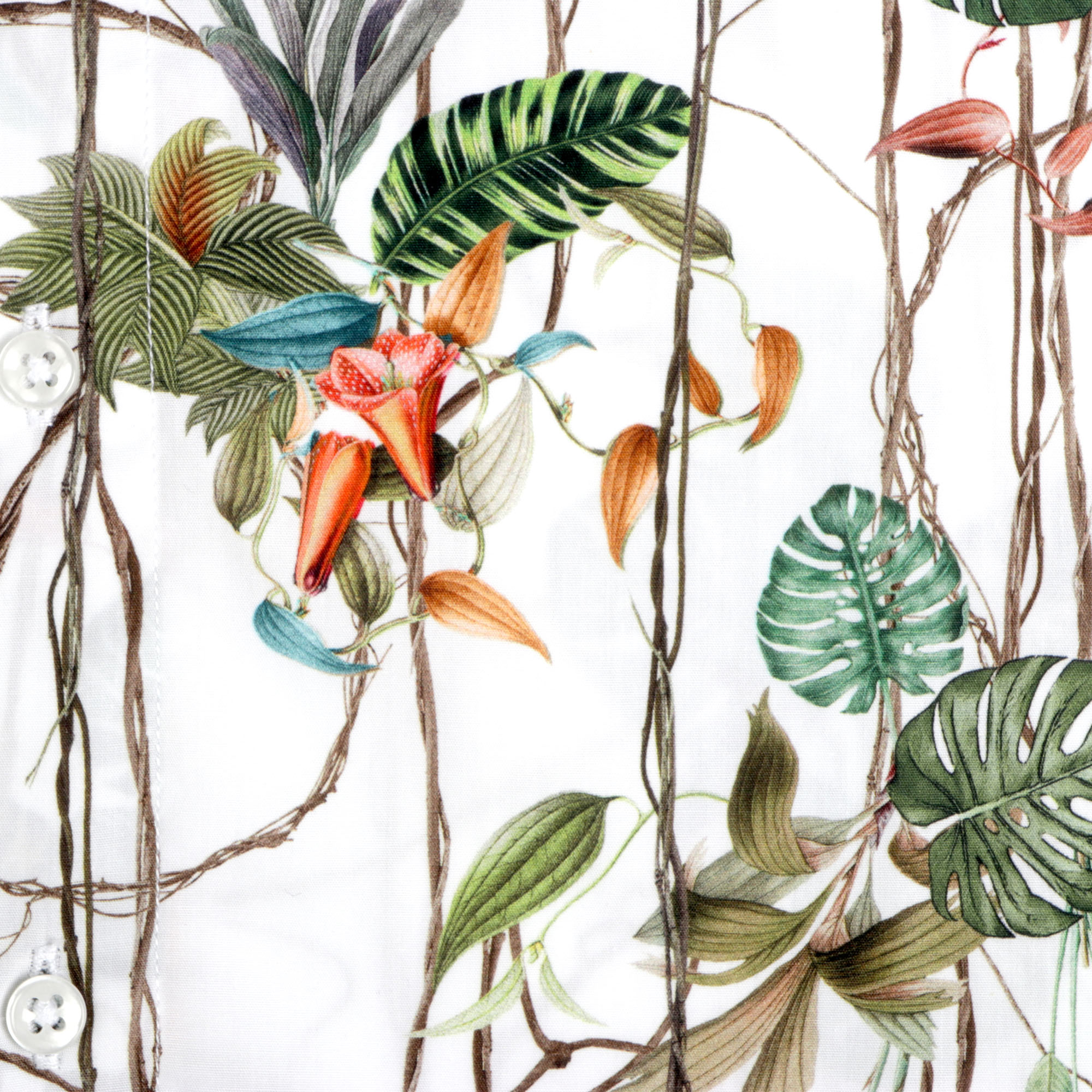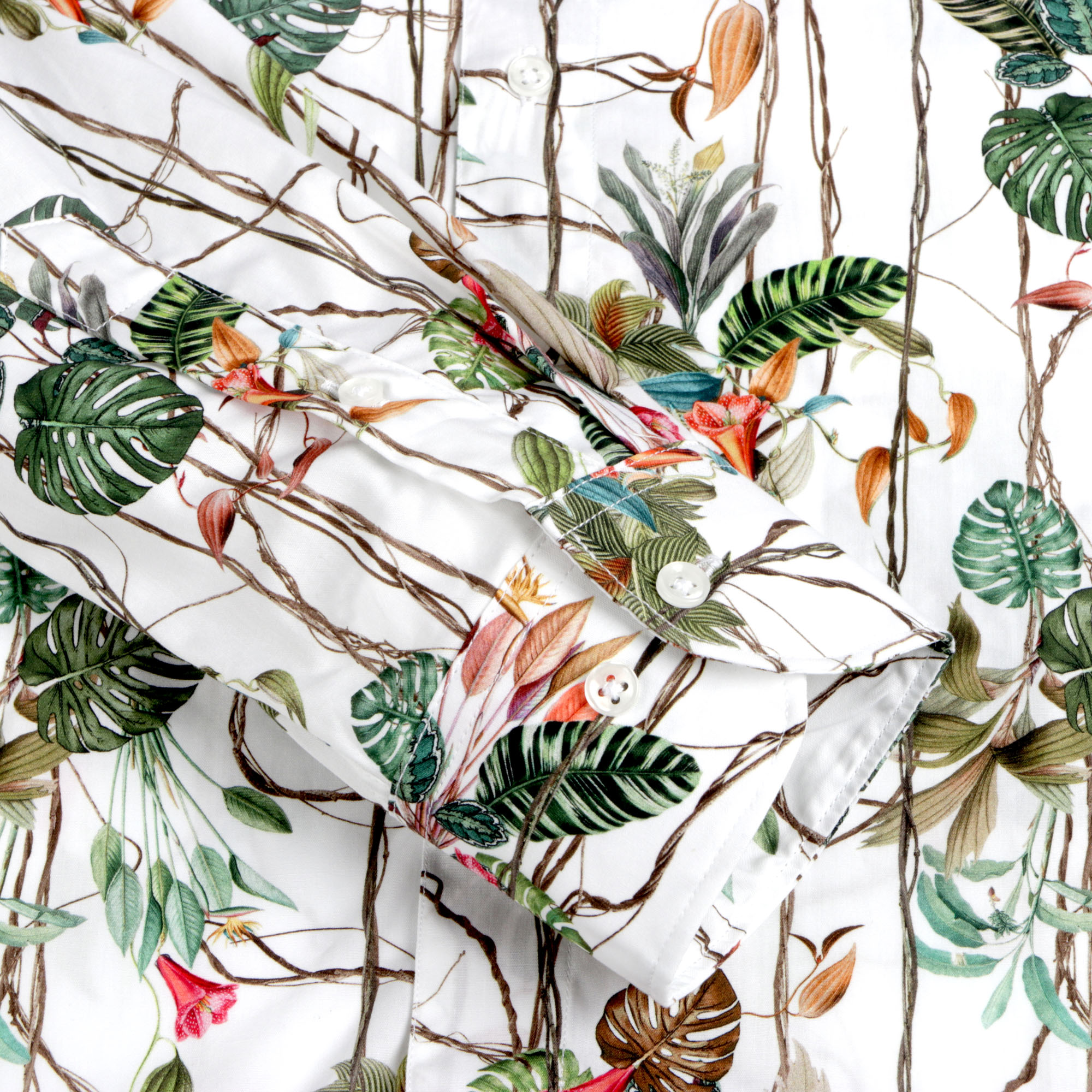 Vine green printed shirt with a semi cut away collar and rounded single cuffs.