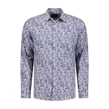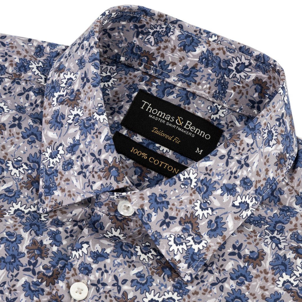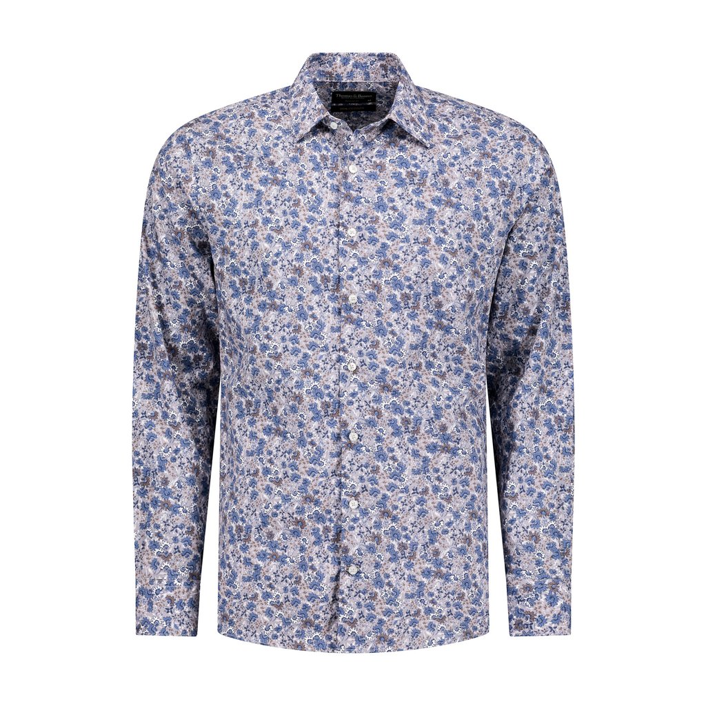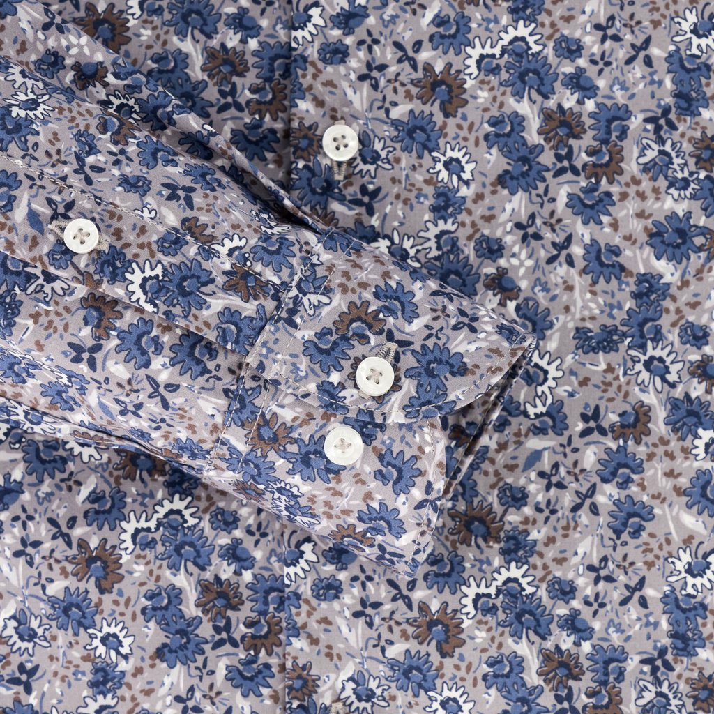 This grey dress shirt, adorned with a refined blue and brown floral print, is crafted from 100% cotton for exceptional breathability and comfort. The semi cut-away collar, equipped with removable stays, offers a modern yet adaptable look, while the tailored fit ensures a sharp, flattering silhouette. French arm and side seams provide lasting durability, complemented by side gussets for ease of movement. With single cuffs and machine washability at 30°C, this shirt blends distinctive style with practical sophistication, perfect for formal or elevated occasions.