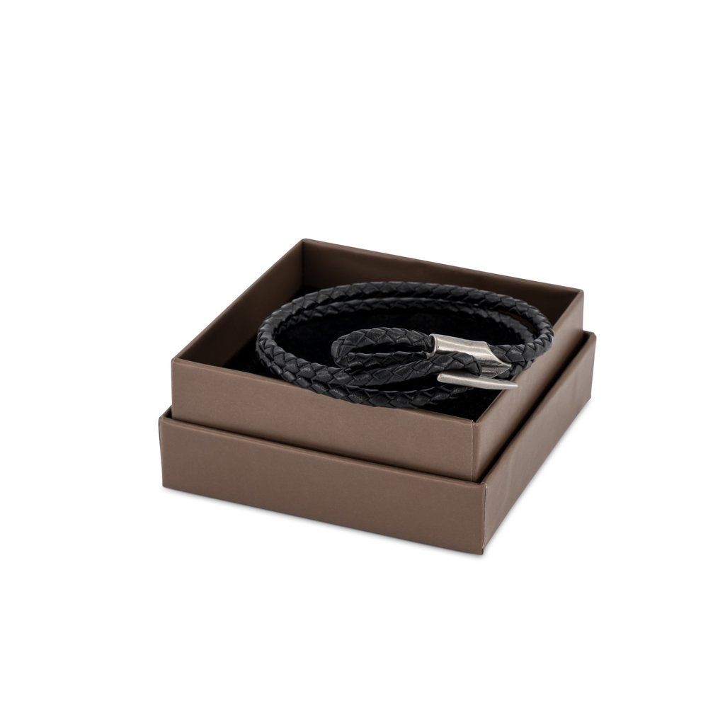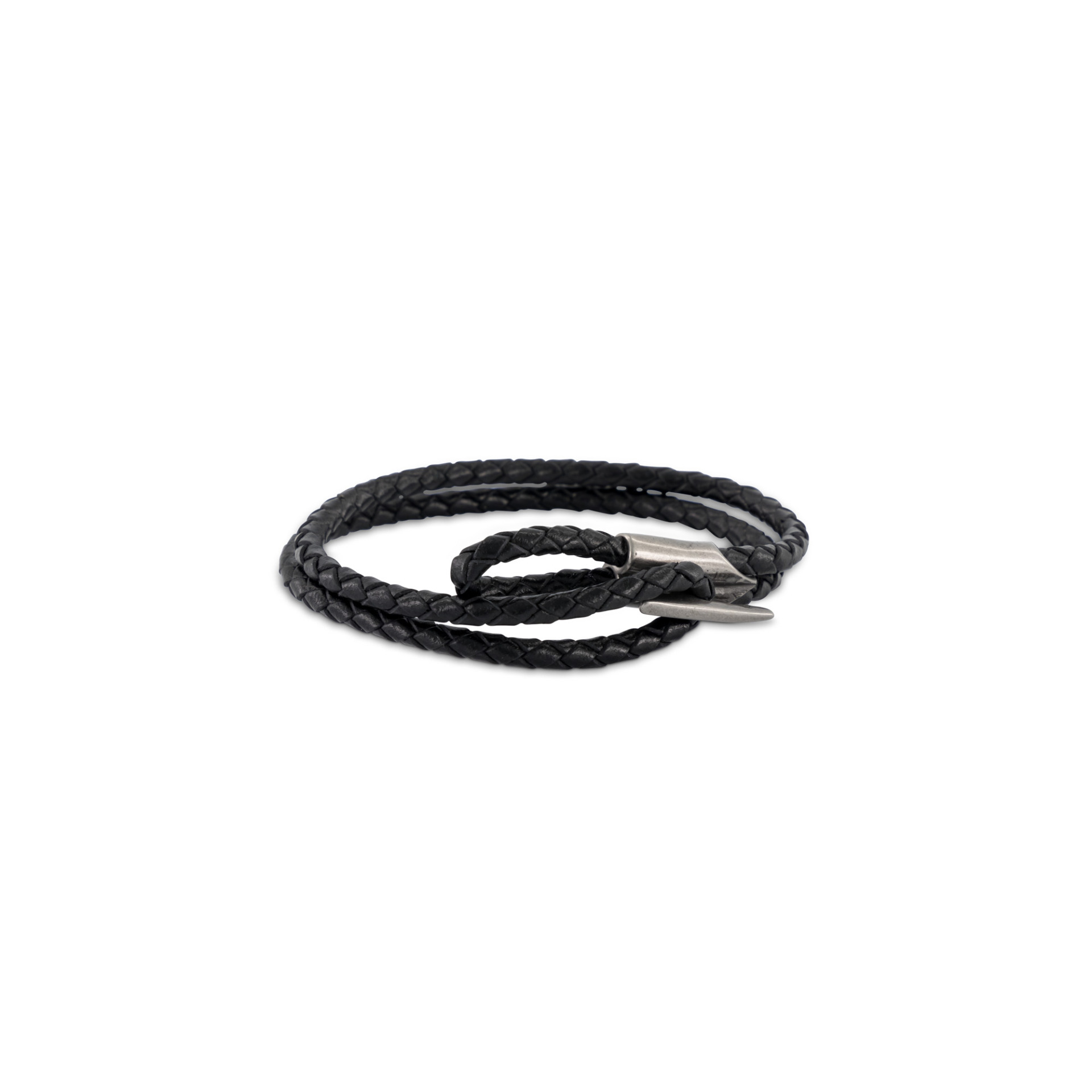 Experience the perfect blend of style and durability with this braided black leather rope bracelet, featuring a sleek gunmetal steel dagger hook clasp. A must-have accessory for any outfit.