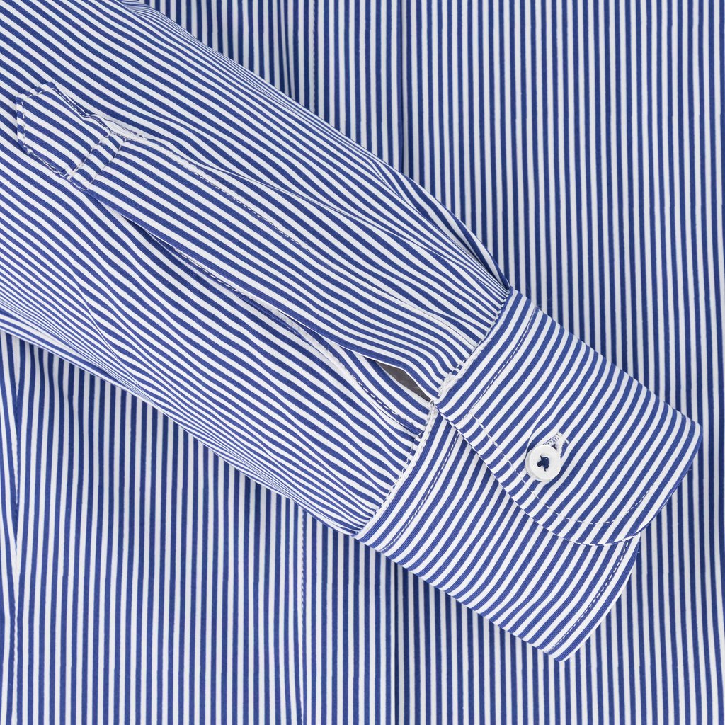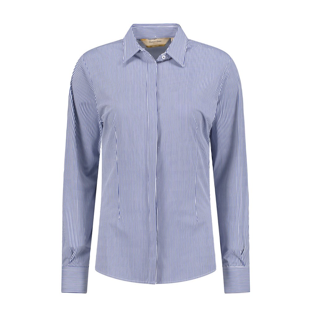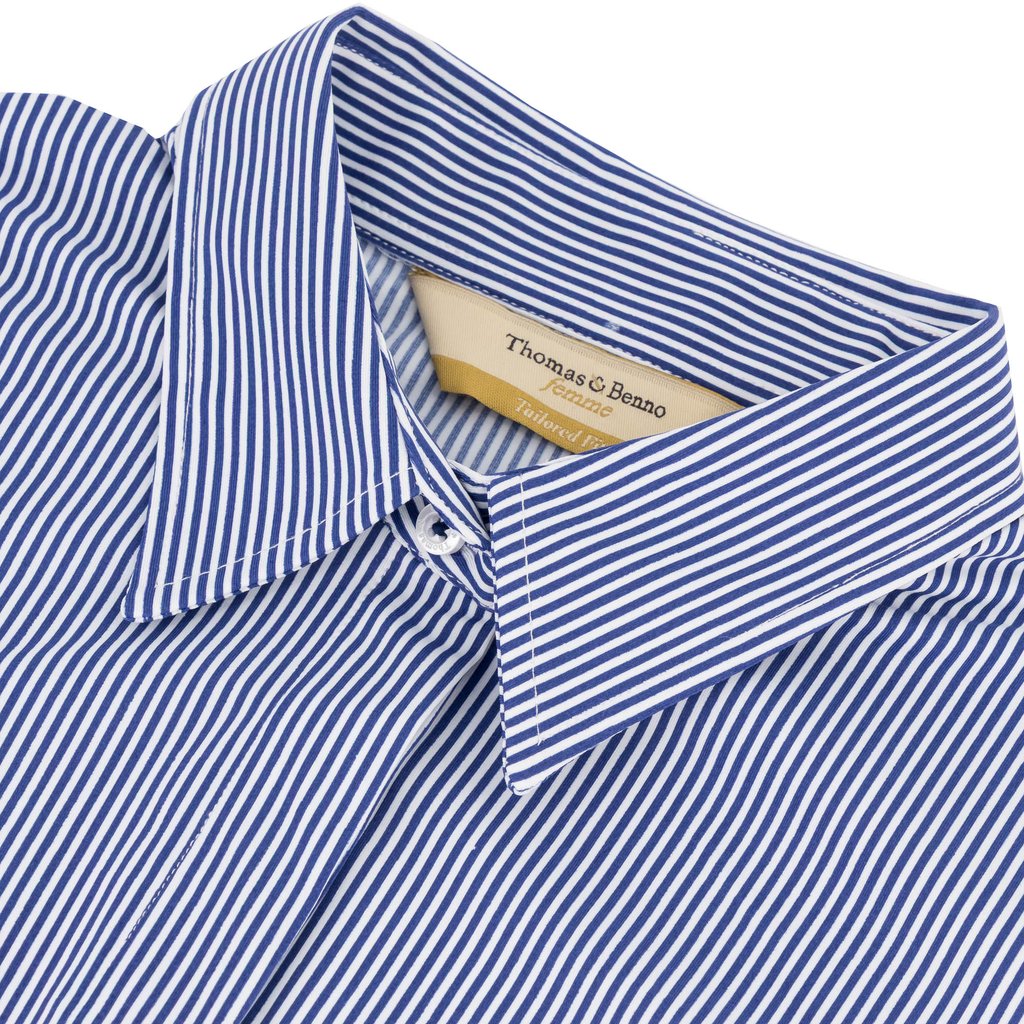 This women’s navy pencil stripe cotton stretch tailored shirt combines timeless sophistication with modern comfort. Crafted from premium cotton with a hint of stretch, it offers a tailored fit that flatters the feminine silhouette. The delicate pencil stripe pattern exudes understated elegance, complemented by a semi cut-away collar and single cuff for a refined look. Designed with French arm and side seams, a covered button placket, and side gussets for added structure, this shirt ensures both durability and poise. Easy to maintain, it is machine washable at 30 degrees and designed for effortless ironing when damp, making it an ideal choice for the discerning woman’s formal wardrobe.