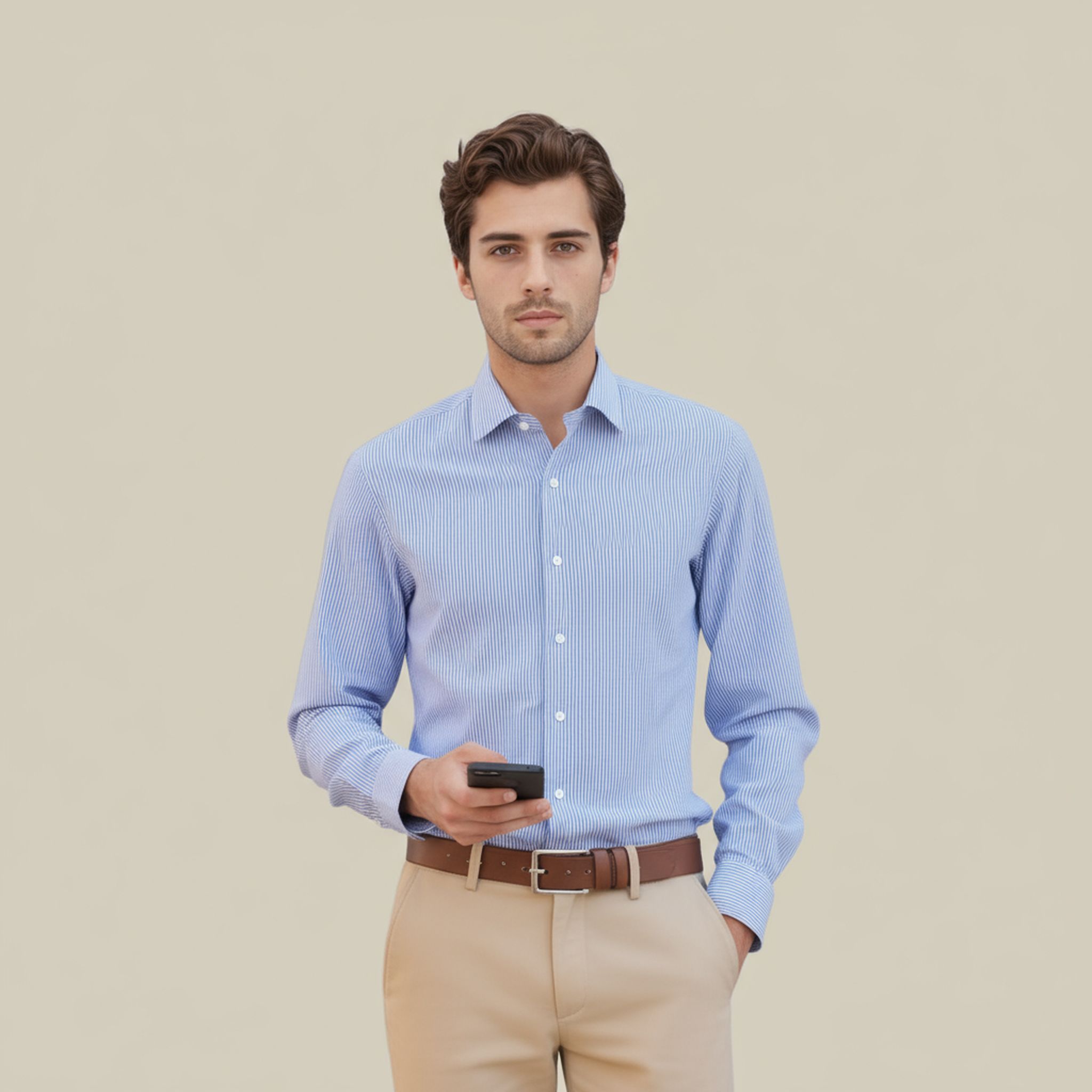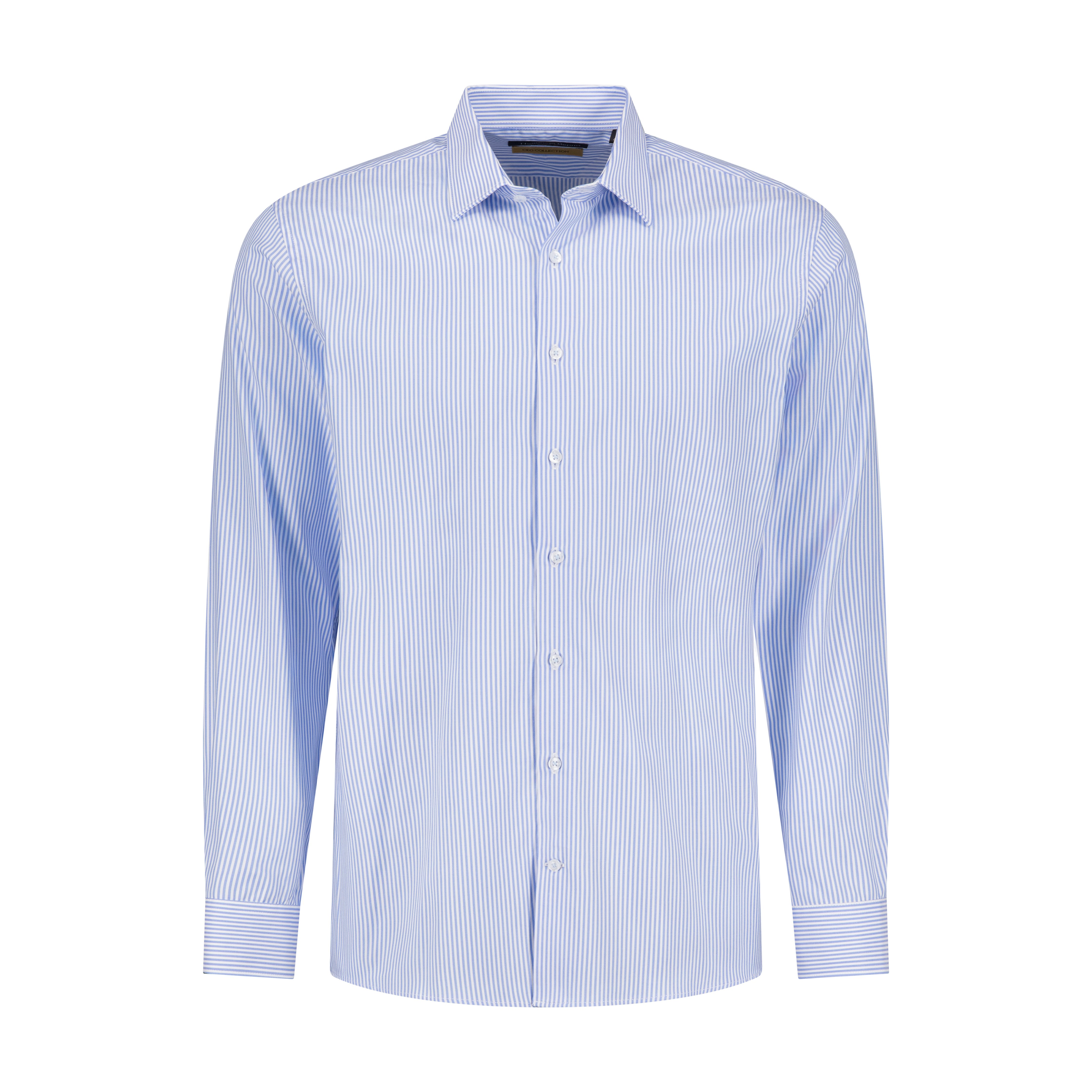 This light blue striped shirt from the CEO Collection is crafted from luxurious 140/2 cotton, offering a smooth finish and breathable comfort. The semi cutaway collar with removable stays provides a refined, modern edge, while the regular fit ensures ease of movement. Finished with single cuffs, side gussets, and French seams, this shirt reflects Thomas & Benno’s commitment to precision tailoring and executive style.
