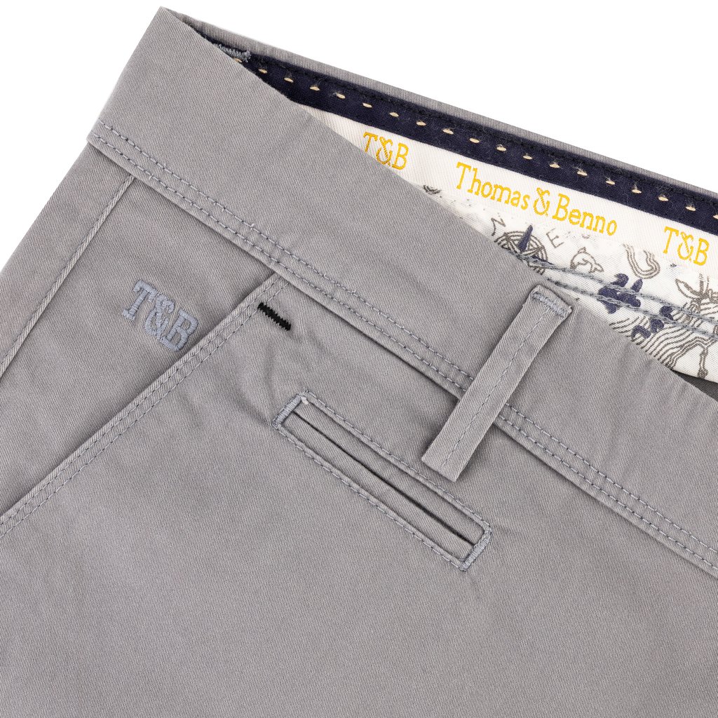 These Light Grey Cotton‑Stretch 5‑Pocket Chinos from Thomas & Benno are designed for the gentleman who values refined style with dependable everyday comfort. Crafted from a premium cotton‑stretch blend, the fabric offers a smooth, structured feel while allowing ease of movement throughout the day.