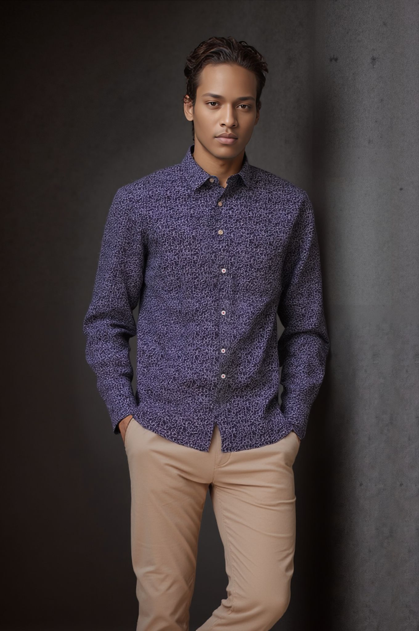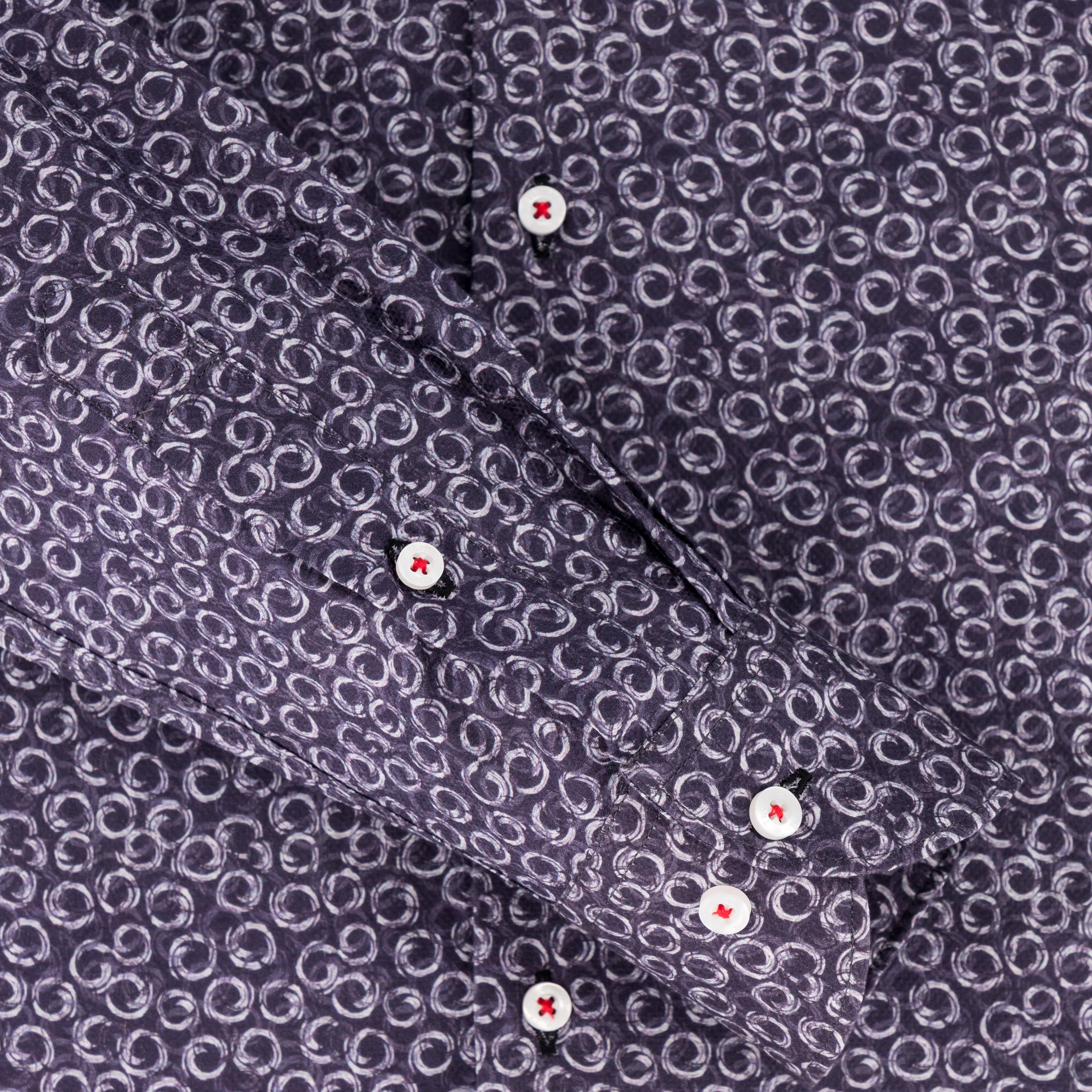 Its midnight navy base with swirling grey circular motifs creates a sophisticated yet contemporary aesthetic, complemented by white buttons with red thread detailing for a touch of personality. Perfect for both smart-casual and formal occasions, this shirt combines premium craftsmanship with distinctive design.