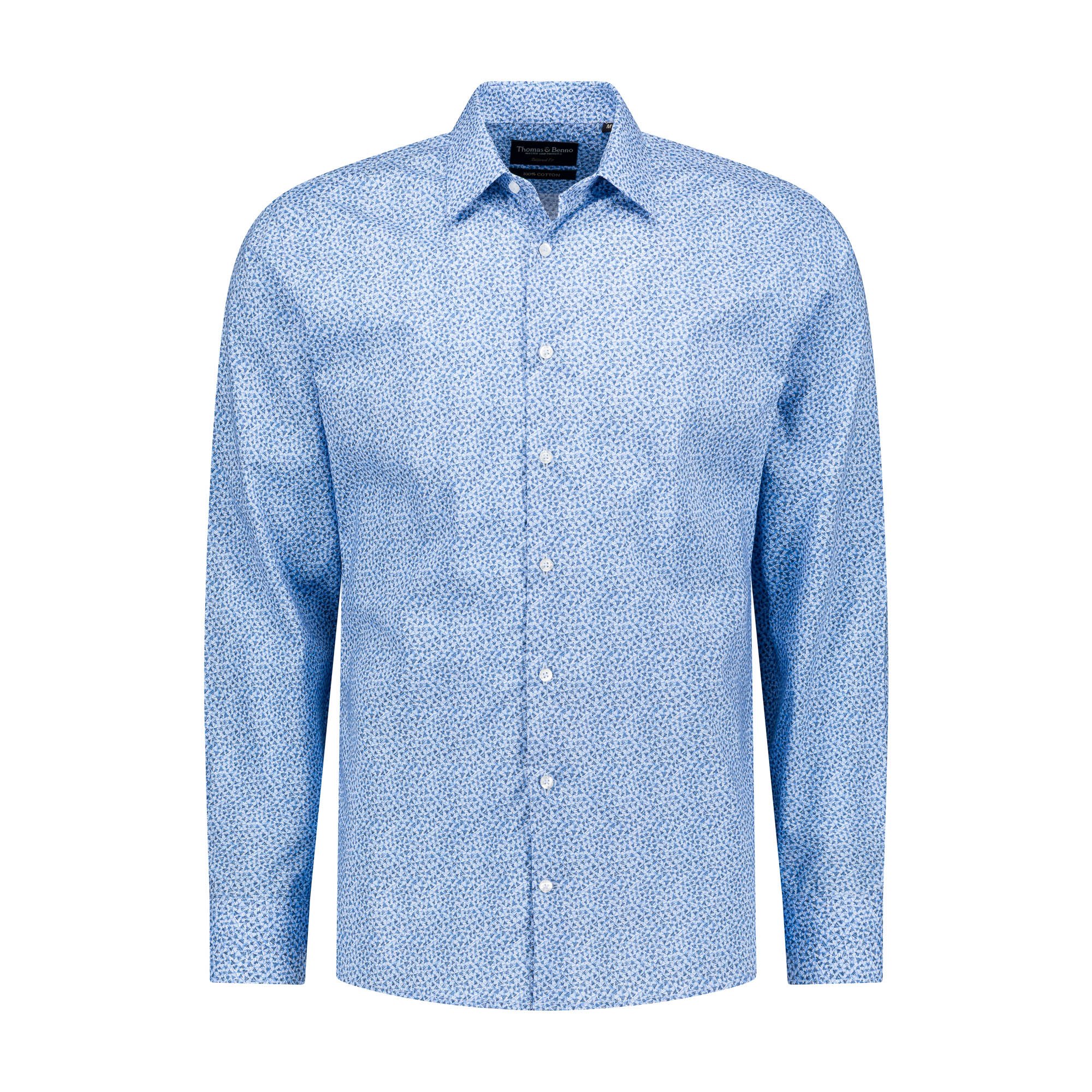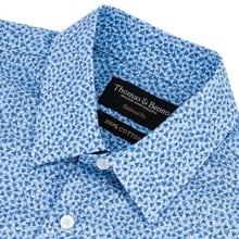 This navy dress shirt, adorned with a dynamic light blue abstract print, is crafted from 100% cotton for outstanding breathability and comfort. The semi cut-away collar, featuring removable stays, provides a modern yet adaptable style, while the tailored fit ensures a sharp, flattering silhouette. French arm and side seams offer exceptional durability, paired with side gussets for ease of movement. Complete with single cuffs and machine washable at 30°C, this shirt combines vibrant, modern design with practical sophistication, ideal for formal or distinguished occasions.