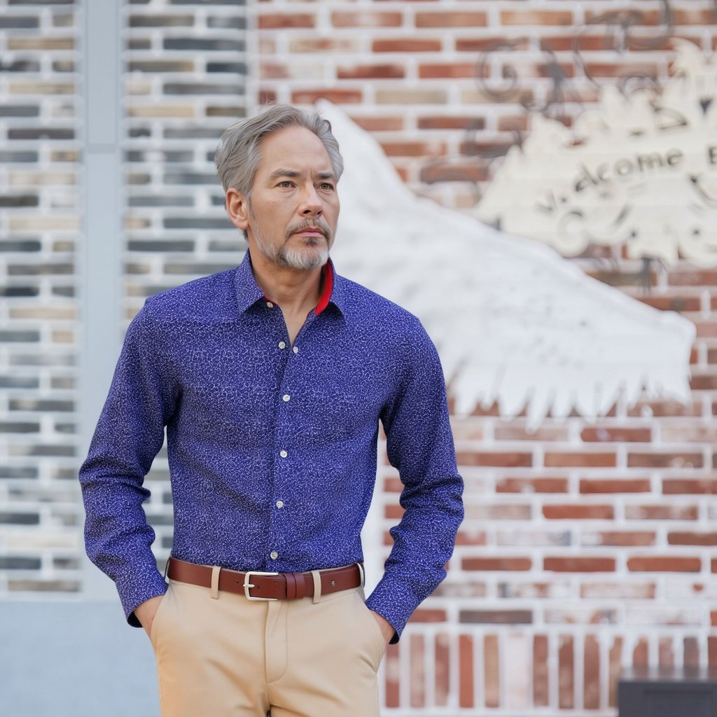 Its navy base adorned with intricate circular motifs creates a refined yet contemporary style, complemented by striking red inner collar and cuff trim for a modern twist. Perfect for evening events, stylish office wear, or upscale casual outings, this shirt combines premium craftsmanship with distinctive design.