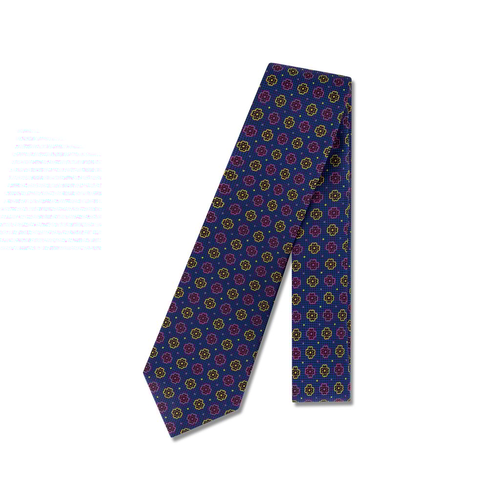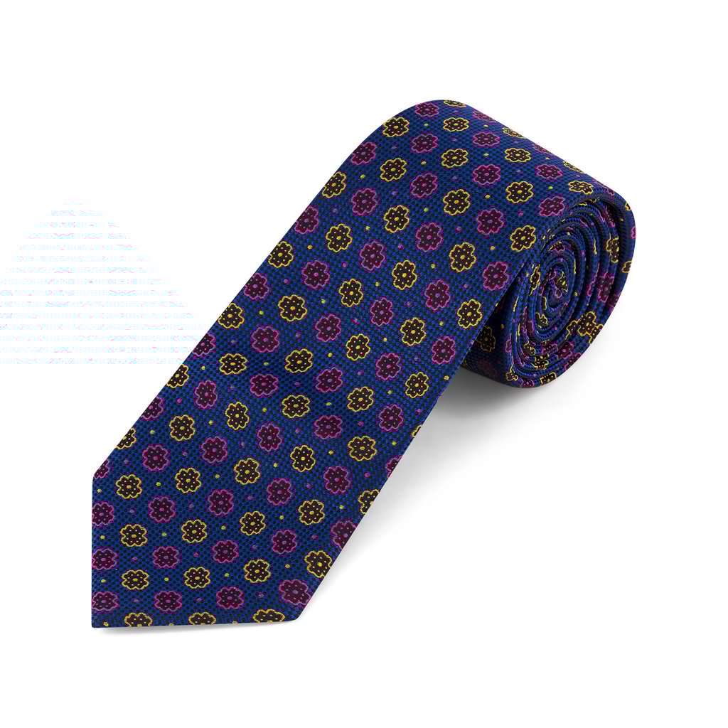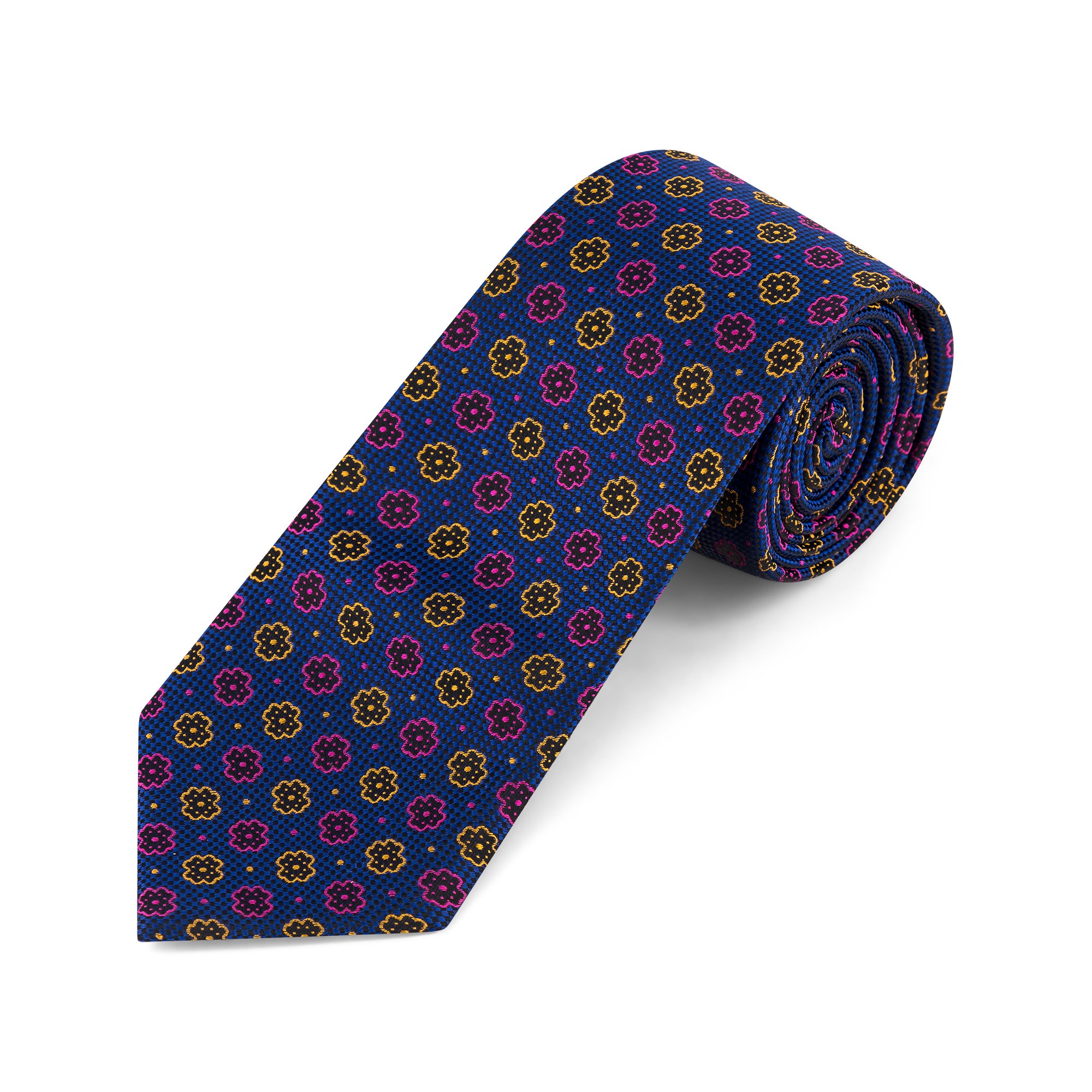 This Navy Floral Medallion Silk Tie from Thomas & Benno offers a distinguished and timeless expression of classic menswear. Crafted from 100% pure silk, the tie features an intricate medallion design in rich shades of gold and magenta set against a deep navy background. The combination of colours and pattern delivers refined character without compromising formality, making it ideal for the discerning gentleman.