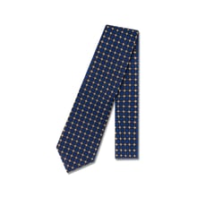 This Thomas & Benno silk tie is a refined interpretation of geometric design, balancing bold pattern with classic sophistication. The rich navy base is enriched with a repeating gold‑outlined square motif, each filled with tonal blue accents that add dimension without overwhelming the eye. Crafted from luxurious woven silk, this tie offers a subtle sheen and a beautifully structured drape.