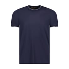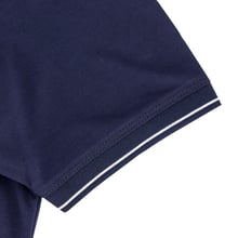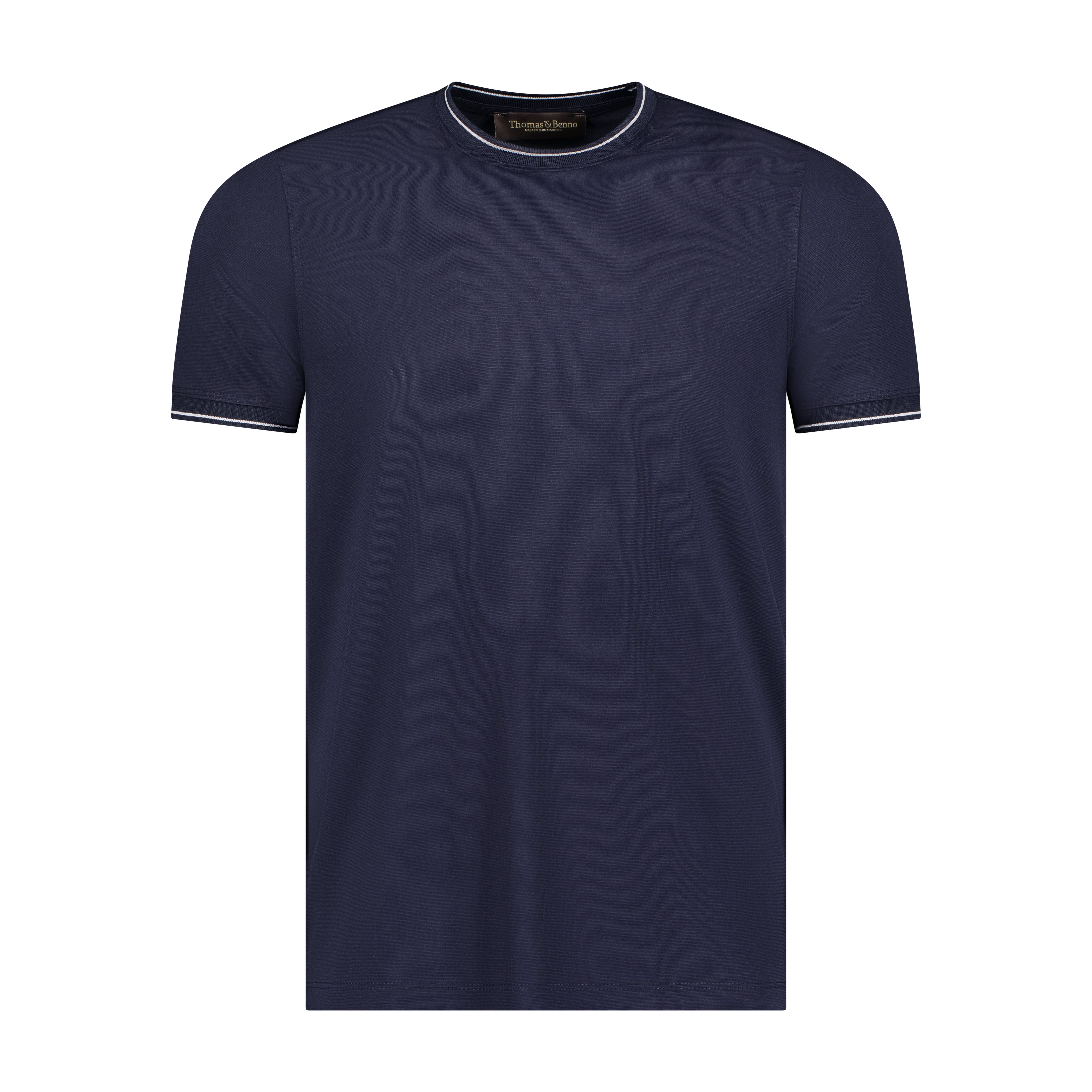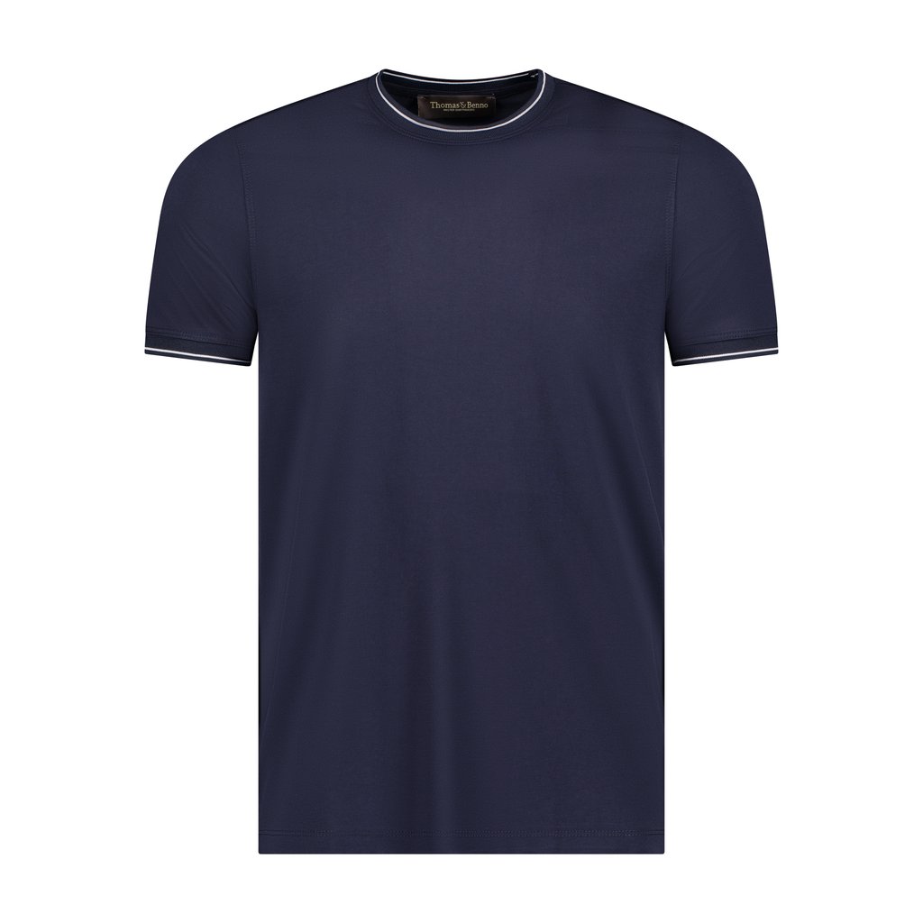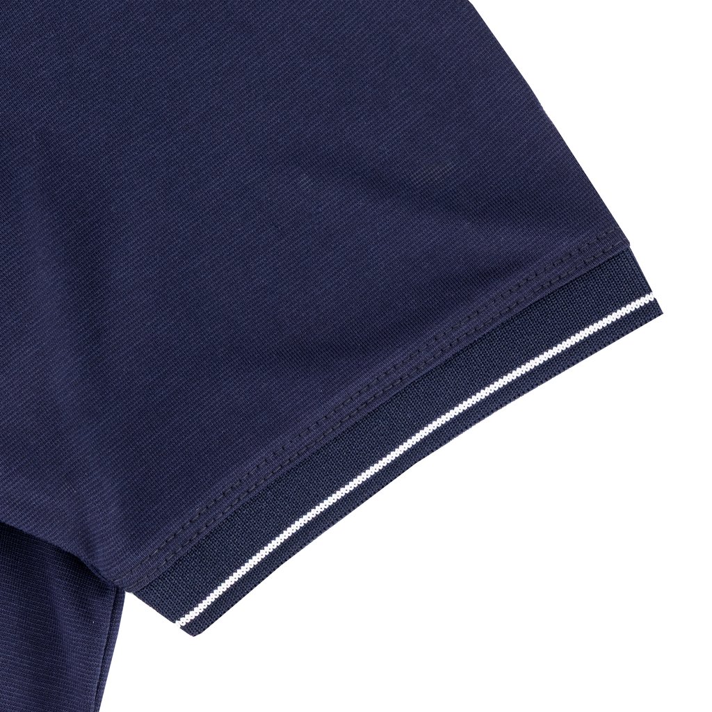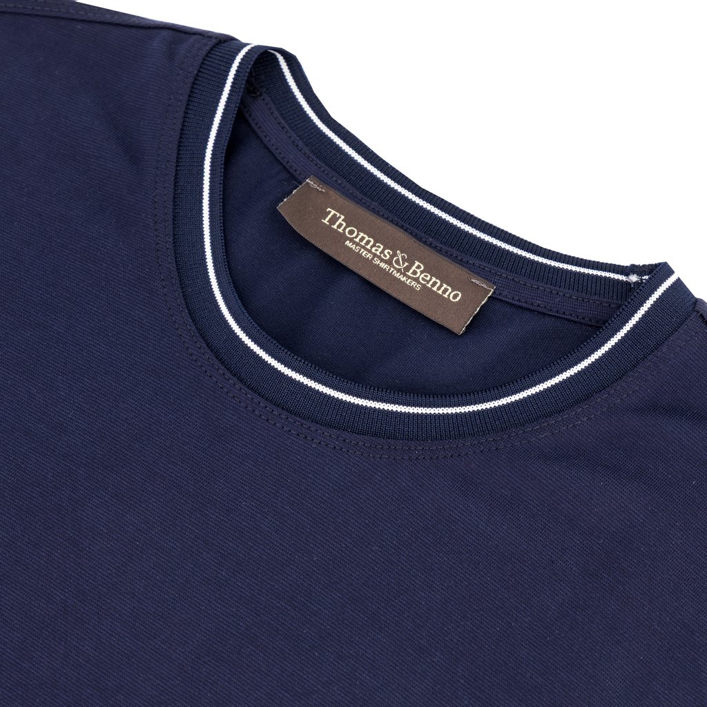 - Contrast‑striped ribbed neckline in navy and white
