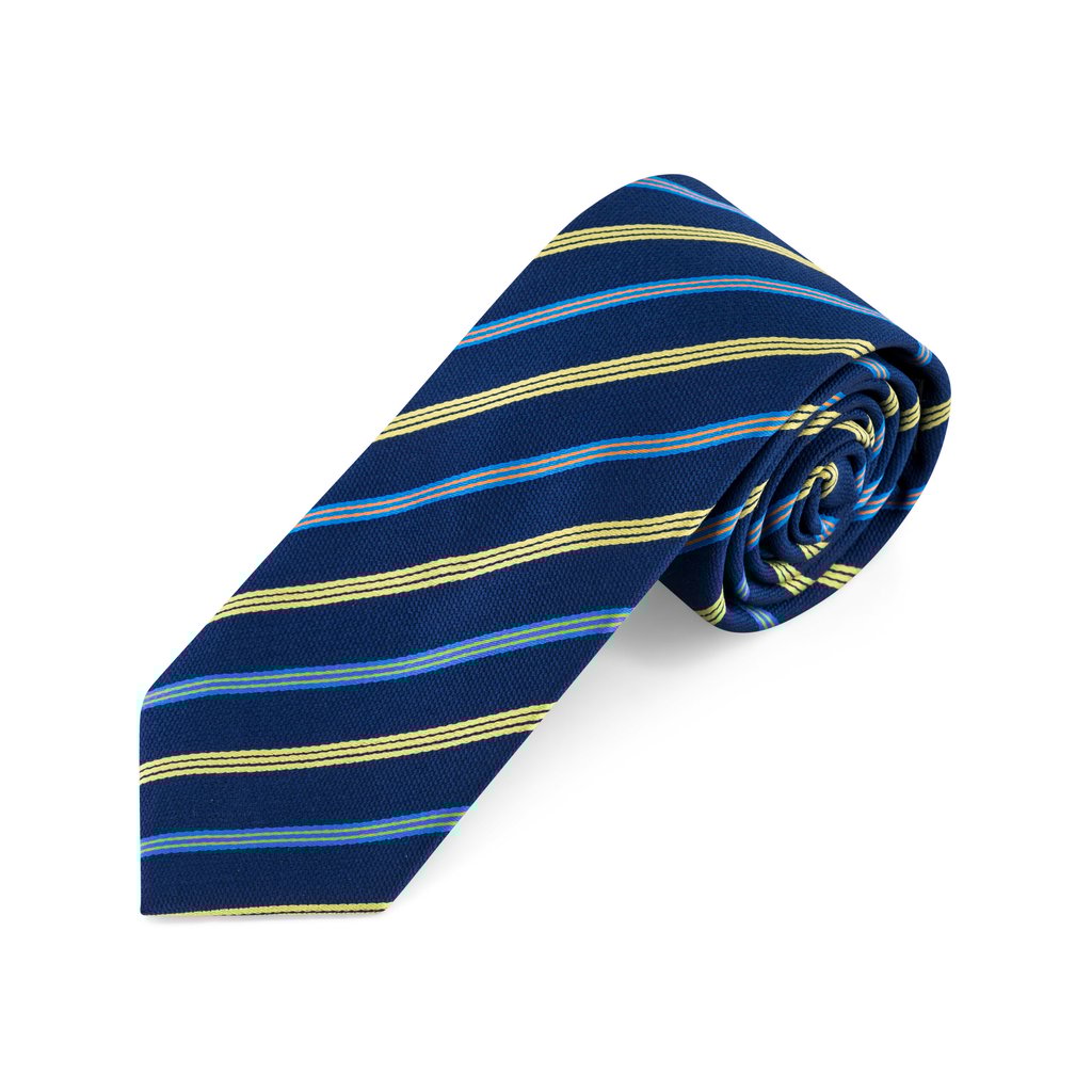 Enhance your formal repertoire with the Navy Silk with Yellow Striped Tie, a sophisticated accessory that blends tradition with a burst of colour. Expertly crafted from 100% premium silk, this tie features a deep navy foundation accented by dynamic stripes in vibrant yellow, soft light blue, and bold orange, creating a striking yet harmonious design. Its 7.5 cm width offers a classic silhouette that pairs effortlessly with any suit, while the 150 cm length ensures versatility across a range of knotting options. Ideal for distinguished occasions or to elevate your everyday elegance, this tie showcases impeccable craftsmanship and a confident sense of style. Dry clean only to preserve its vivid stripes and luxurious finish, making it a standout addition to the modern gentleman’s wardrobe.