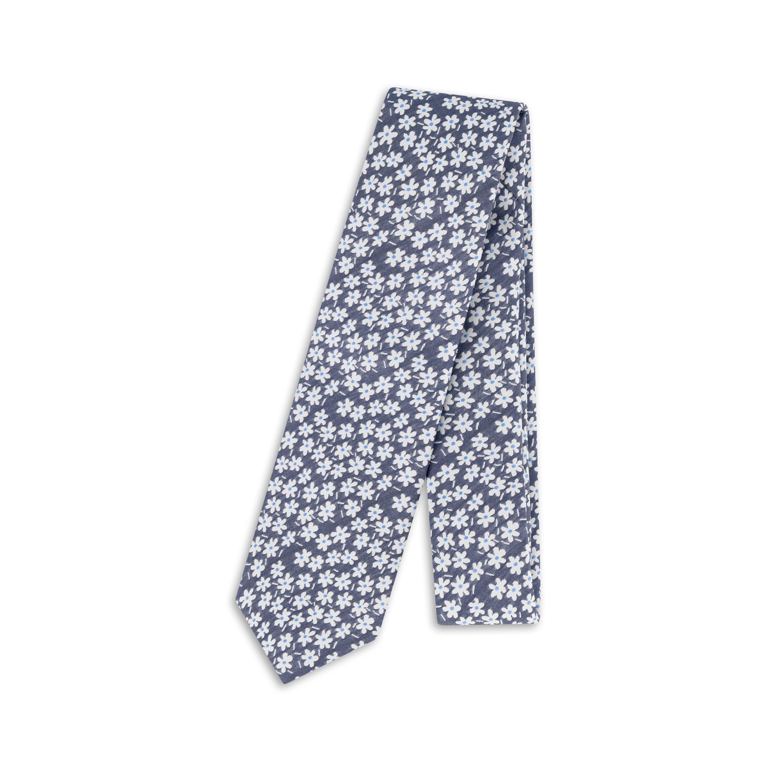 Infuse your formal wardrobe with a burst of charm using the Navy Silk Woven White Daisy Tie, a striking blend of boldness and elegance. Crafted from 100% premium silk, this tie features a lively navy foundation adorned with a delicate woven white daisy pattern, creating a playful yet sophisticated contrast. Its 7.5 cm width ensures a timeless silhouette, while the 150 cm length offers versatility for a range of knotting preferences. Perfect for standout occasions or to add a touch of personality to your attire, this tie showcases exceptional craftsmanship and vibrant style. Care for it thoughtfully—do not tumble dry—to maintain its rich colour and silky finish, ensuring it remains a distinctive piece for the discerning gentleman.