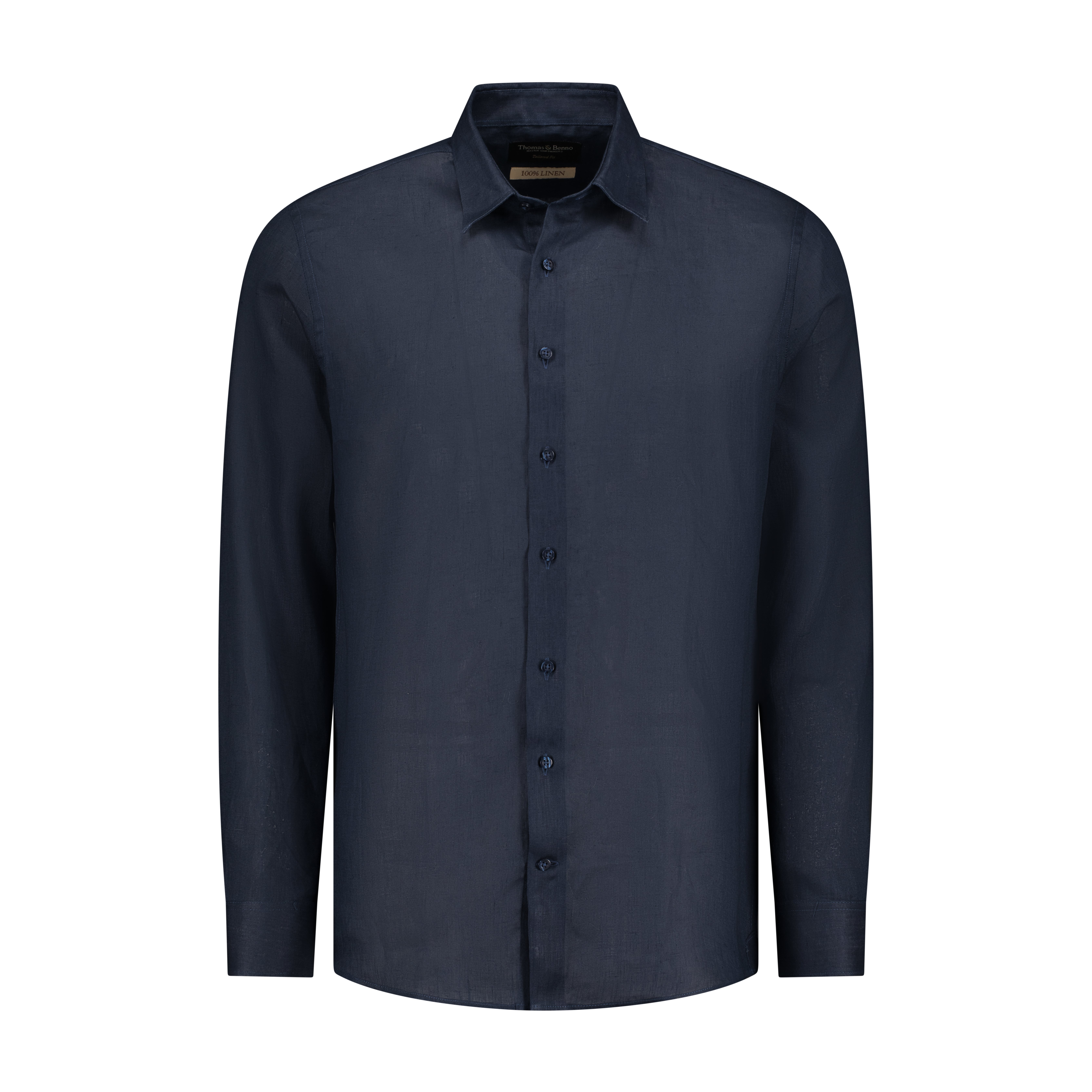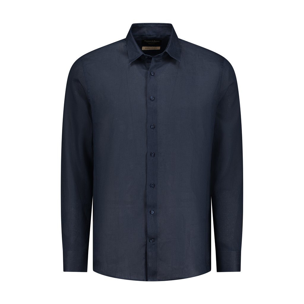 Crafted from breathable 100% pure linen, this Thomas & Benno shirt brings effortless sophistication to warm‑weather dressing. The rich navy shade enhances the natural texture of the linen, offering a refined yet relaxed look suitable for both day and evening wear.
