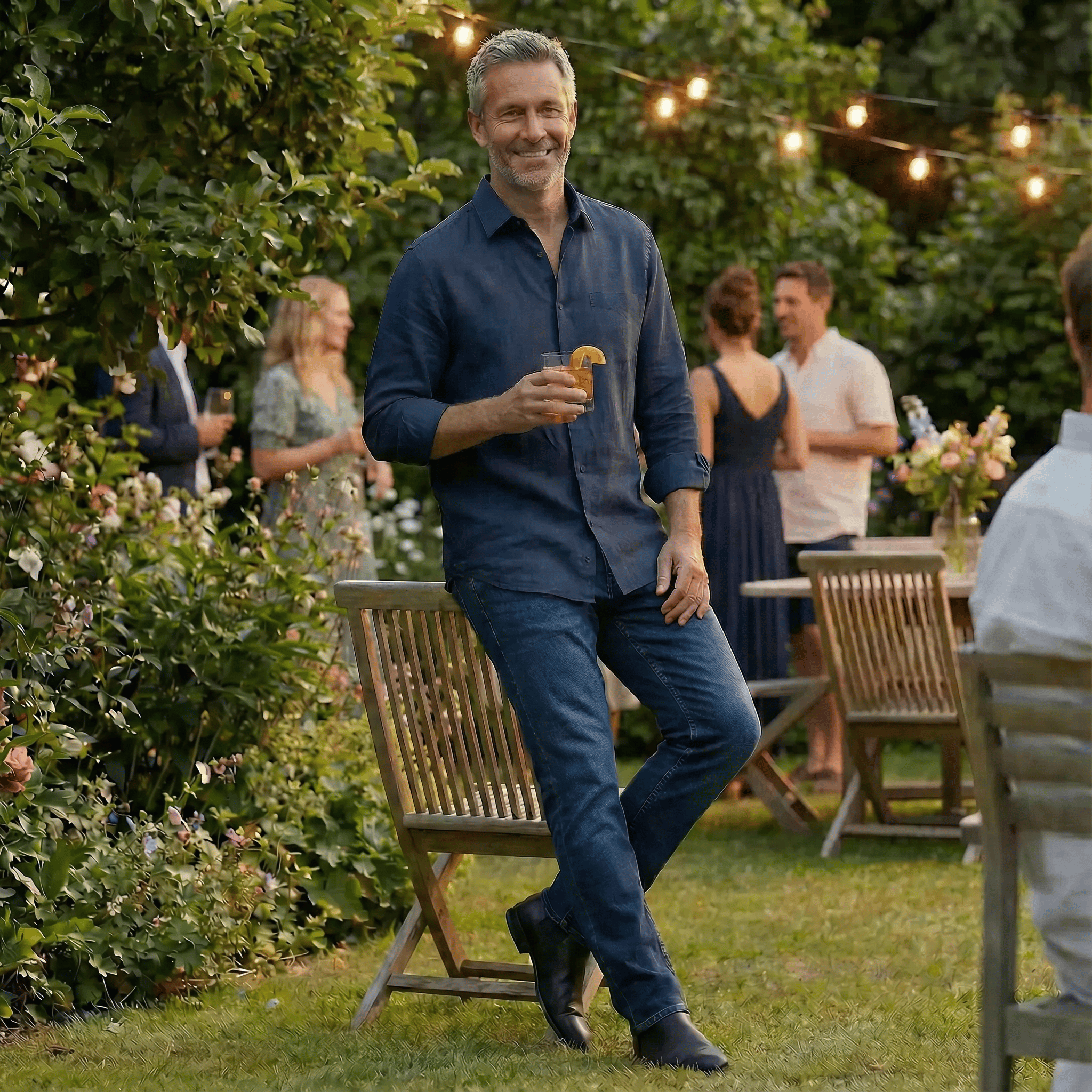 - The deep navy linen provides a subtle, sophisticated evening texture.