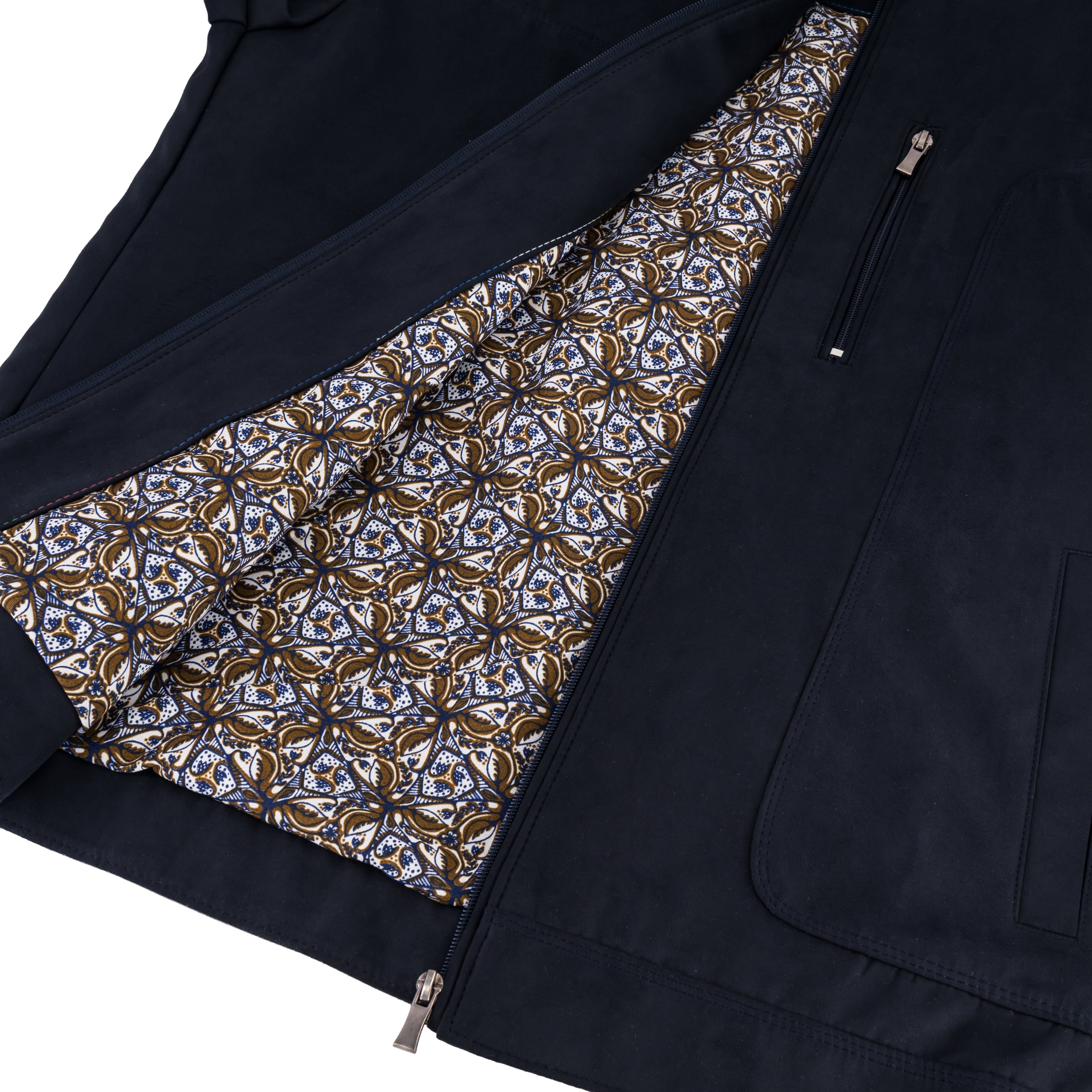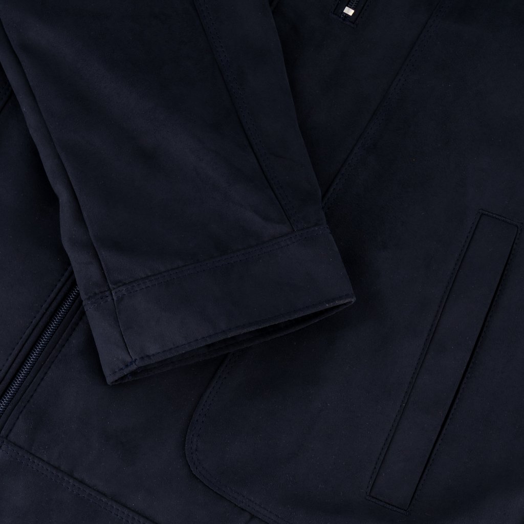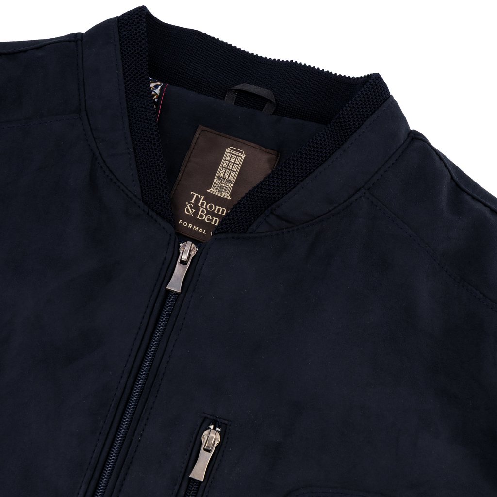 The Thomas & Benno Navy Suede‑Feel Bomber Jacket delivers a perfect blend of refined styling and everyday wearability. Made from a smooth suede‑touch fabric, it offers the elevated look of suede with enhanced durability and ease of care. The interior reveals a sophisticated patterned lining — a subtle detail that distinguishes this jacket as a premium wardrobe piece.