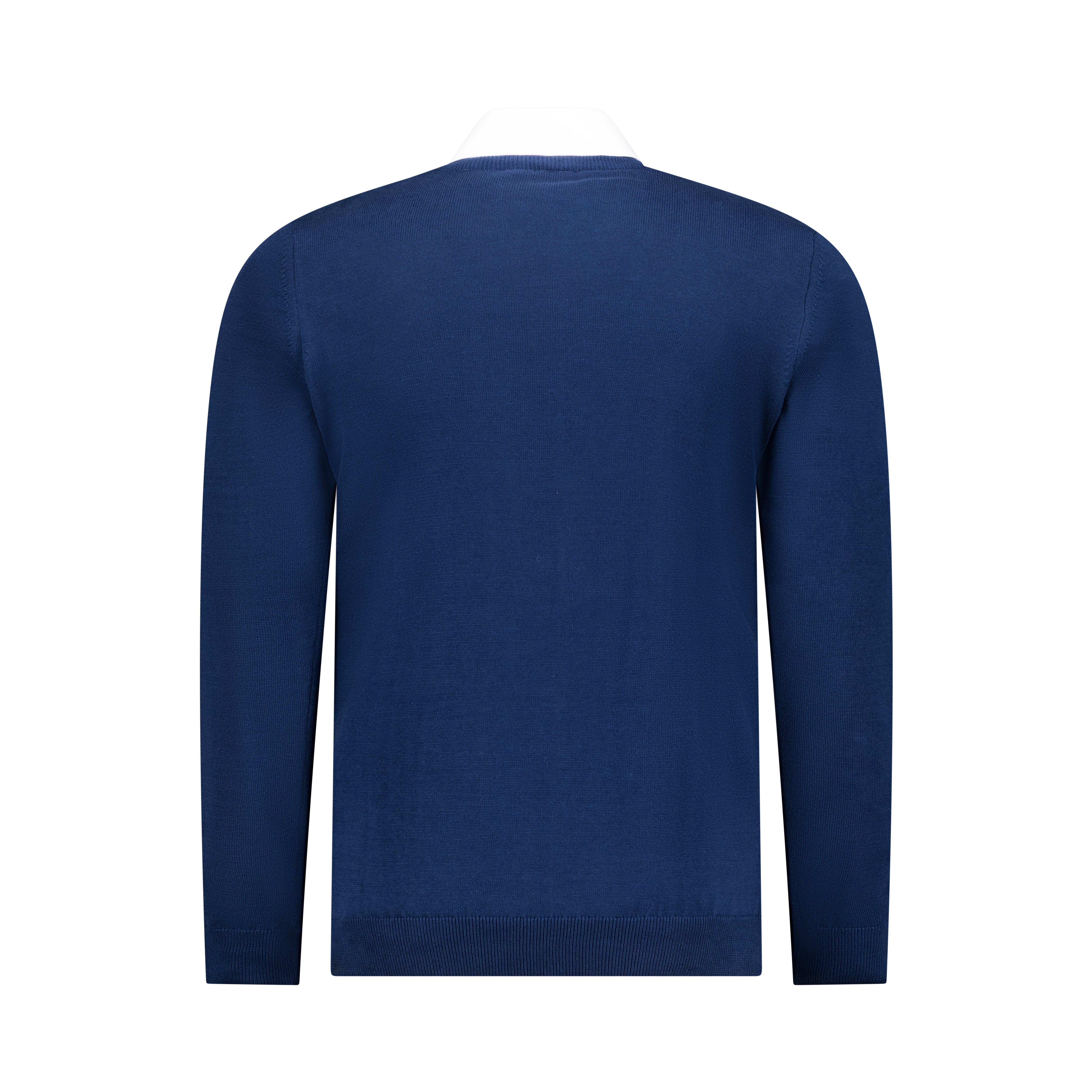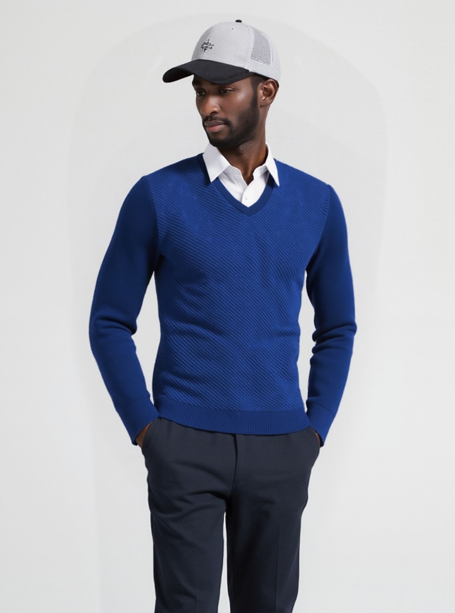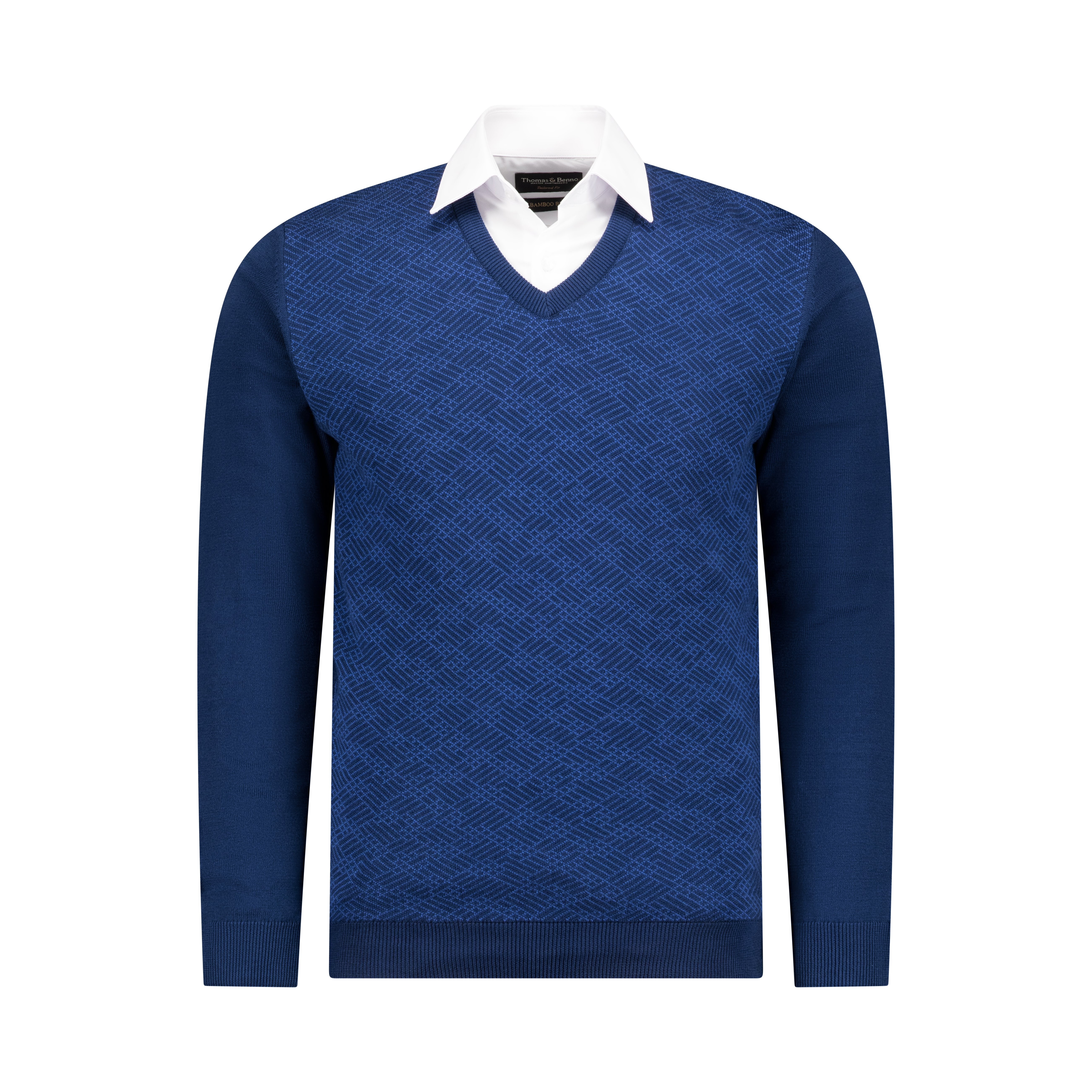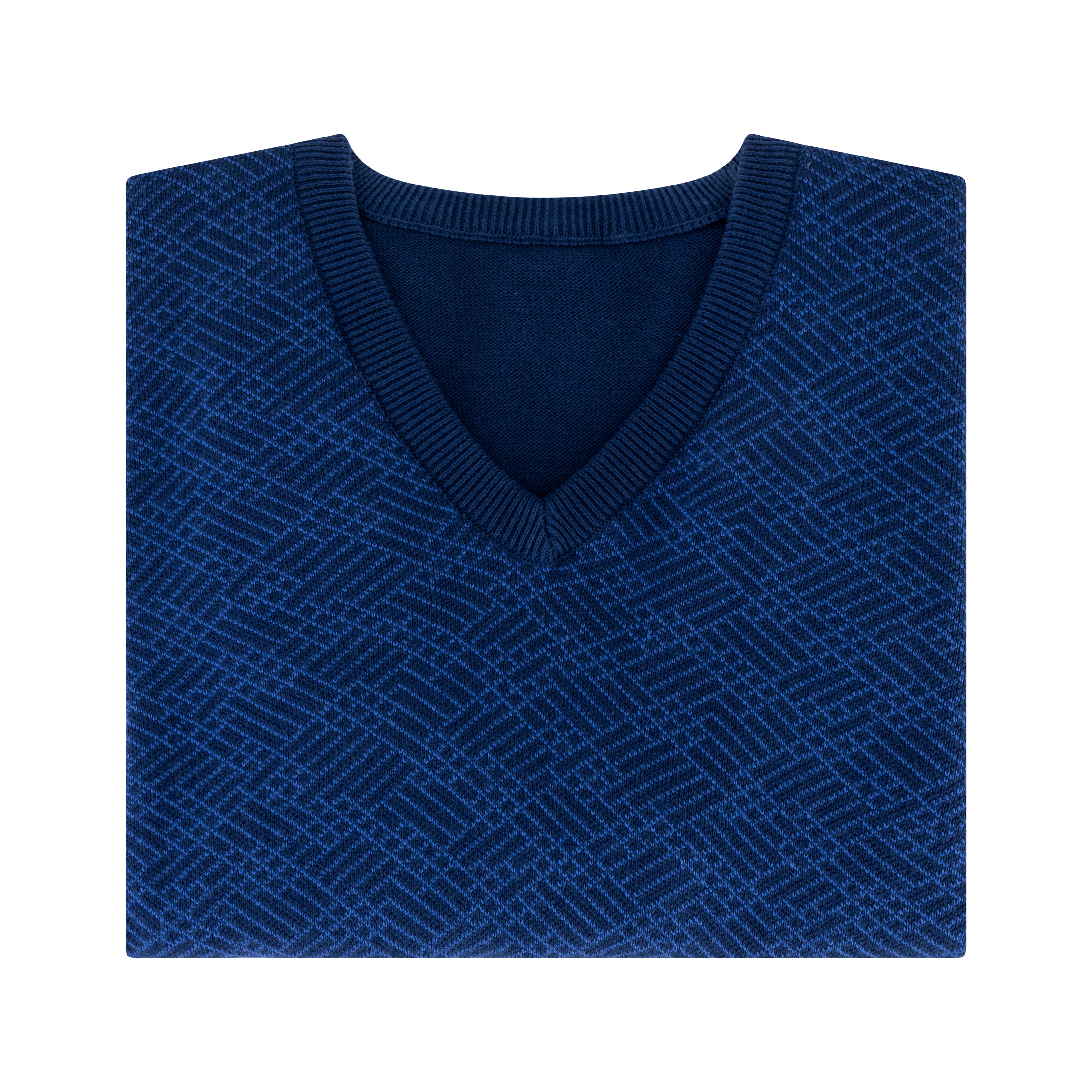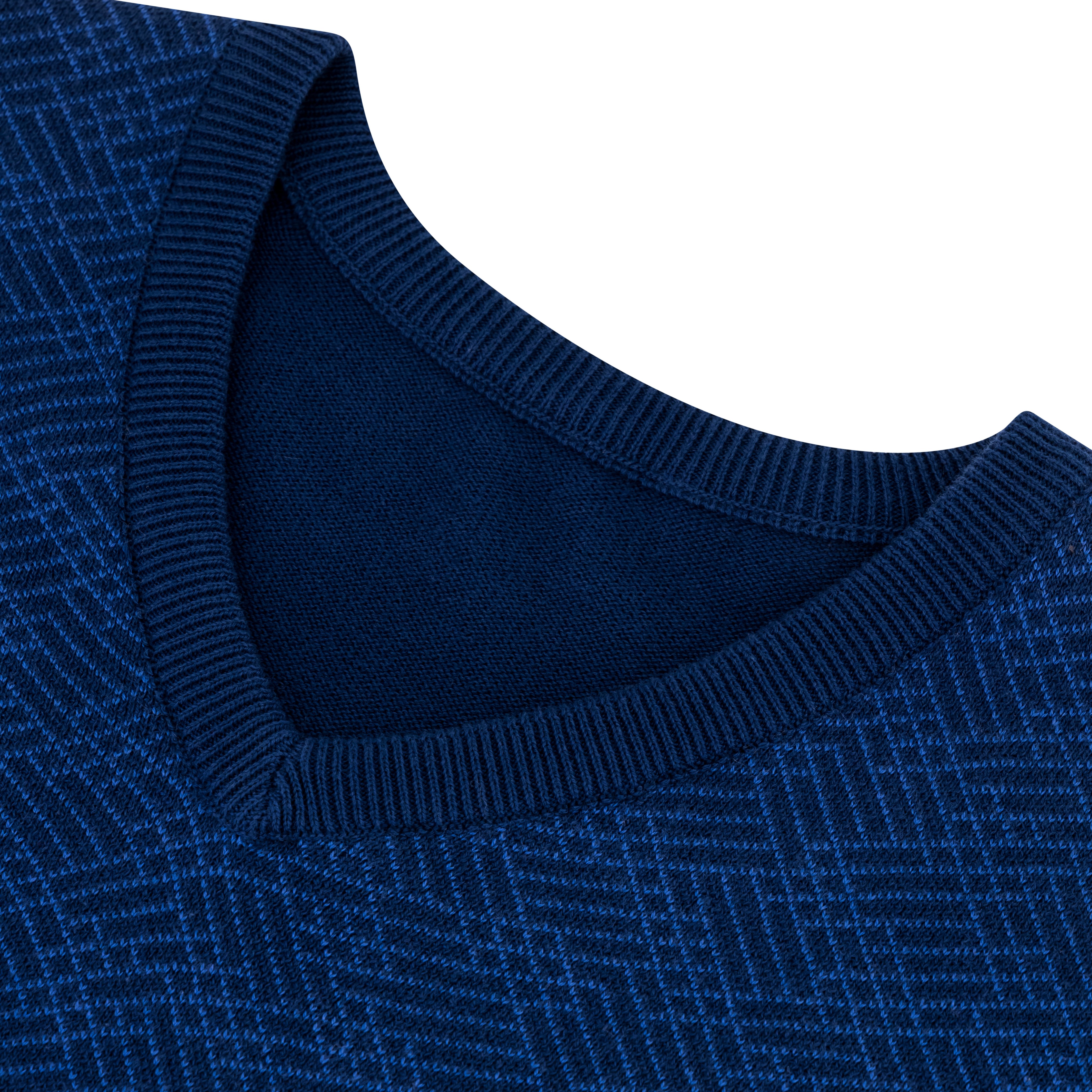 This navy V-neck jersey is crafted from 100% combed cotton, offering a smooth, breathable texture with a deep, classic tone. The front is accented with a royal blue cross-line woven design, adding a refined contrast and visual depth. Finished with a ribbed neckline and lightweight knit, it’s a versatile piece that transitions seamlessly between smart-casual and elevated everyday wear. For best care, machine wash at 30°C and avoid tumble drying to maintain its shape and finish.