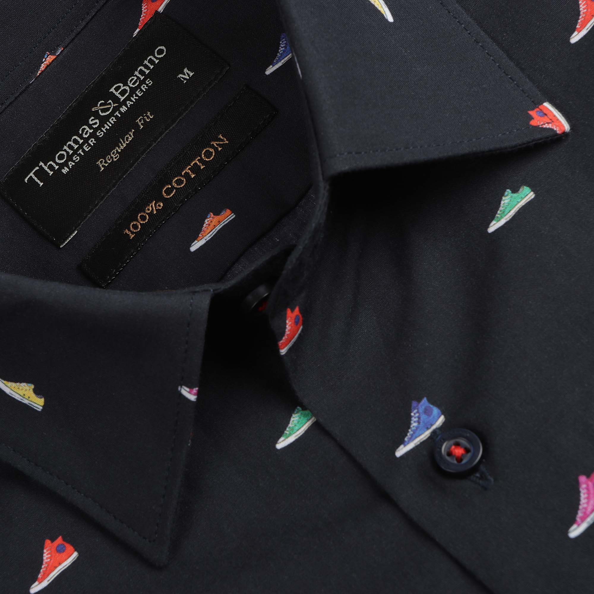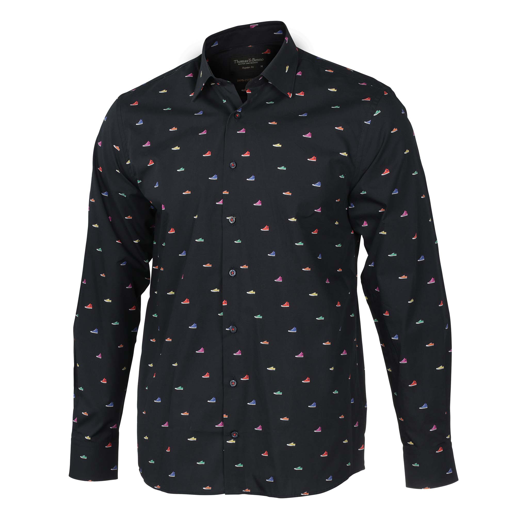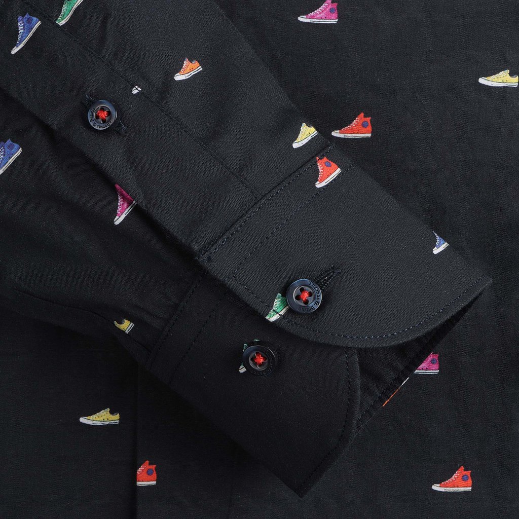 A fun and unique dress shirt featuring a playful sneaker print on a navy background. Crafted from 100% cotton with a regular fit, semi-cutaway collar, and single cuffs, this shirt adds a touch of casual style to any outfit.