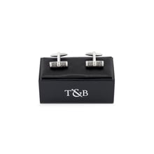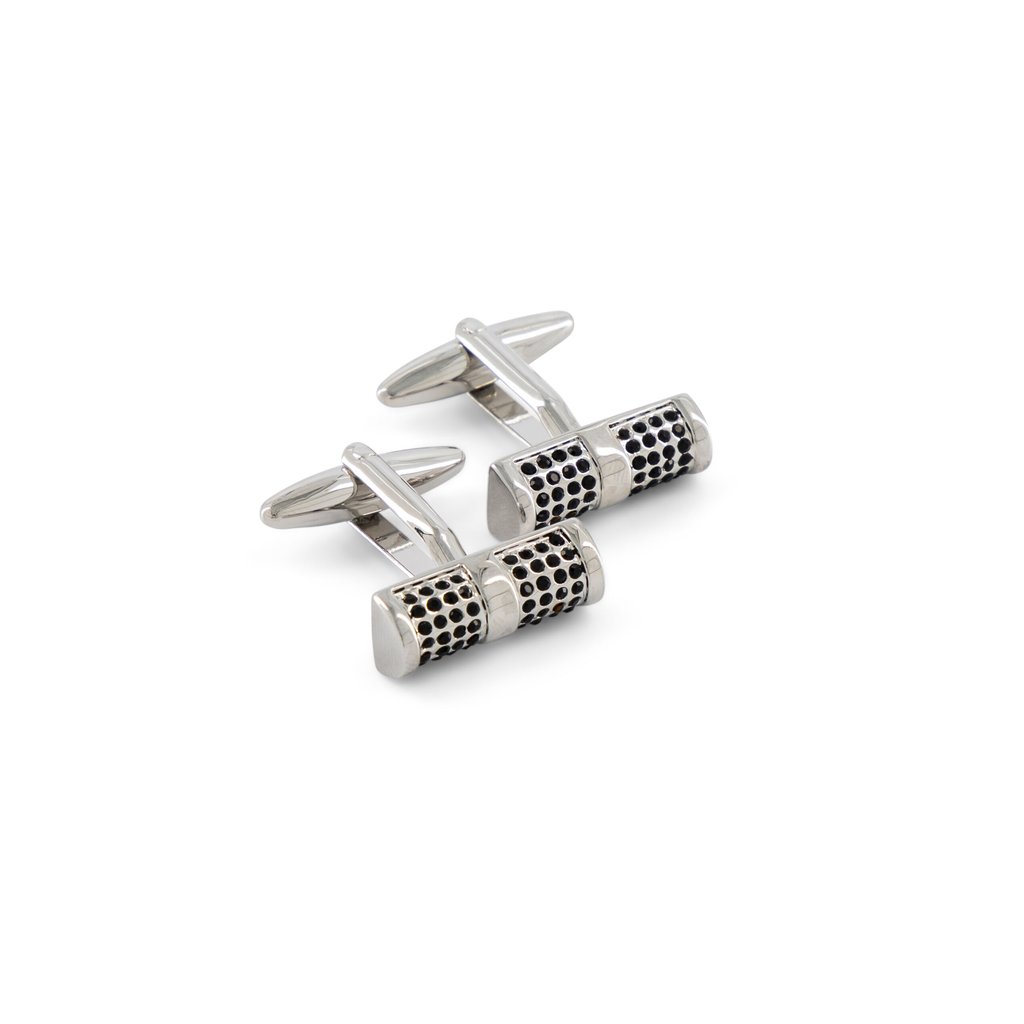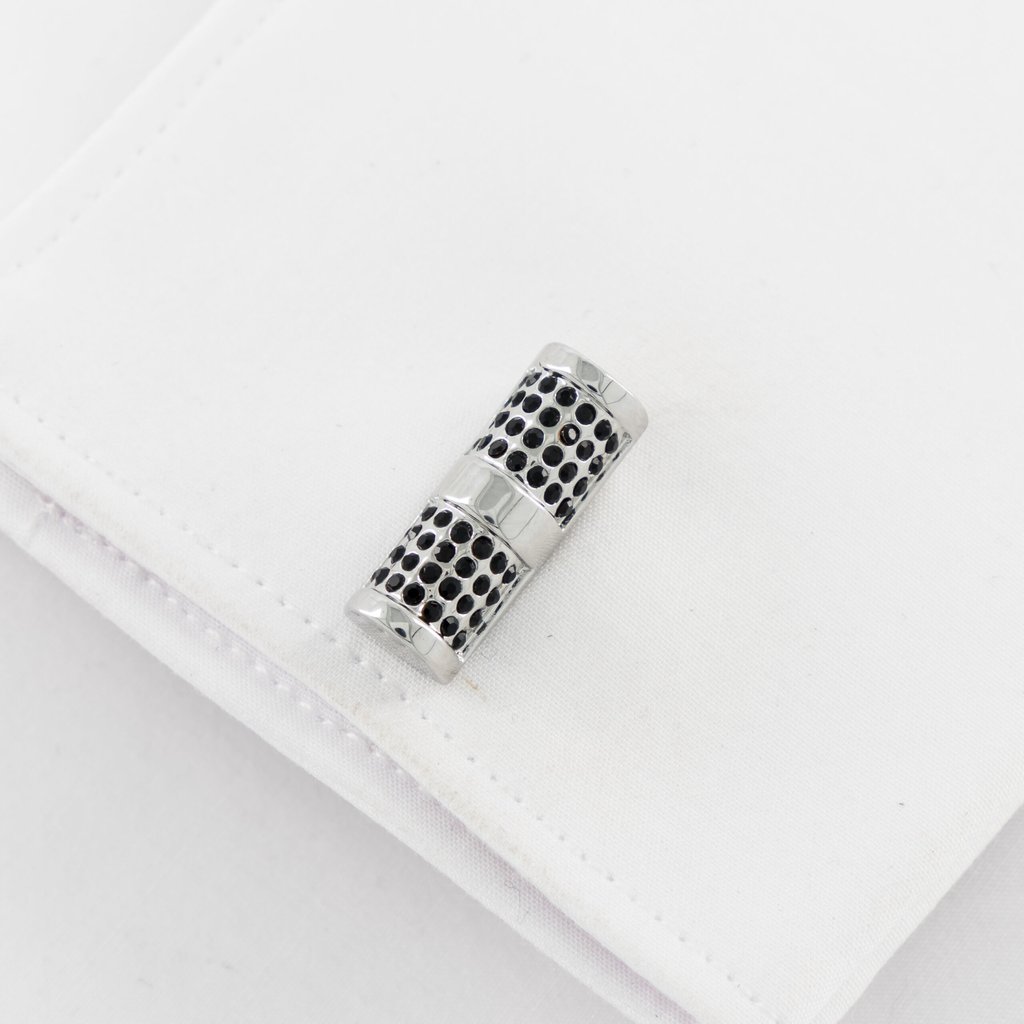 Enhance your formal attire with these exquisite Polished Silver and Black Enamel Dotted Half-Cylinder Cufflinks. Meticulously crafted from rhodium-plated alloy, these cufflinks feature a sleek, polished silver finish adorned with refined black enamel dots, blending contemporary style with timeless sophistication. The sturdy bullet clips ensure a secure fit, making them perfect for any upscale occasion. Presented in a luxurious gift box, these cufflinks are a distinguished addition to any gentleman’s wardrobe, though they are not suitable for engraving.