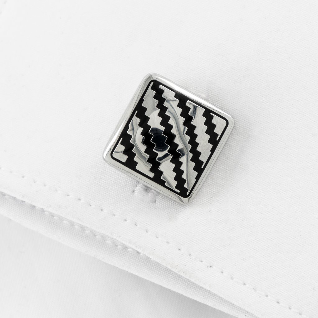 Add a touch of style to your formal wear with our polished silver finish square cufflinks. The unique white and black zig zag pattern on the face adds a modern and contemporary touch, making these cufflinks stand out. Crafted from high-quality rhodium-plated alloy, they ensure durability and resistance to tarnish, maintaining their luxurious shine. The sturdy clips provide a secure and comfortable fit, making them perfect for formal events, business meetings, or everyday wear.