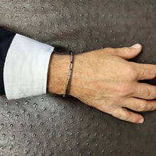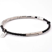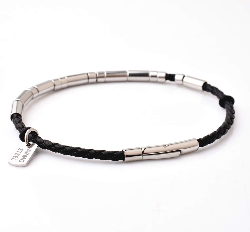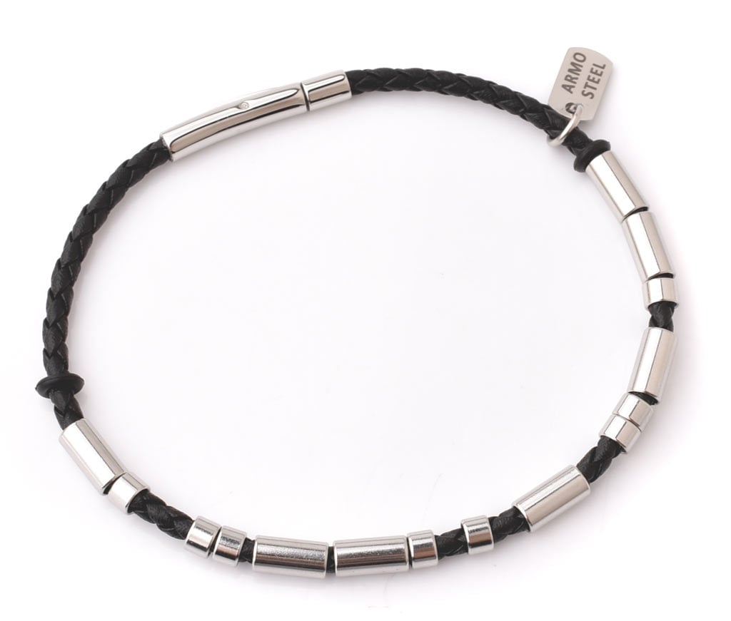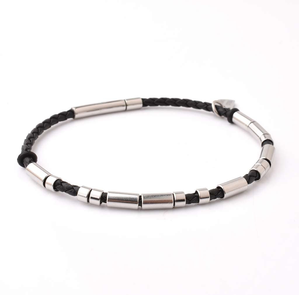 This bracelet combines classic style with modern materials. The genuine leather band, measuring 3mm in diameter, is accented by polished stainless steel cylinders for a sleek, contemporary finish. At 210mm in length, it’s designed to fit most wrists comfortably. The secure clasp ensures easy wear and removal, making it the perfect accessory for both formal and casual outfits.