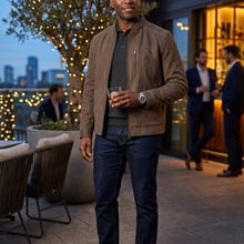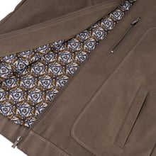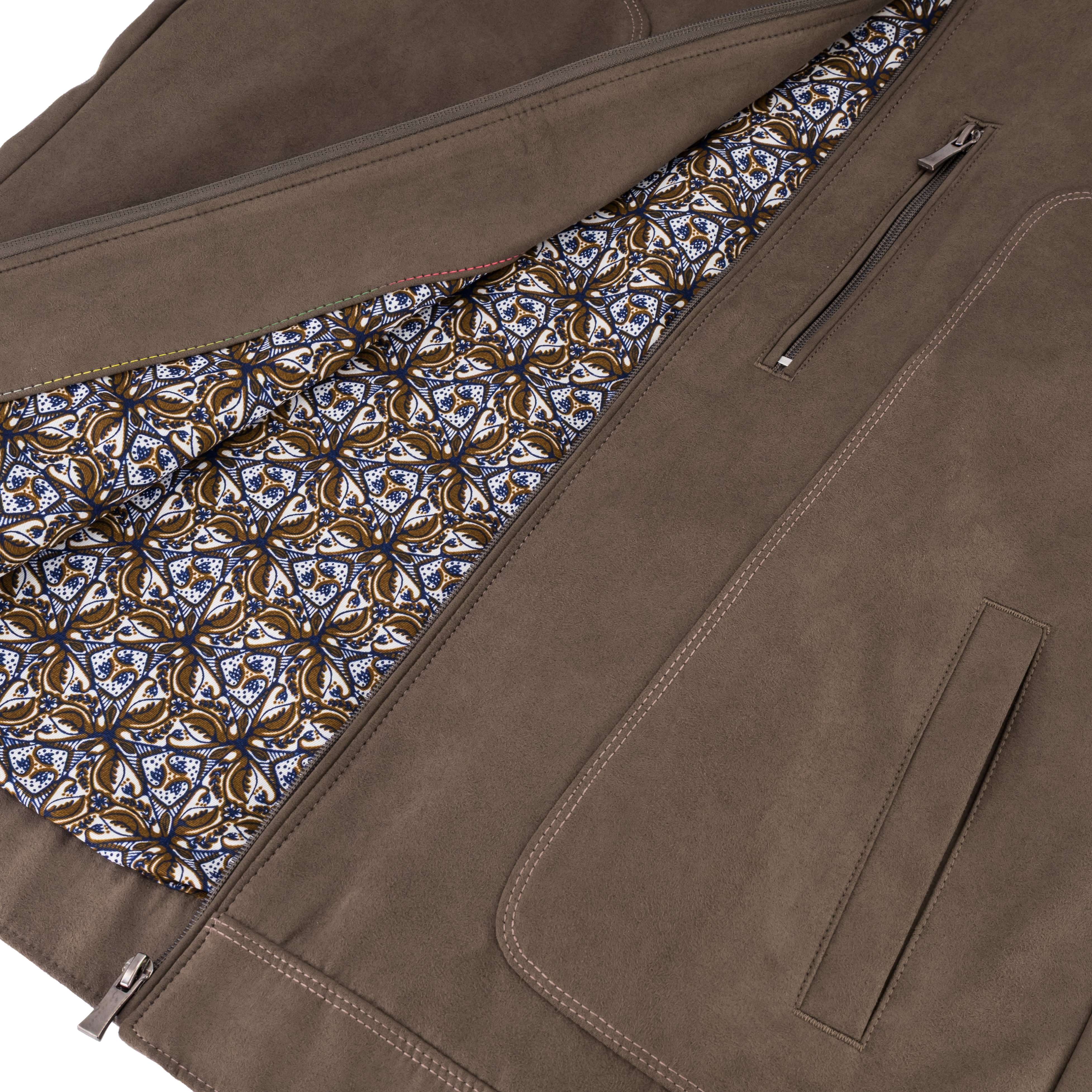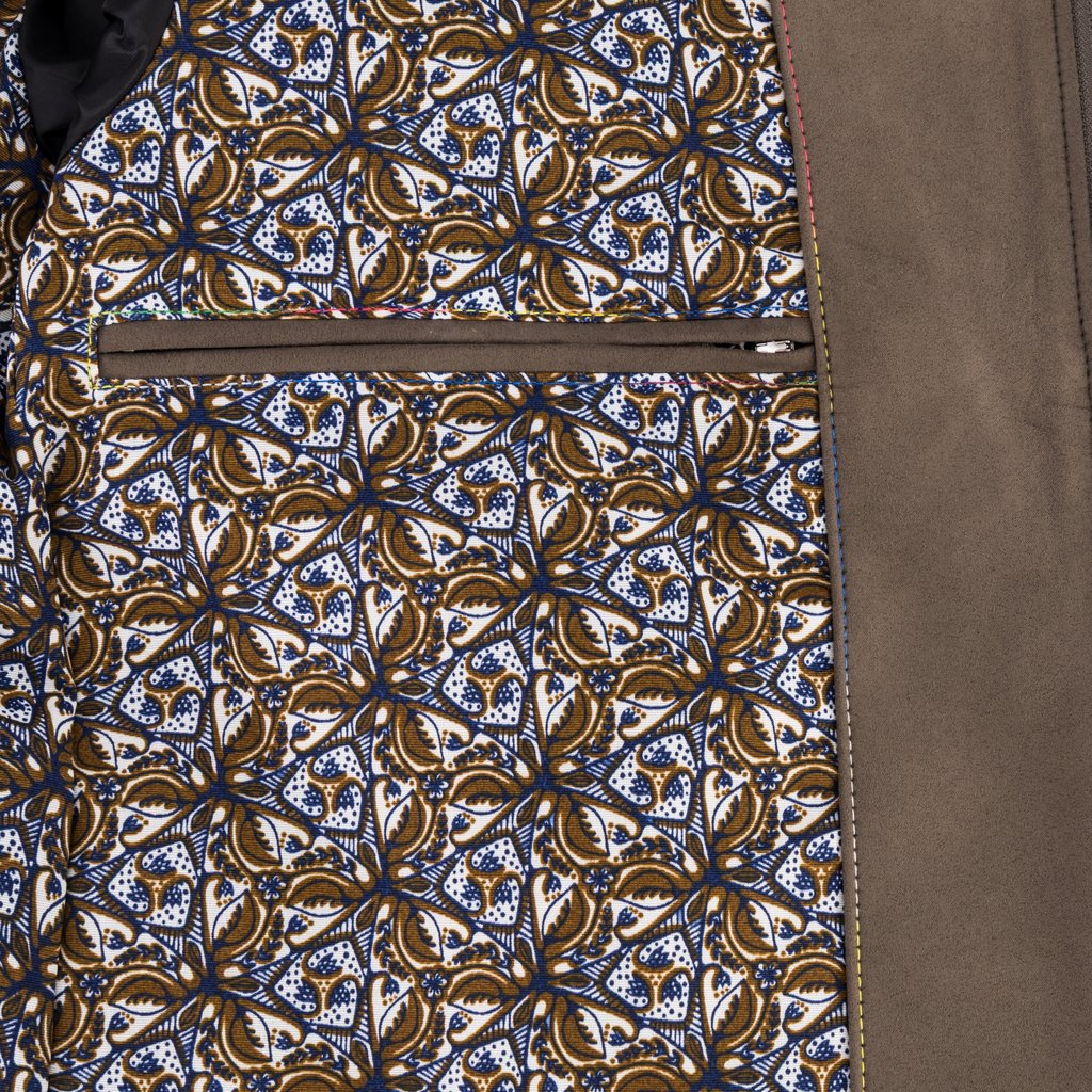 - Premium patterned inner lining in an intricate gold, navy, and white geometric motif
