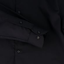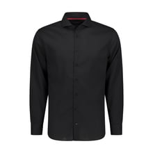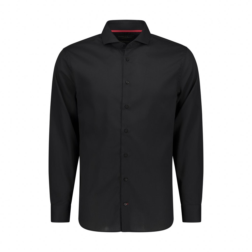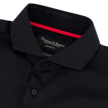 This unique black dress shirt is designed with a textured surface interest and distinctive red piping detail, making it a standout choice for any formal occasion. Crafted from 100% pure cotton, it offers exceptional comfort and breathability. The shirt features a full cut-away collar, providing ample space for a tie knot and adding a touch of sophistication. The single cuffs create a sleek contemporary look.