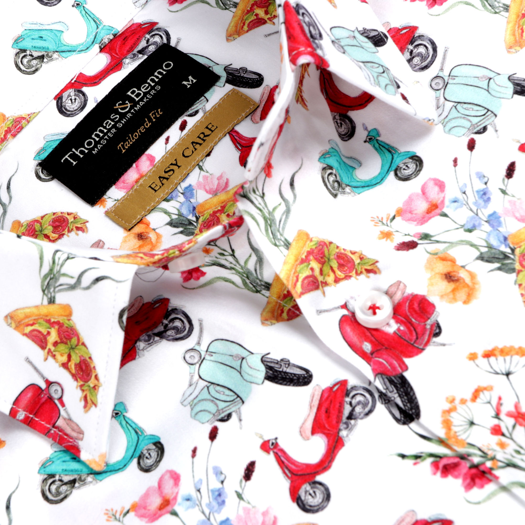 Sleek and stylish, our Vespa printed shirt features a semi cut away collar and single cuffs, and is a must-have for any modern gentleman’s wardrobe. Made from 100% cotton and treated for easy care and easy iron. The tailored cut ensures a sleek fitting look, and with it’s bold print design it’s sure to turn heads. Perfect for dressing up or down, this shirt is a versatile addition to your wardrobe.