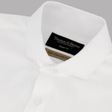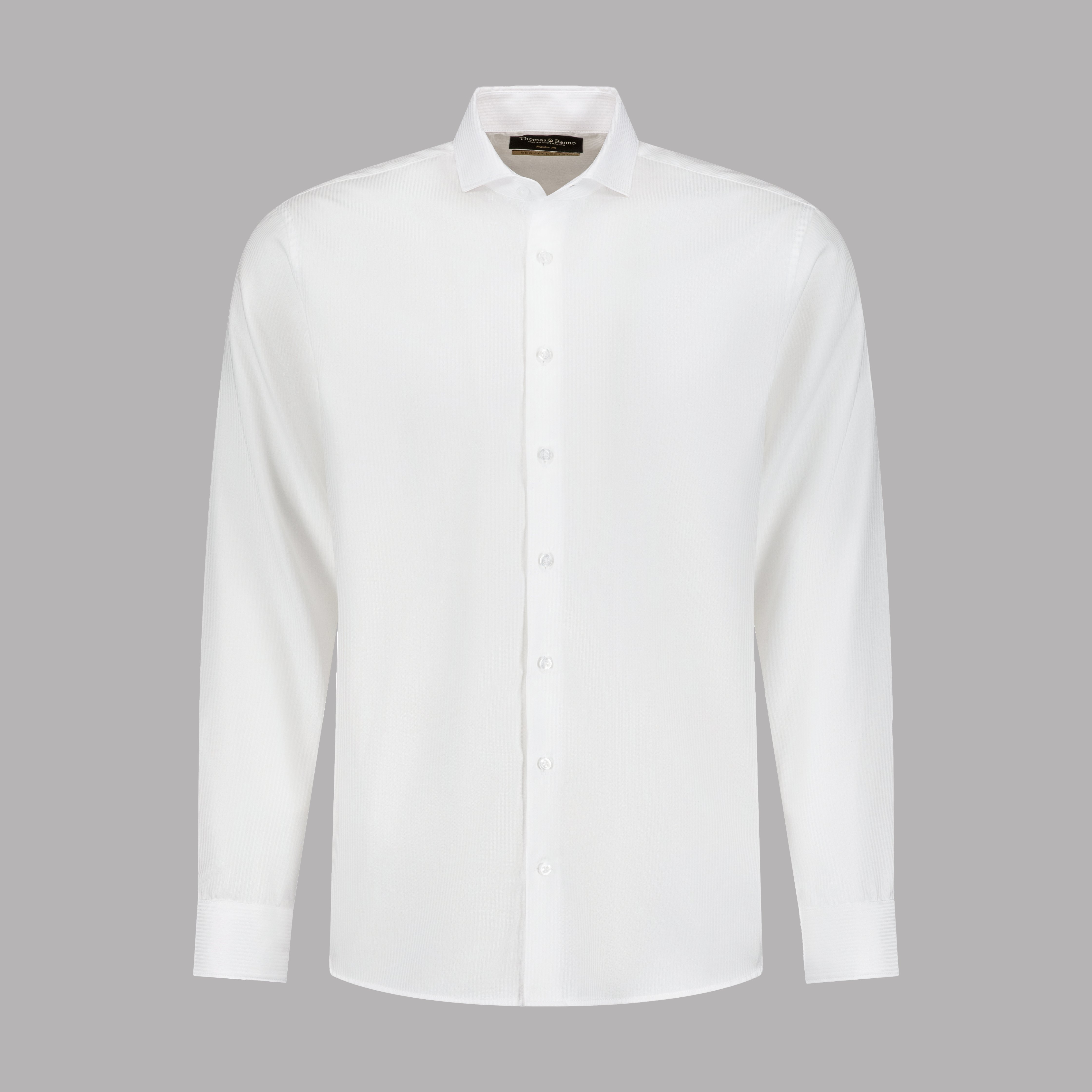 The CEO Collection by Thomas and Benno represents the pinnacle of refined tailoring. This white dress shirt is crafted from premium 140/2 small herringbone weave cotton, offering a sophisticated texture and exceptional comfort. The regular fit provides timeless elegance, while the full cutaway collar and single cuffs ensure versatility for any occasion. Removable collar stays allow you to maintain a sharp look throughout the day. An essential addition to any executive wardrobe.