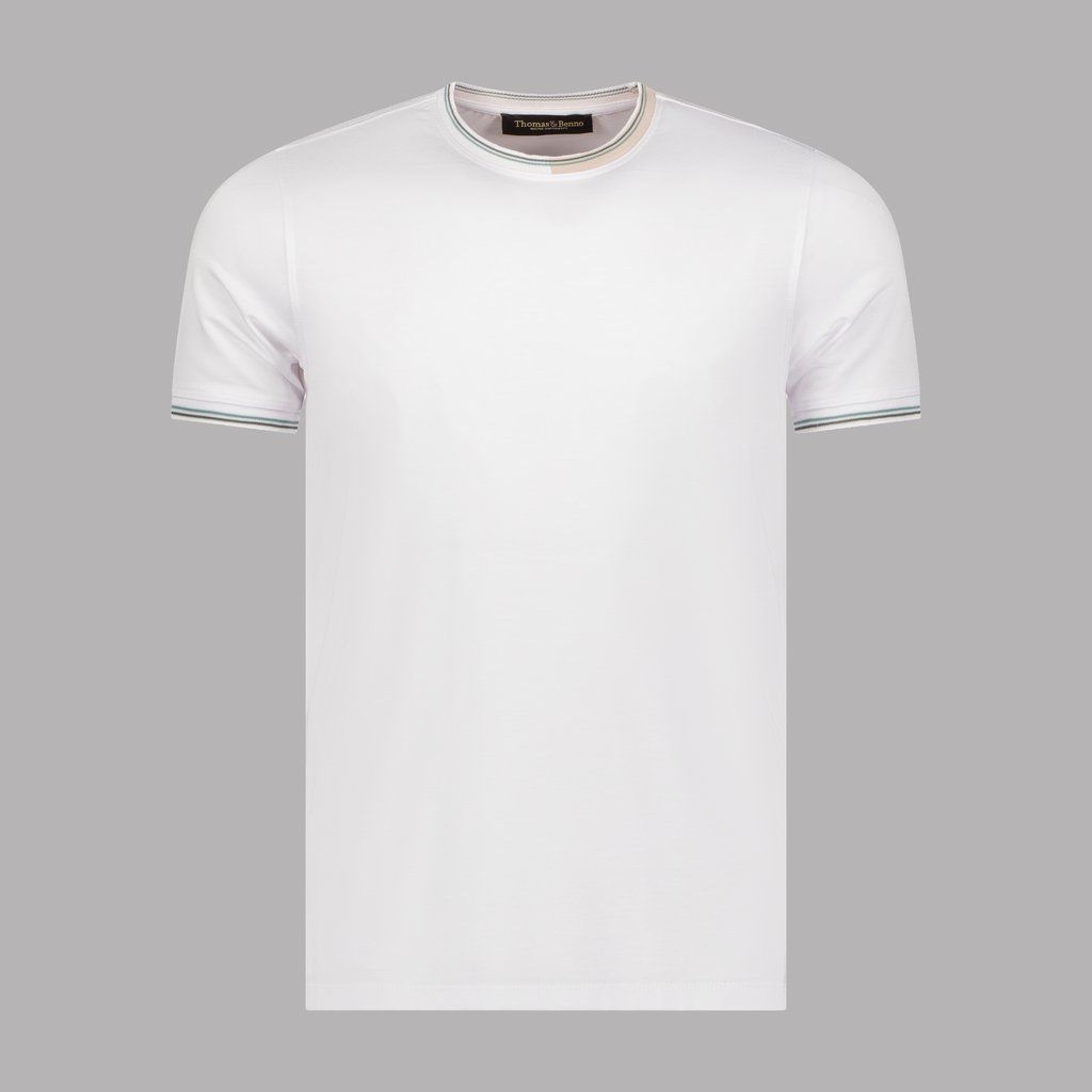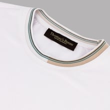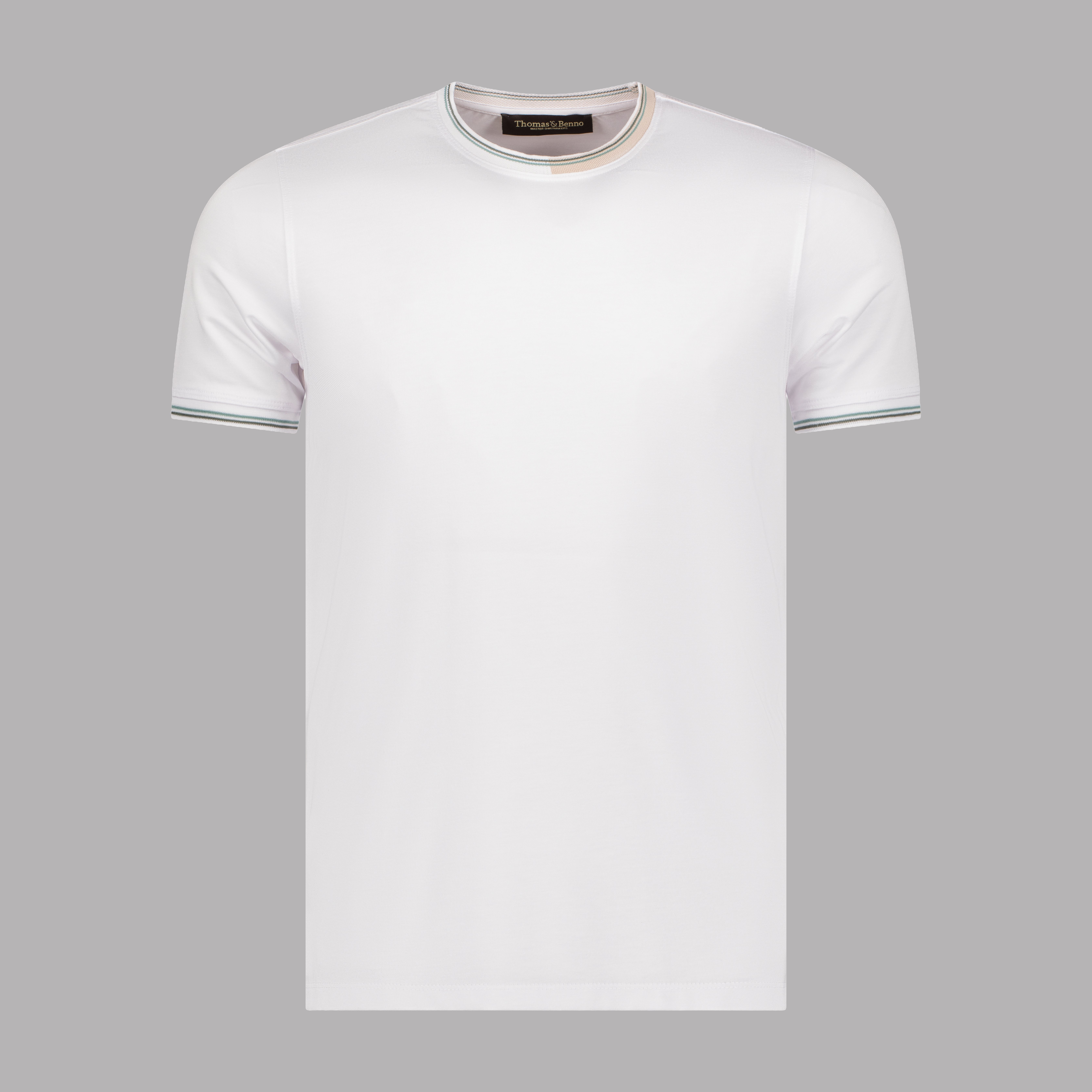 - Contrast‑striped ribbed neckline featuring sage, white, and sand tones